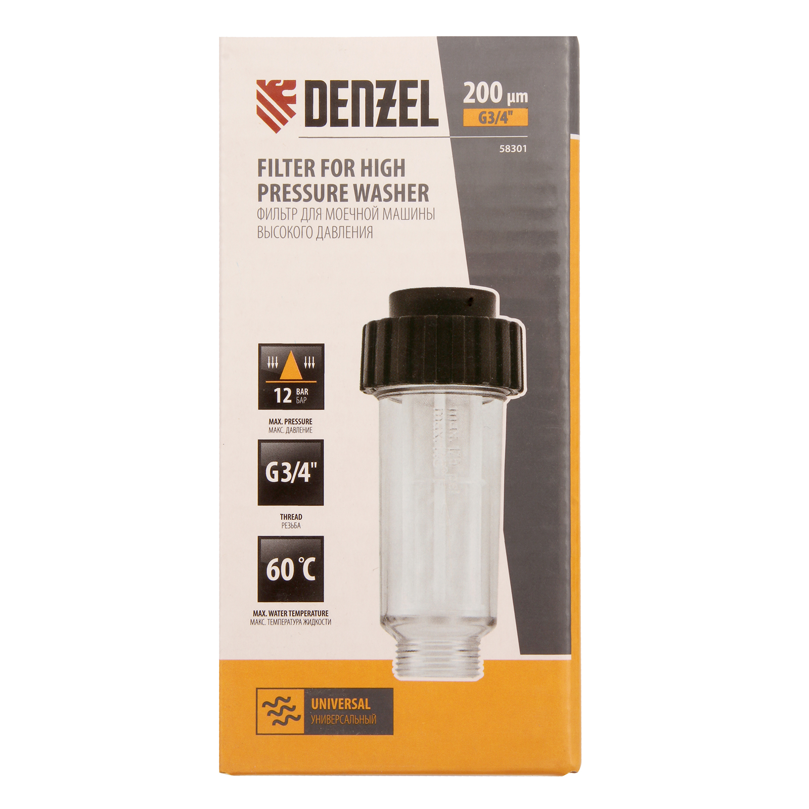 Универсальный фильтр Denzel 58301 используется для очистки воды и защиты от засорения в моечных машинах высокого давления. Он устанавливается на патрубок с соединением G3/4 дюйма на мойках марки Denzel.