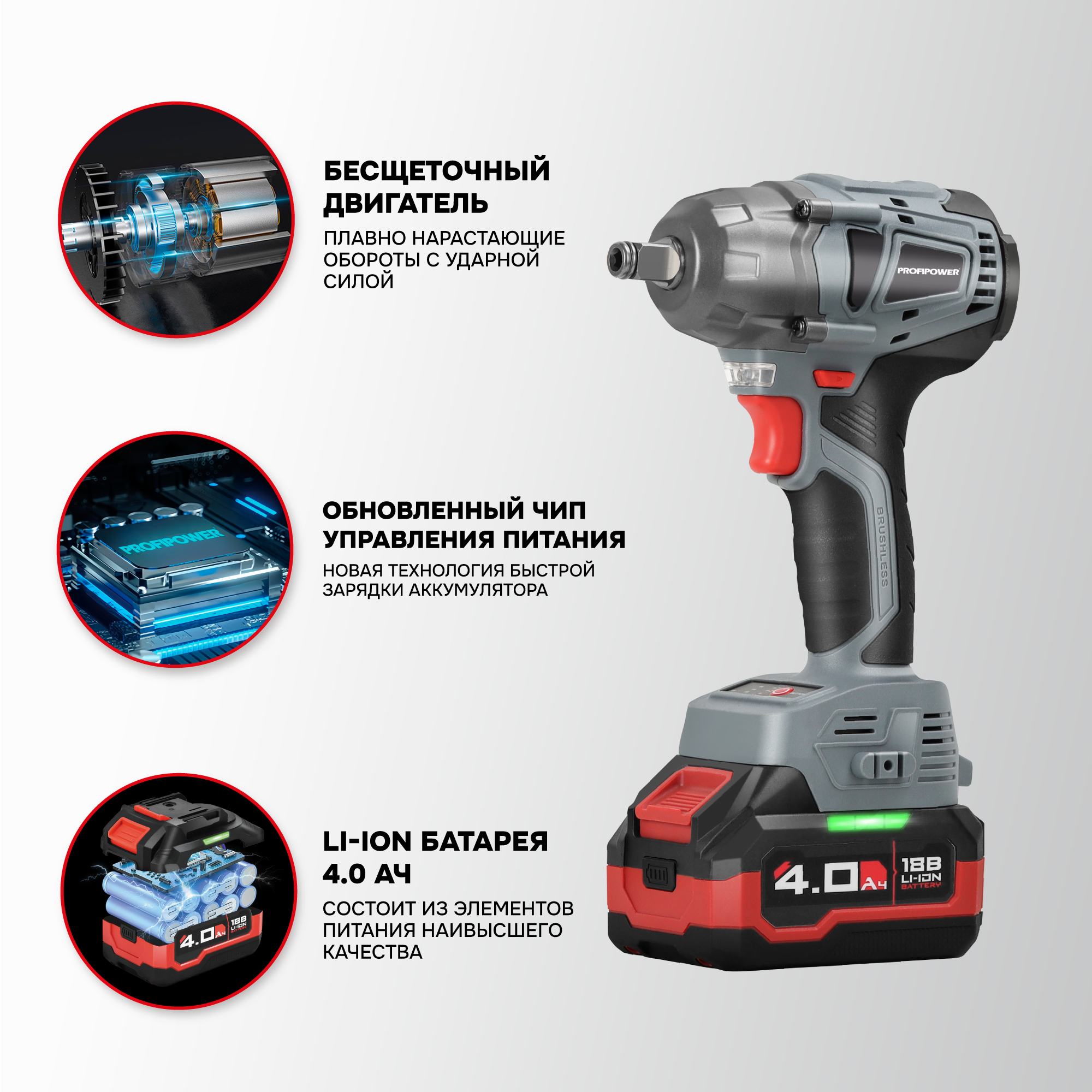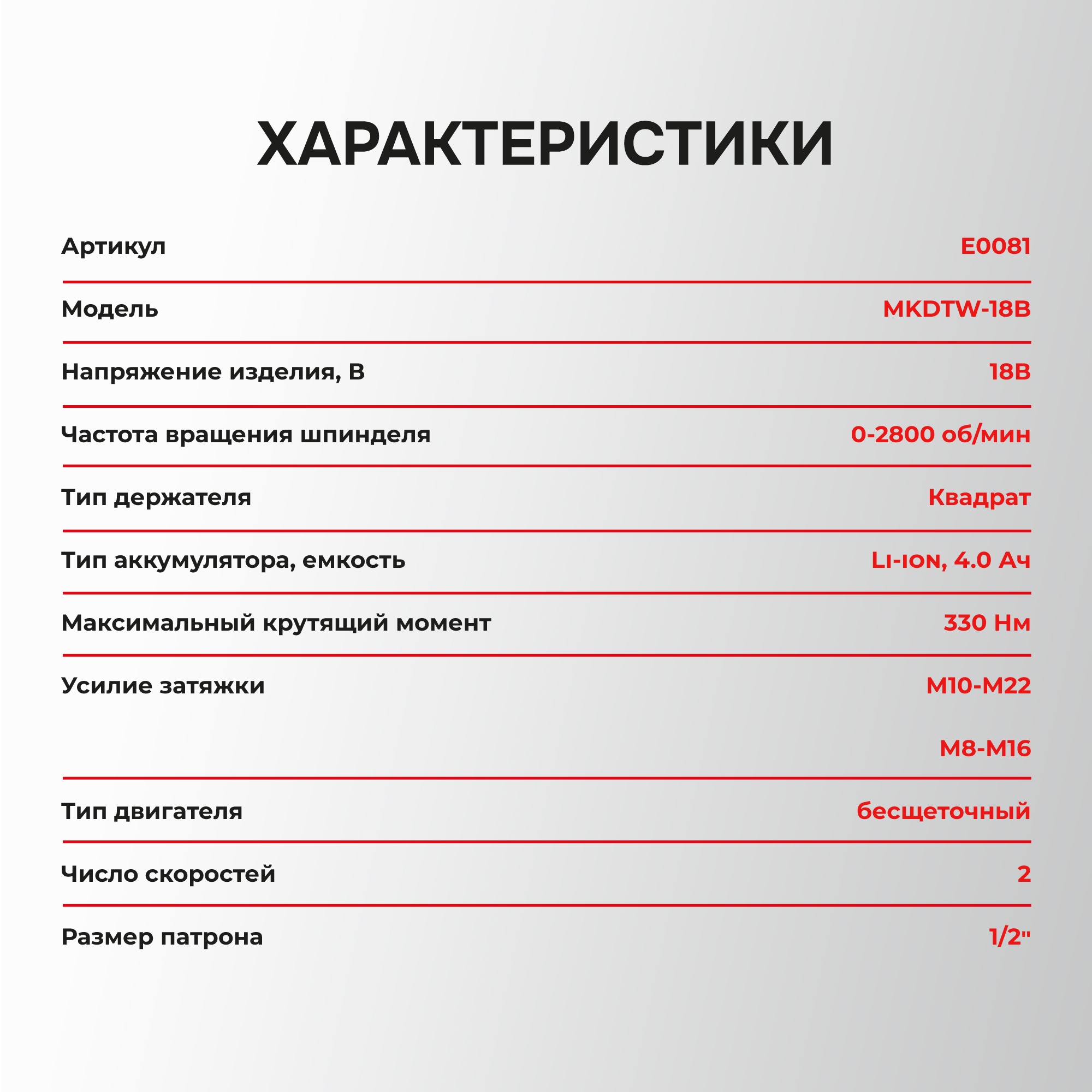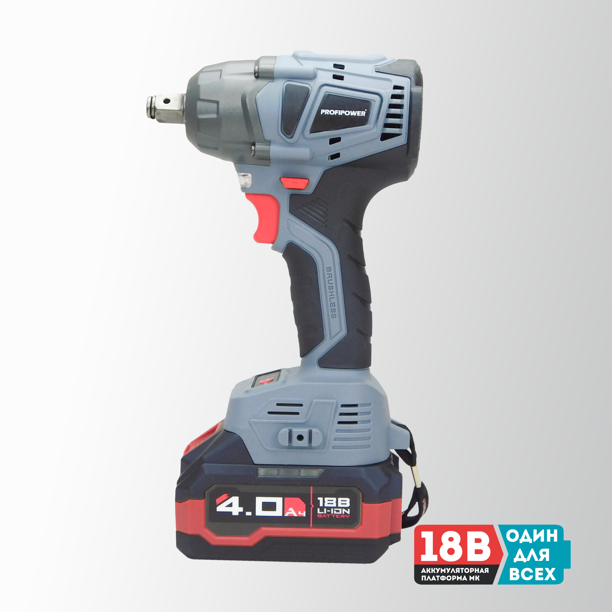 Аккумуляторный ударный гайковерт 18 вольт отличается универсальной работой как с мелким, так и с крупным крепежом без дополнительных переходников и адаптеров. Модель подходит для завинчивания и откручивания любого крепежа, колес, гаек и болтов. Достаточная мощность 330 Нм предусмотрена как для деликатного обращения с легкими элементами, так и для работы в тяжелых условиях. Особенности и преимущества: - Бесщеточный двигатель – компактен, более стабильные рабочие параметры, не изнашивается и прост в обслуживании. - Встроенный тангенциальный ударный механизм автоматически подключается в случае нагрузки на вал и помогает использовать высокий крутящий момент при одновременно низкой отдаче на руку. Это помогает справиться с прочно сидящем крепежом или достаточно твердым материалом. - Наличие двух режимов закручивания с различной частотой ударов и скоростью вращения позволяет правильно выбрать параметры инструмента в зависимости от прочности соединений. Электронная регулировка скорости нажатием на триггер облегчает выполнение операции. - Подключаемый импульсный режим выкручивания прочно сидящих болтов, а также дополнительный режим откручивания с защитой от срыва настраивает инструмент под конкретную задачу для наилучших результатов работы и безопасной эксплуатации. - Электронный бесконтактный запуск двигателя уменьшает нагрев, не изнашивает детали и обеспечивает максимально эффективную работу. Защита от перегрузок автоматически отключит инструмент, чтобы предохранить аккумулятор от перегрева и быстрого разряда. - Эргономичный полимерный корпус с резиновыми демпферами обеспечивает превосходный контроль инструмента и его безопасную эксплуатацию. Держатель- квадратный комбинированный сокет 1/2" со стержневой фиксацией и гнездо 1/4" (6,35мм) для бит значительно расширяет область применения и позволяет быстро и легко заменять оснастку. - Металлический корпус редуктора защищает детали от повреждения и перегрева. - Яркая светодиодная подсветка рабочей области облегчает выполнение операций в затемненных местах. - Единая аккумуляторная платформа серии MK подходит для всех типов электроинструментов и садовой техники этой линейки. Аккумуляторы доступны в различных размерах и вариантах ёмкости. Они взаимозаменяемые и имеют одинаковый разъём. - Аккумулятор Li-Ion характеризуются отсутствием саморазряда и эффекта памяти. Его можно заряжать в любое время. Интегрированная BMA-система защищает элементы питания от перегрузки и перезаряда, а технология интеллектуального управления энергией экономит заряд и поддерживает энергоподачу на постоянном уровне. Сенсорный индикатор на корпусе показывает состояние заряда. Комплектация: Гайковерт аккумуляторный; Аккумуляторы 4.0 Ач серии МК - 2 шт.; Импульсное зарядное устройство; Ударная головка 1/2"; Руководство по эксплуатации; Кейс.