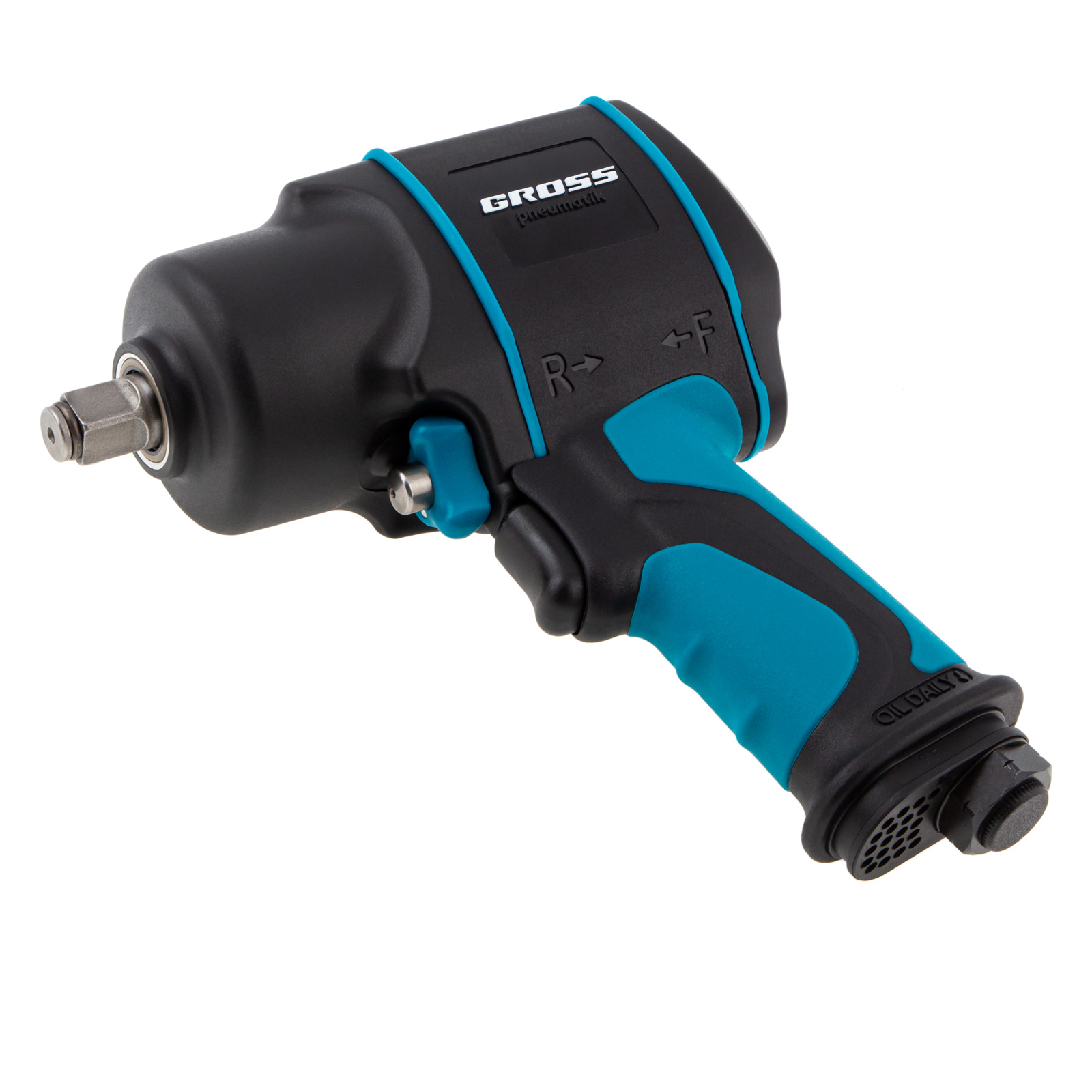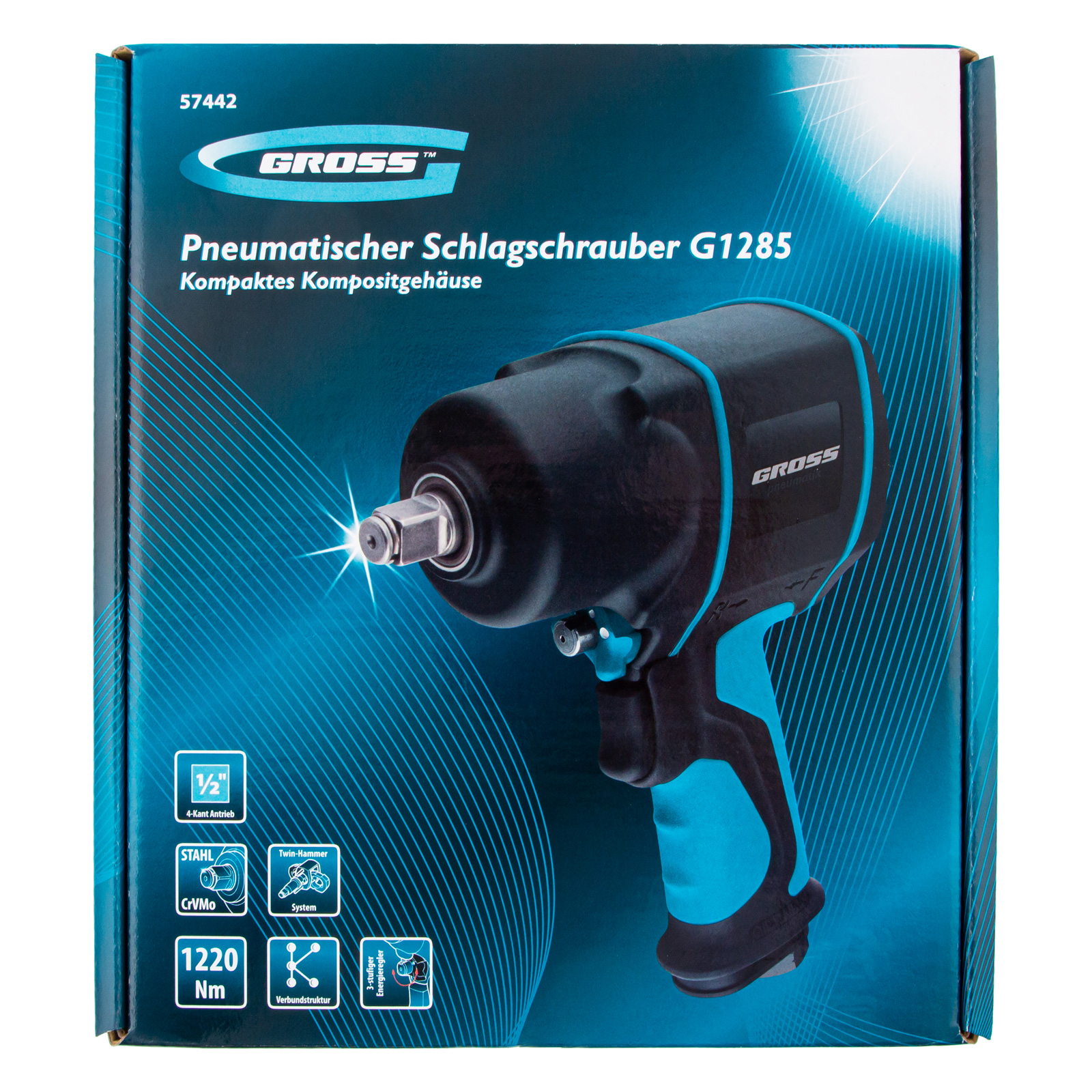 Пневматический ударный гайковерт Gross G1285 57442 из композитного материала, с присоединительным квадратом 1/2″, максимальным крутящим моментом 1220 Нм и частотой вращения шпинделя 6500 об/мин, применяется для монтажа и демонтажа резьбовых соединений, в том числе и высоконагруженных. Его можно использовать с компрессорами средней мощности благодаря небольшому расходу воздуха от 140 л/мин. Гайковерт обладает высокой производительностью и подходит для профессиональных работ на станциях ТО автомобилей и в сборочных цехах.