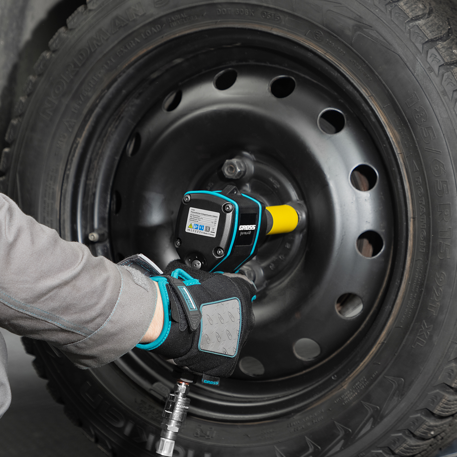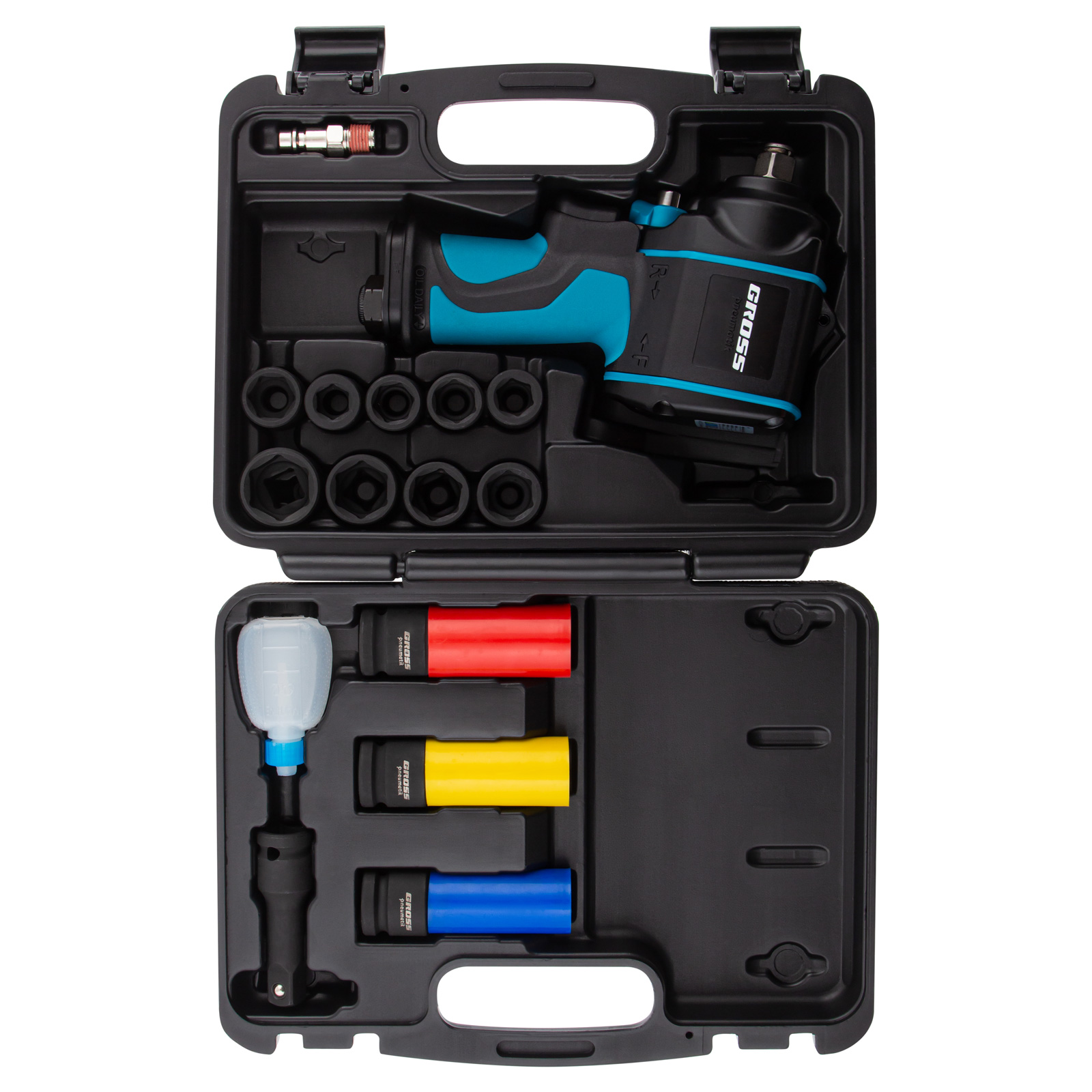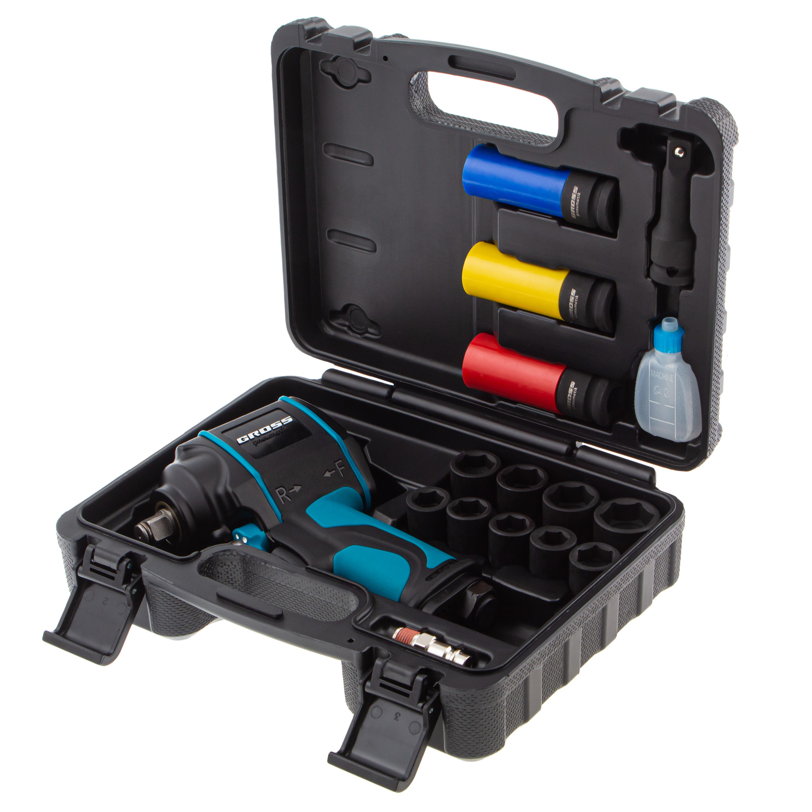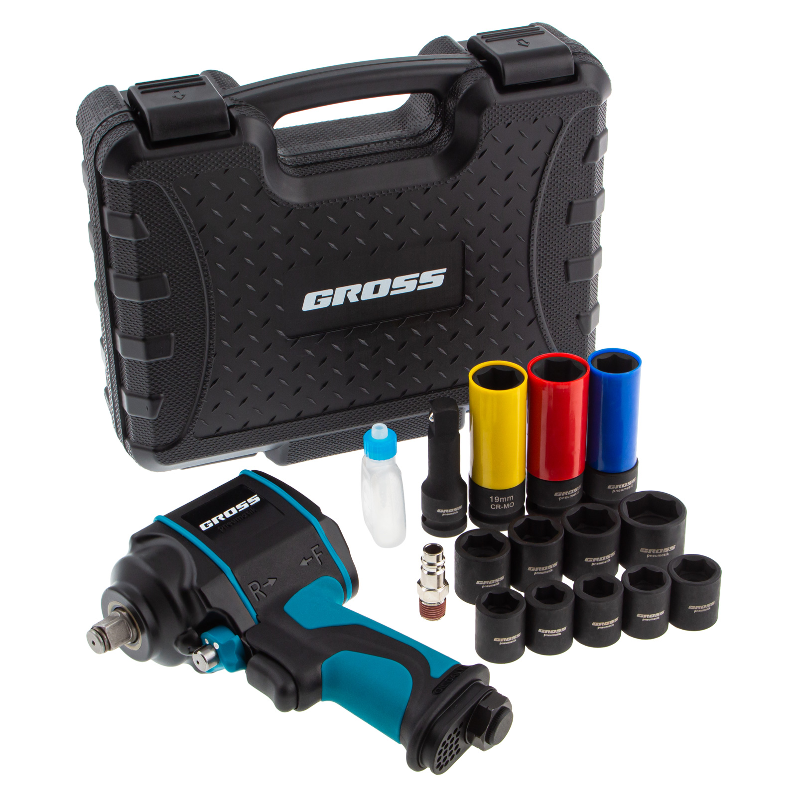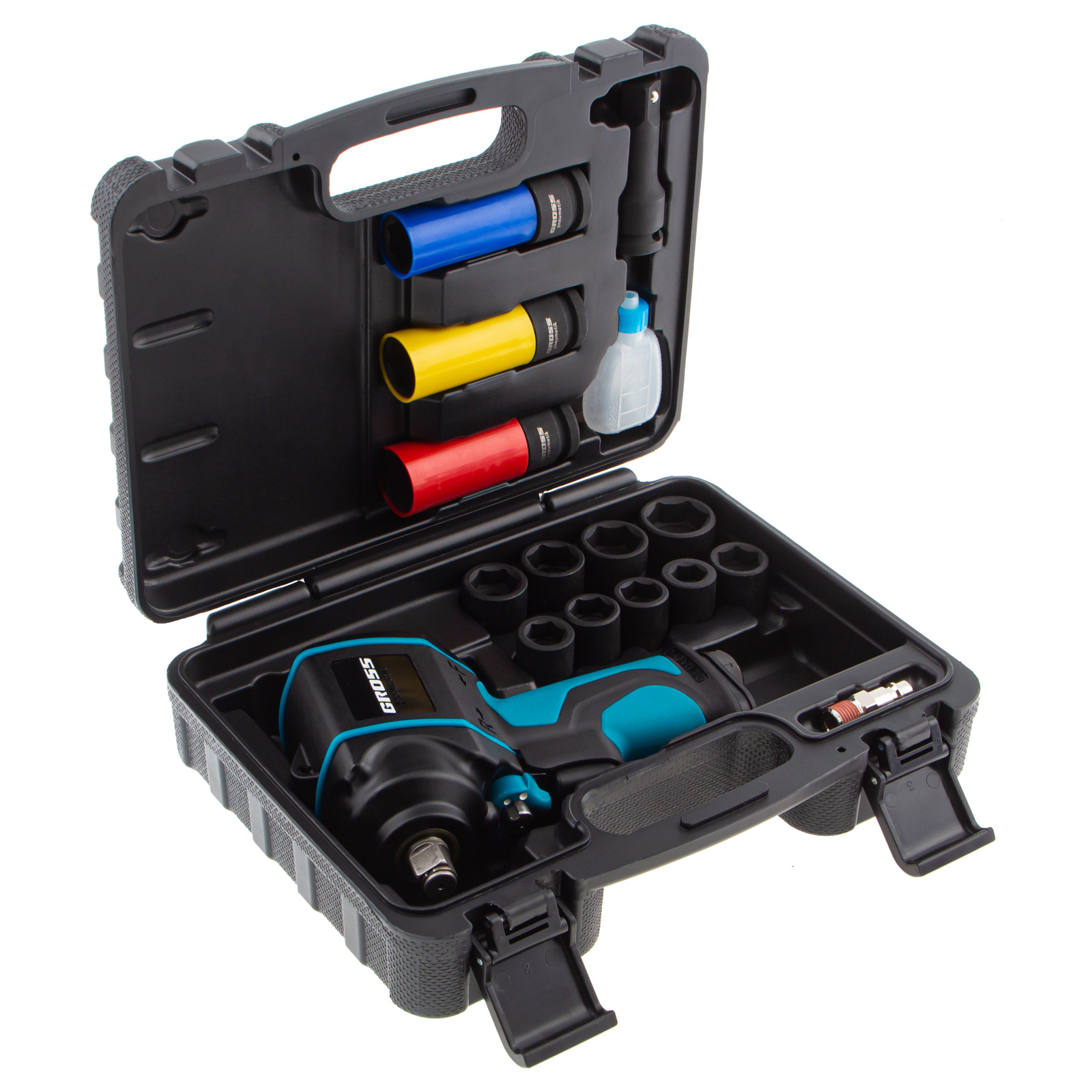 Пневматический ударный гайковерт Gross G985K2 57445 с максимальным крутящим моментом 610 Нм и присоединительным квадратом 1/2″, с частотой вращения шпинделя 9000 об/мин, входит в набор из 17 предметов и упрощает закручивание/раскручивание резьбовых высоконагруженных соединений на винтах, болтах и гайках. Для него подойдет маломощный компрессор, т.к. инструмент расходует небольшое количество воздуха от 120 л/мин. Гайковерт применяется как в быту, так и в профессиональной сфере — в гараже, сборочном цехе, автосервисе, на строительной площадке.
