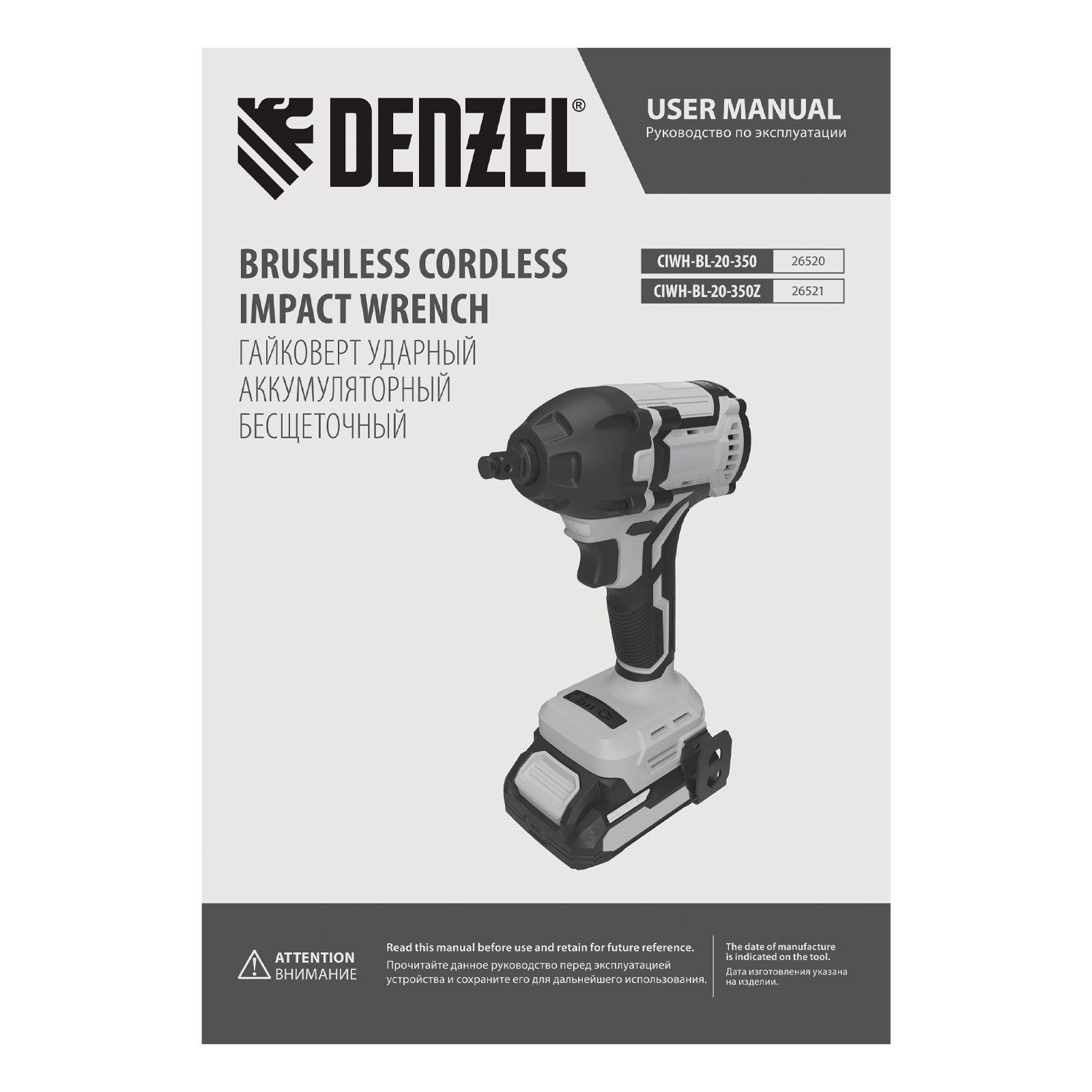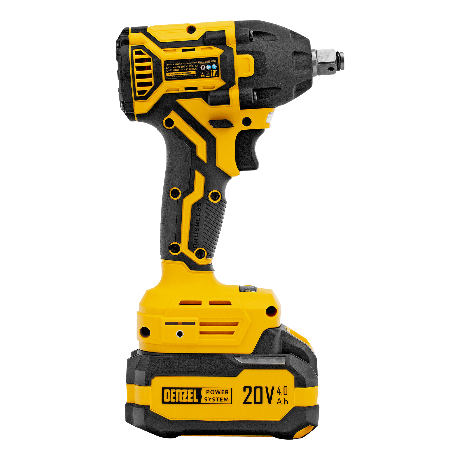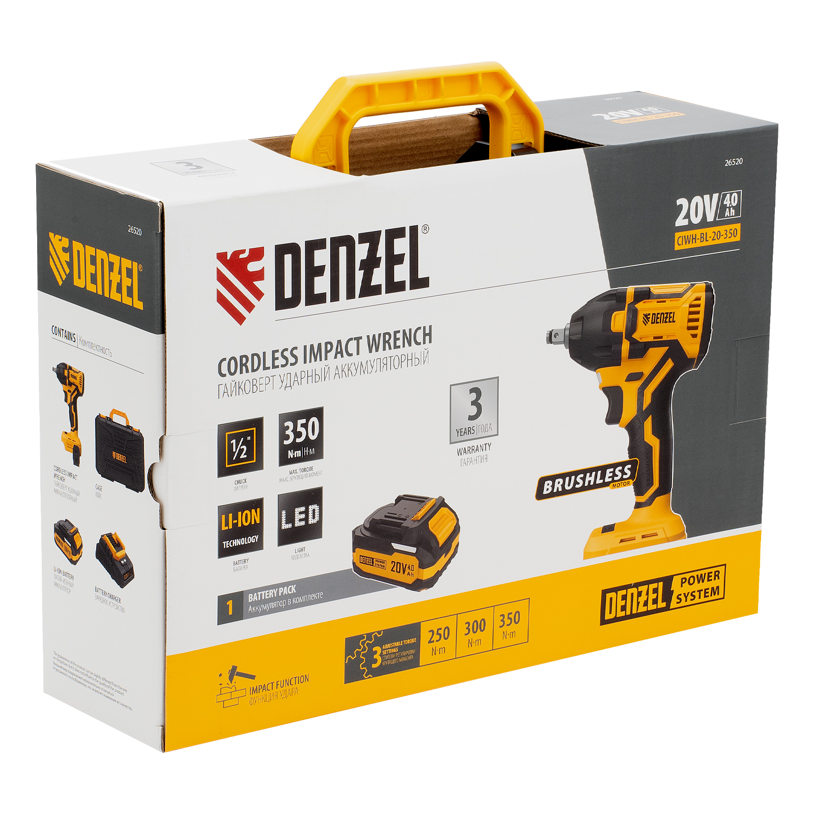 Аккумуляторный ударный гайковерт Denzel CIWH-BL-20-350 26520 с бесщеточным двигателем работает от аккумулятора Li-Ion 20 В и используется для закручивания и откручивания гаек, болтов и другого резьбового крепежа. Доступно 3 режима работы, при которых частота вращения шпинделя составляет 0-1500, 0-2000 и 0-2500 об/мин, а частота ударов — 0-2100, 0-2800 и 0-3500 уд/мин. Реализована функция электронной регулировки частоты вращения в зависимости от степени нажатия на клавишу пуска, что позволяет установить оптимальную скорость и усилие затяжки. Максимальный крутящий момент составляет 350 Н·м — этого достаточно для эффективного решения поставленных задач. Ударный механизм упрощает работу с туго затянутым и заржавевшим крепежом.