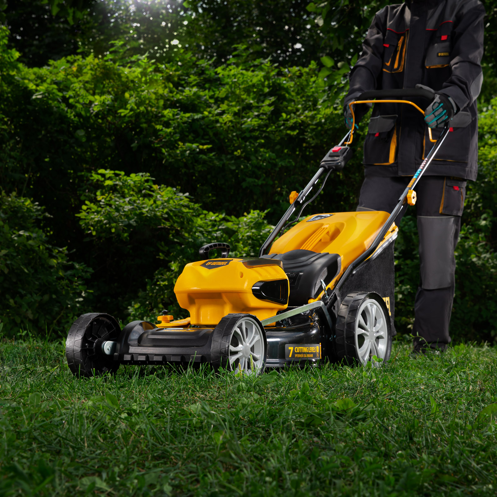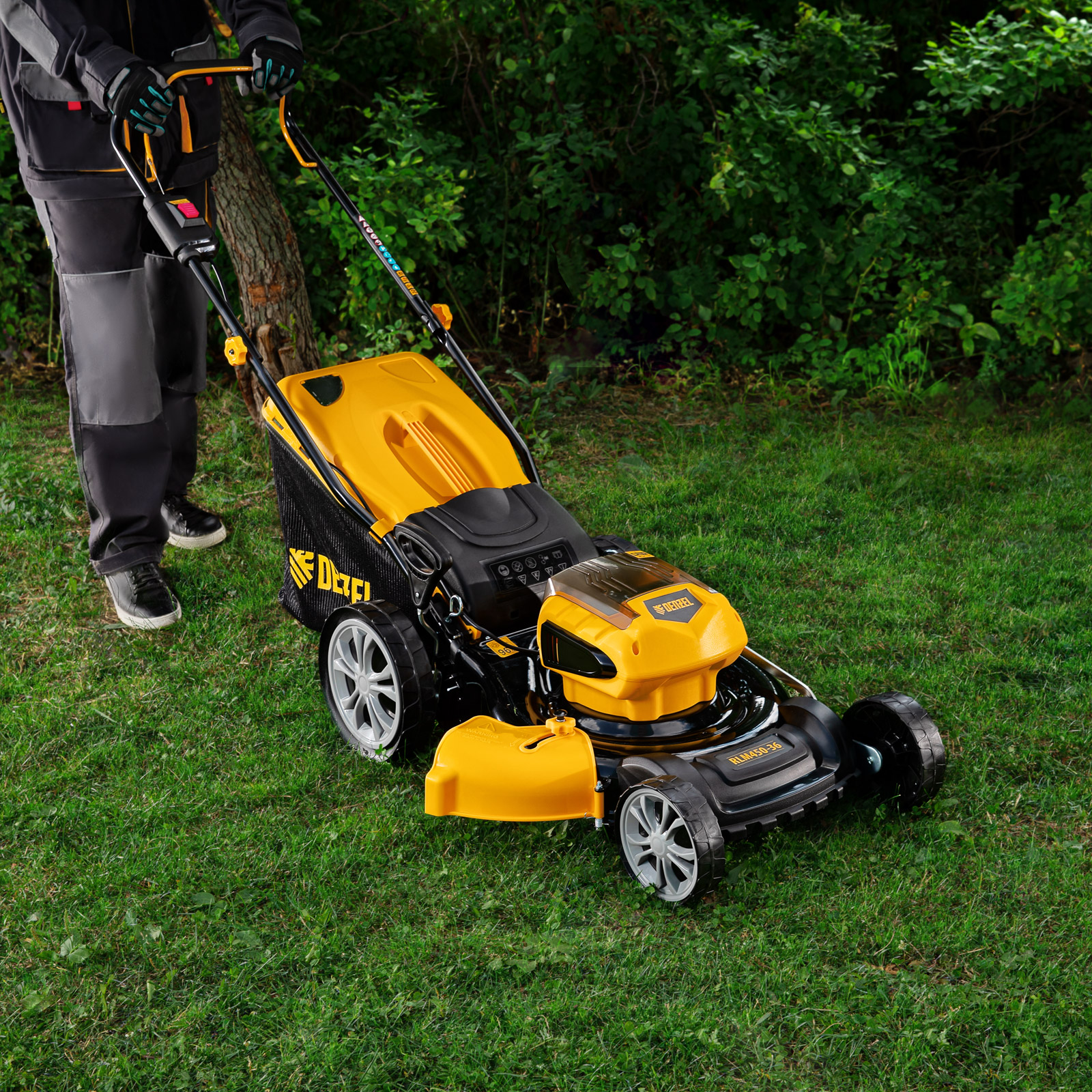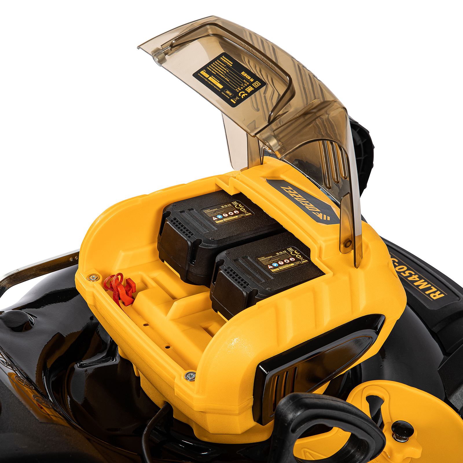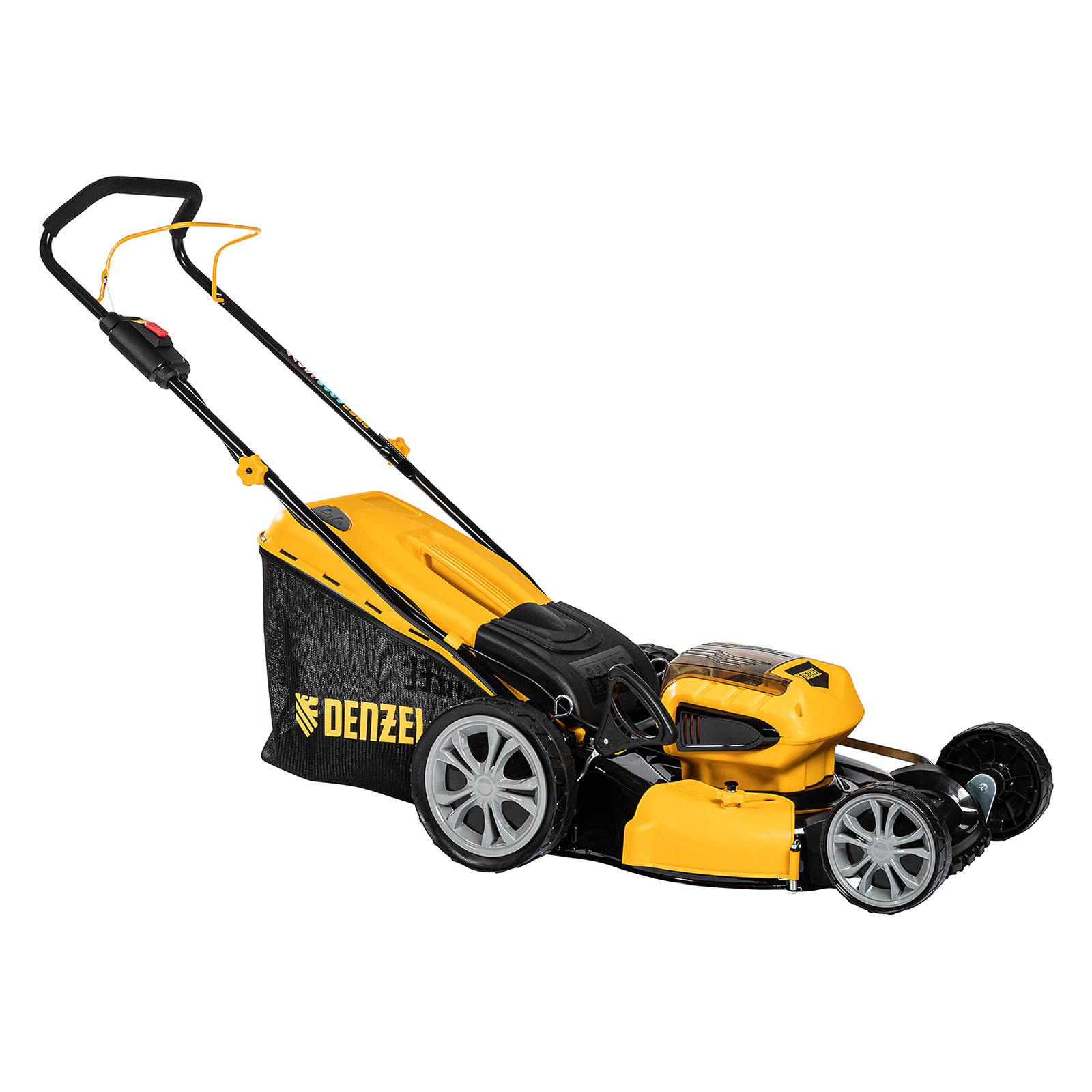 Бесщеточная аккумуляторная газонокосилка Denzel RLM450-36 58910 работает от двух батарей Li-Ion суммарным напряжением 36 В и емкостью 4 Ач, оснащена объемным травосборником на 40 л и обеспечивает ширину скашивания 450 мм за один проход. Машина предназначена для ухода за газоном и подрезания травы на небольших приусадебных участках. Высокоэффективный бесщеточный двигатель позволяет скашивать больше травы на одном заряде АКБ. 7-ступенчатая настройка высоты среза позволяет регулировать уровень скашивания травы в диапазоне 25-75 мм.,Аккумуляторная газонокосилка выгодно отличается от бензиновых и сетевых аналогов по уровню безопасности. Она не требует сложного техобслуживания, пользователю не нужно готовить топливную смесь, а управление будет комфортным даже для новичков.