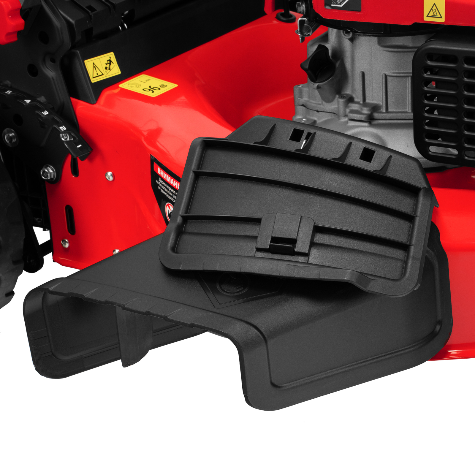 - Простая регулировка высоты скашивания — достаточно изменить положение рычага, переставлять колеса не требуется.