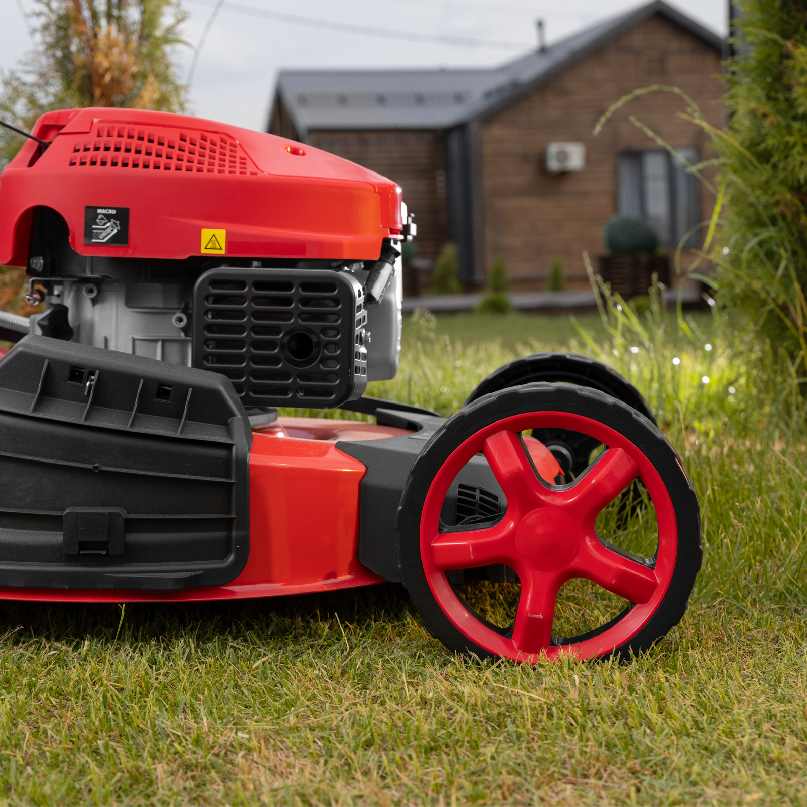 - Привод на колеса — газонокосилку не нужно толкать, что значительно упрощает работу.