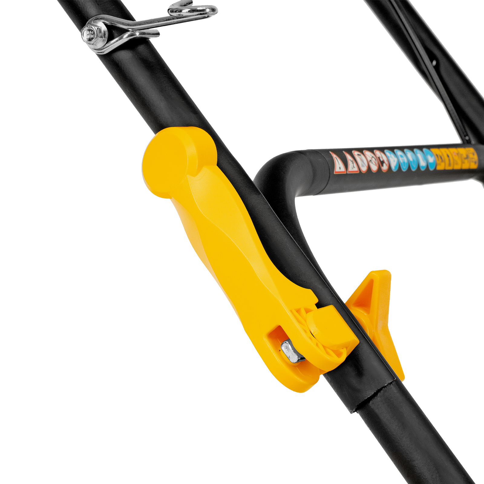 Продуманная конструкция — рукоятка с эксцентриковыми фиксаторами легко складывается, поэтому газонокосилка не занимает много места в зоне хранения.