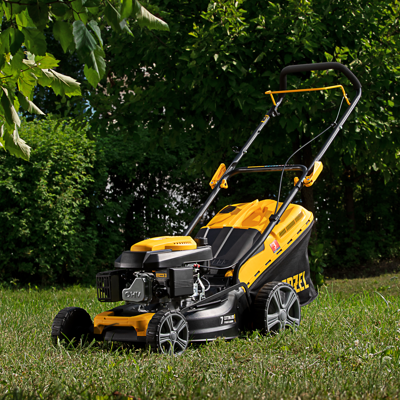- Автономность — бензиновая газонокосилка не привязана к электросети, поэтому может работать в отдаленных участках сада.