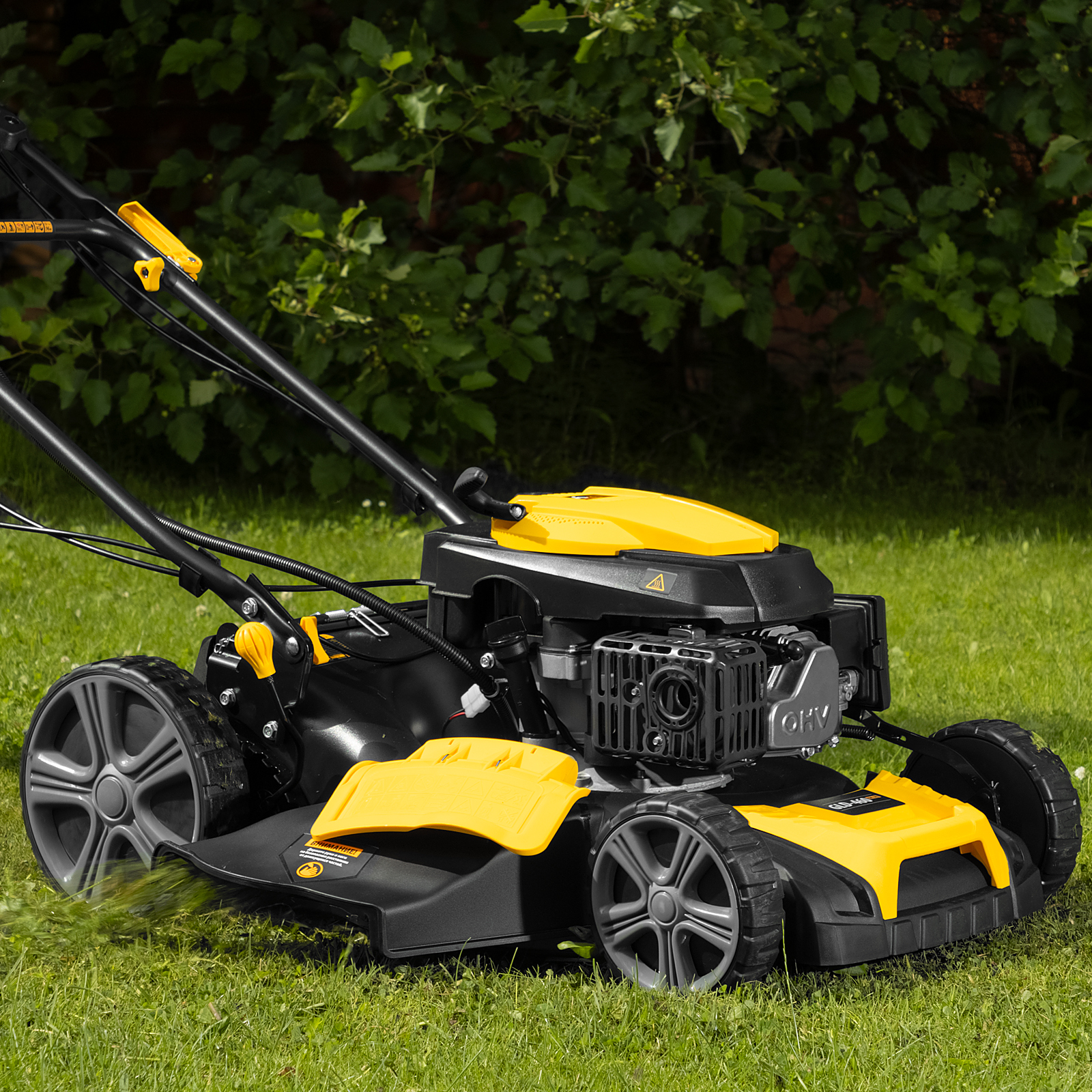 - Регулировка оборотов двигателя — запуск и маневрирование происходят на низких оборотах, скашивание — на высоких.