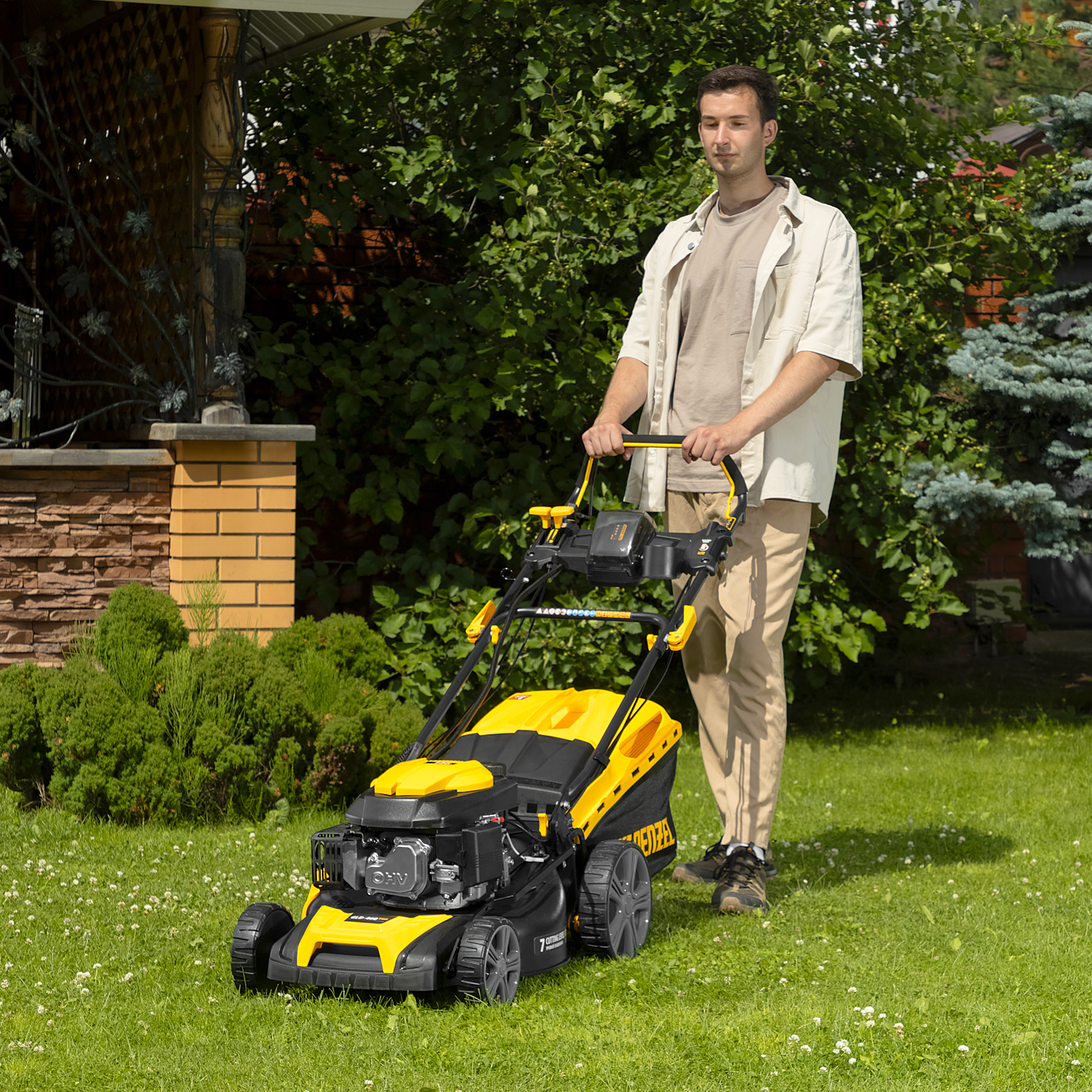 - Электрический старт — запуск двигателя значительно упрощен, достаточно нажать на кнопку (электростарт работает на единой аккумуляторной платформе Denzel Power System 20V, подойдет батарея емкостью 2 А·ч от любого аккумуляторного инструмента Denzel).