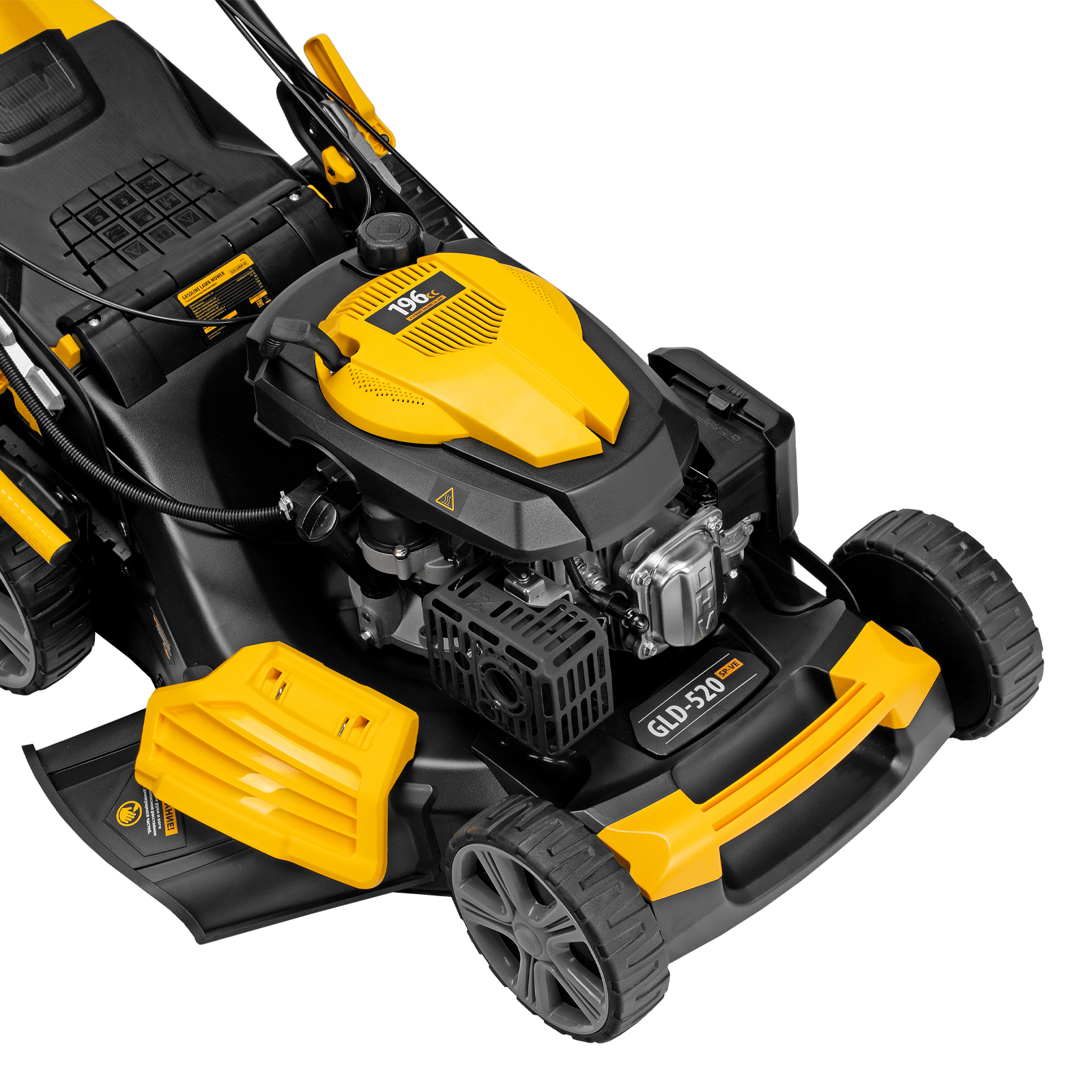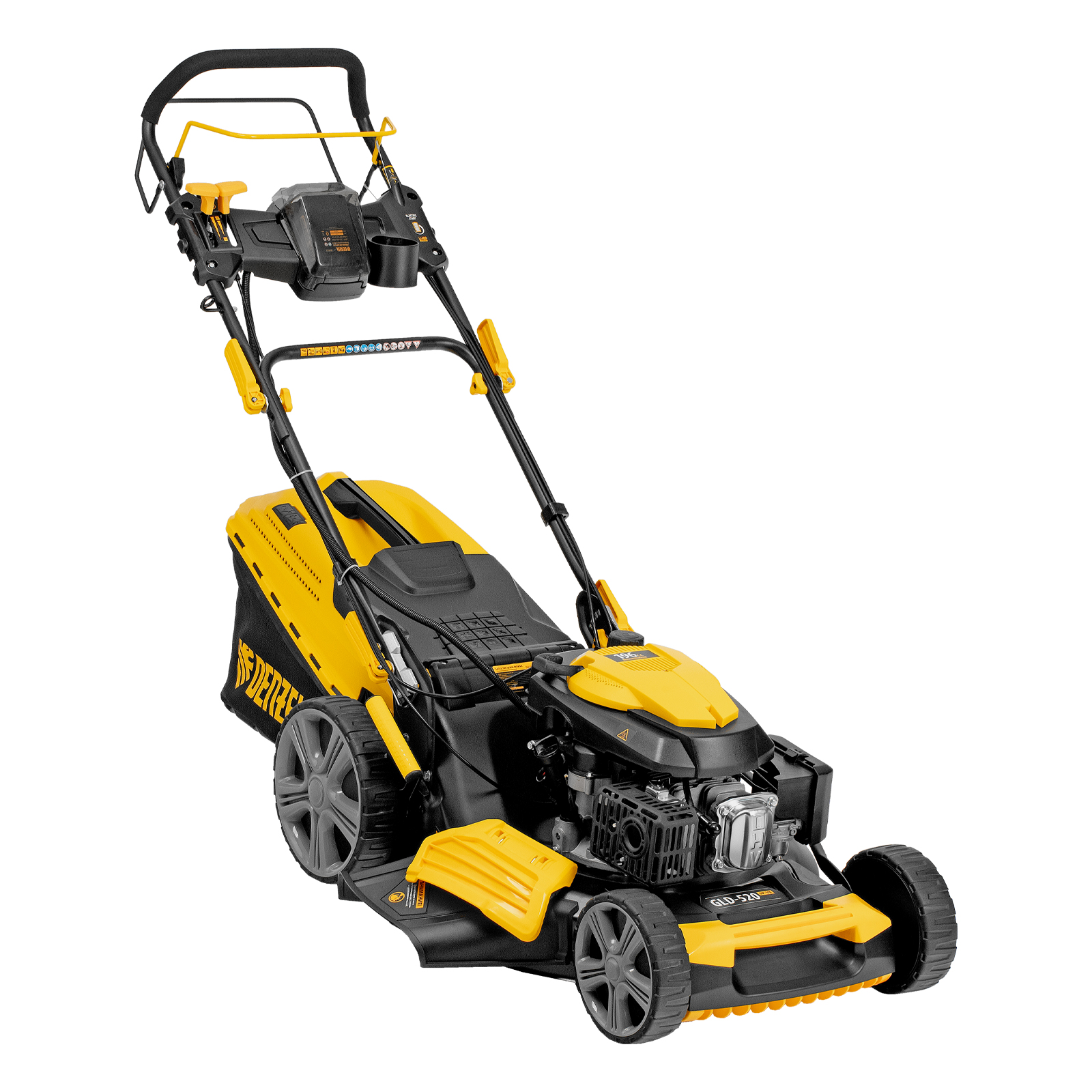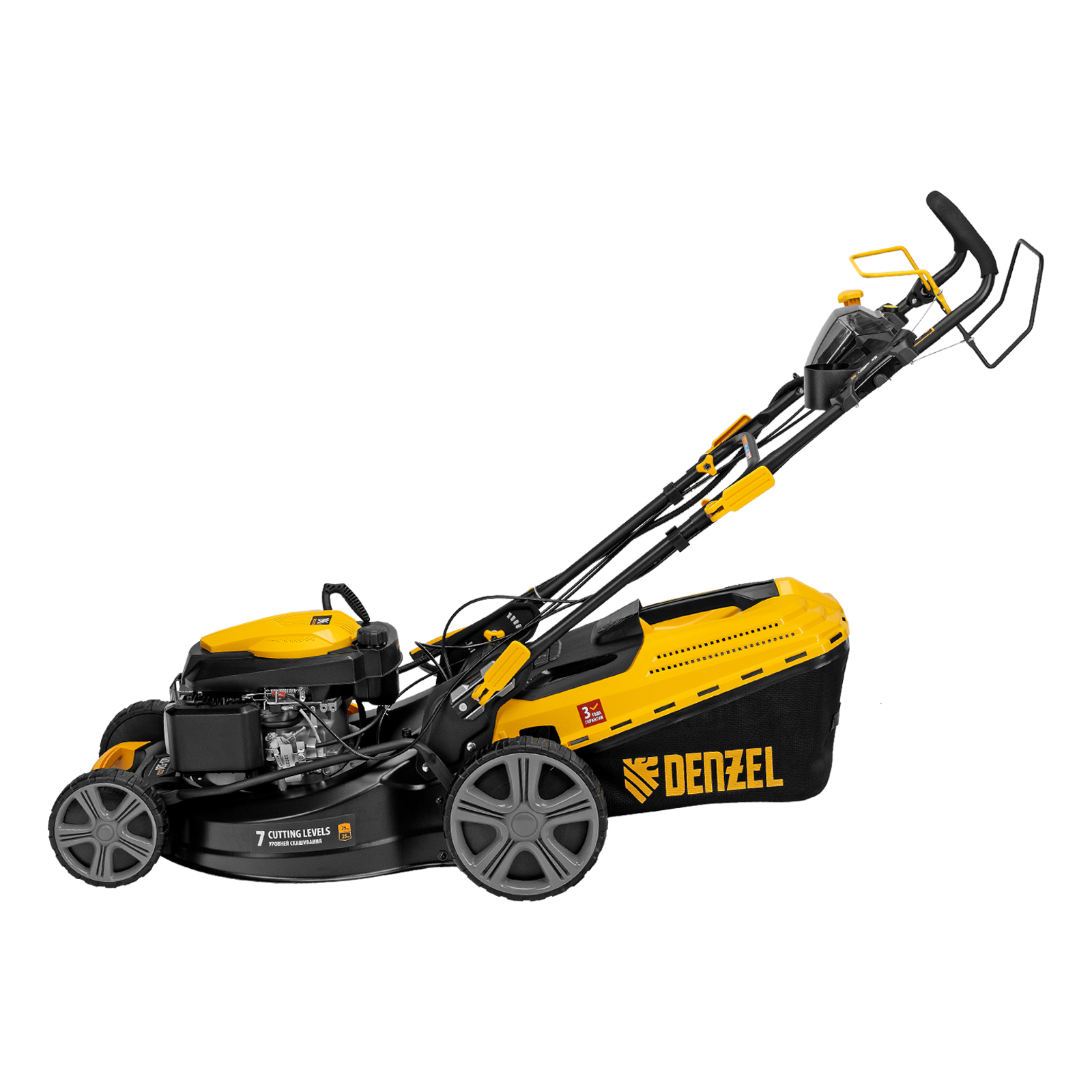 Бензиновая газонокосилка Denzel GLD-520SP-VE 58806 с приводом на колеса и вариатором оснащена двигателем объемом 196 см³ и электрическим стартом. Обеспечивает ширину скашивания 52 см за один проход и собирает траву в контейнер объемом 60 л. Идеально подходит для благоустройства дачной территории, обновления газонов и дорожек. Благодаря двигателю мощностью 6,5 л.с. справляется даже с густым бурьяном.,Ширина прохода составляет 52 см, за 1 час можно обработать участок площадью более 1800 м². Высота среза регулируется при помощи рычага в соответствии с типом газона (всего 7 уровней, от 25 до 75 мм). Можно получить идеально ровный и низко подстриженный парадный покров или площадку для спортивных игр, функциональную лужайку с травой 4-6 см или садово-парковый газон с максимально высокой растительностью.