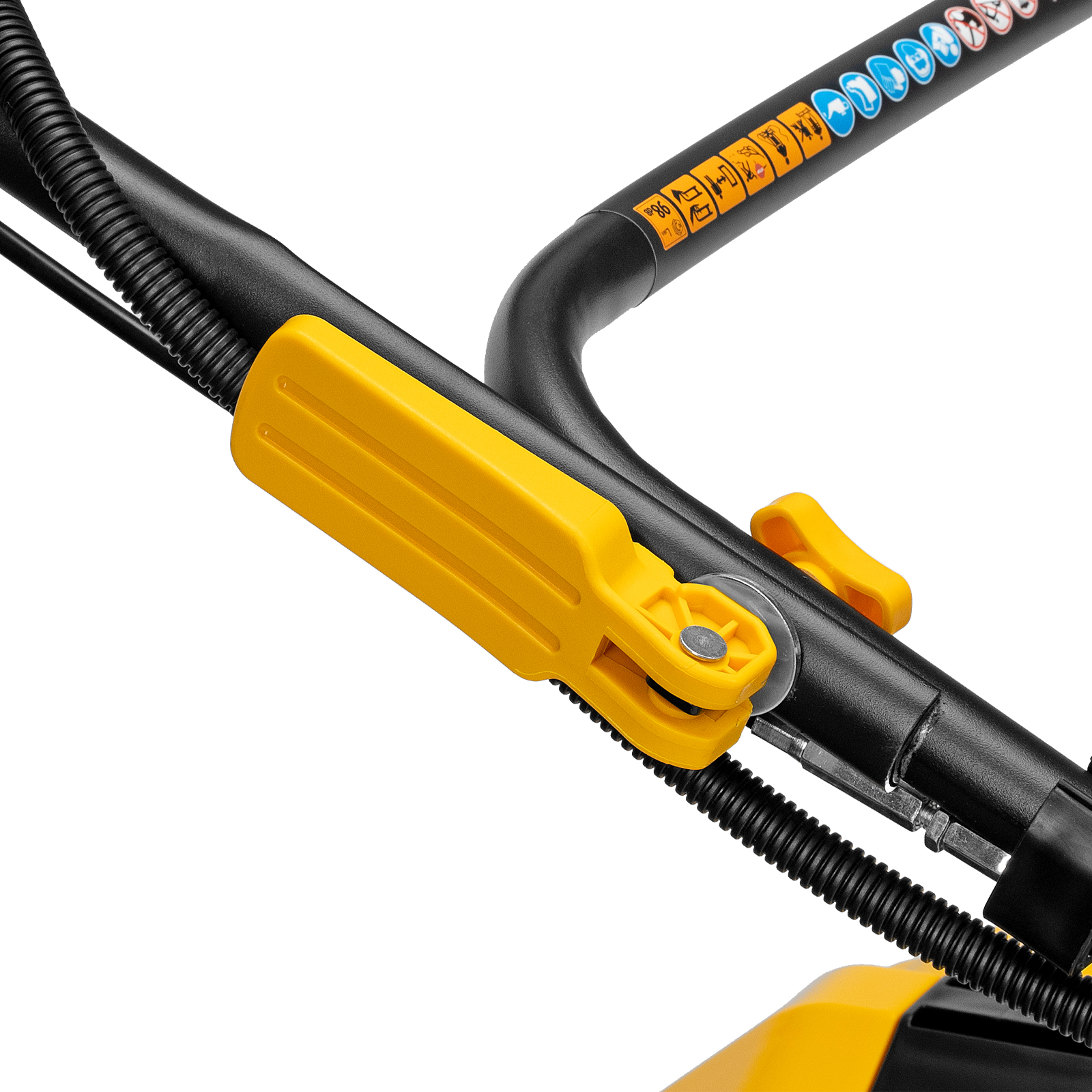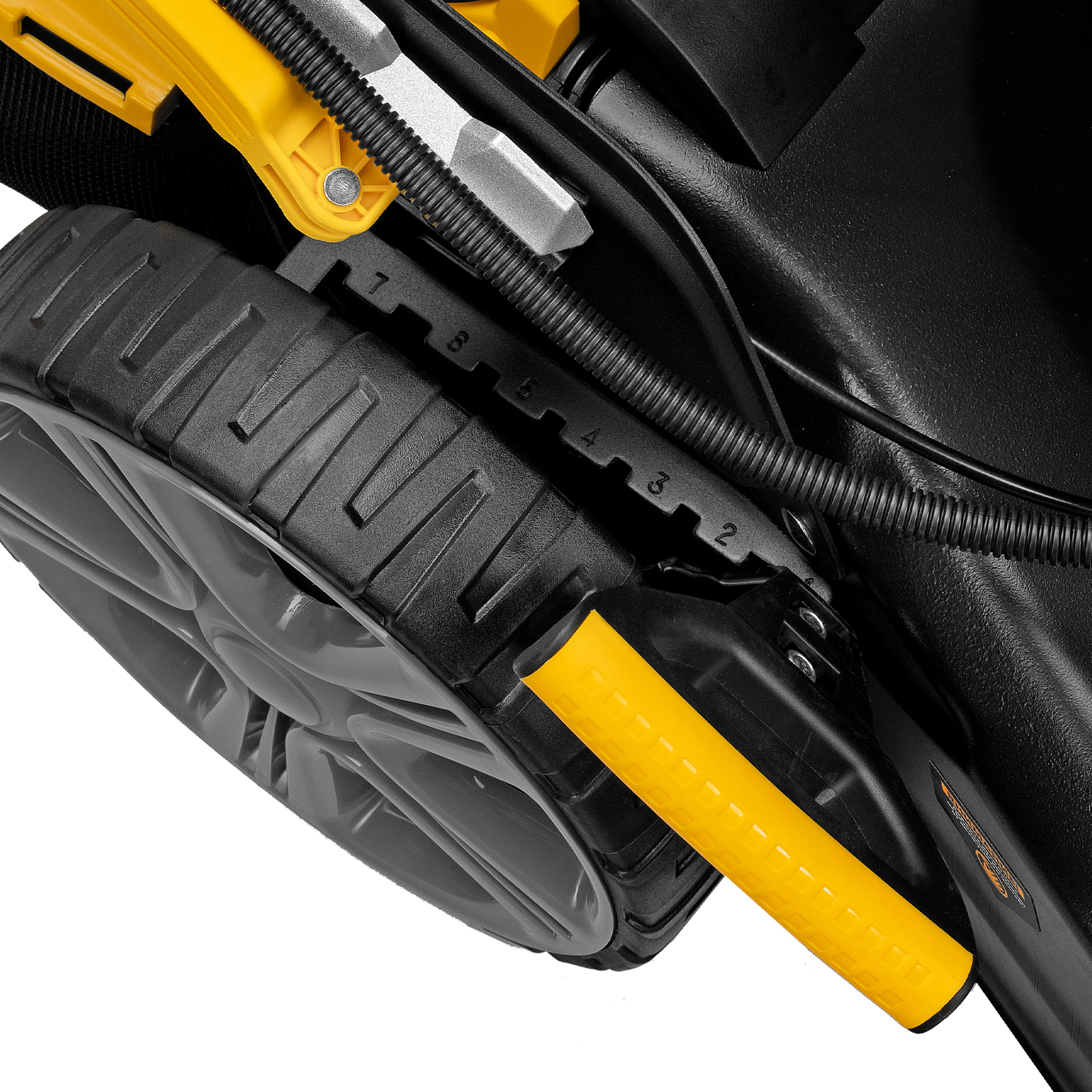 - Регулировка скорости движения — низкая частота вращения колес оптимальна для скашивания густой травы и работы на ограниченном участке, высокая — для подстригания редко растущей и молодой травы.