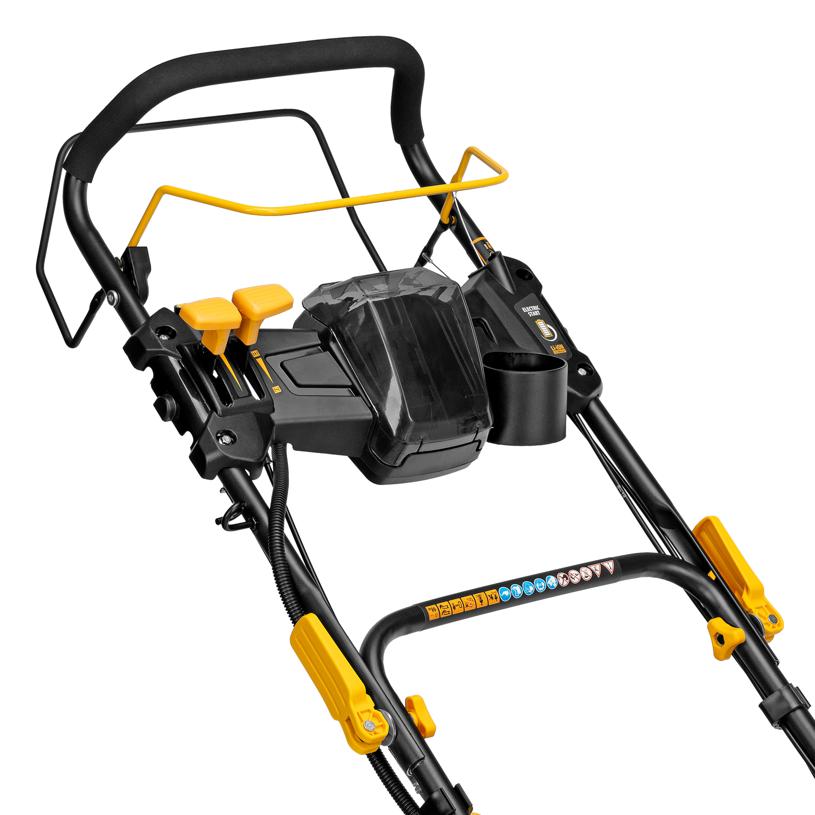 - Электрический старт — запуск двигателя значительно упрощен (электростарт работает на единой аккумуляторной платформе Denzel 18 В, подойдет любой аккумулятор емкостью 2 А·ч — арт. 28433 либо арт. 28435).
