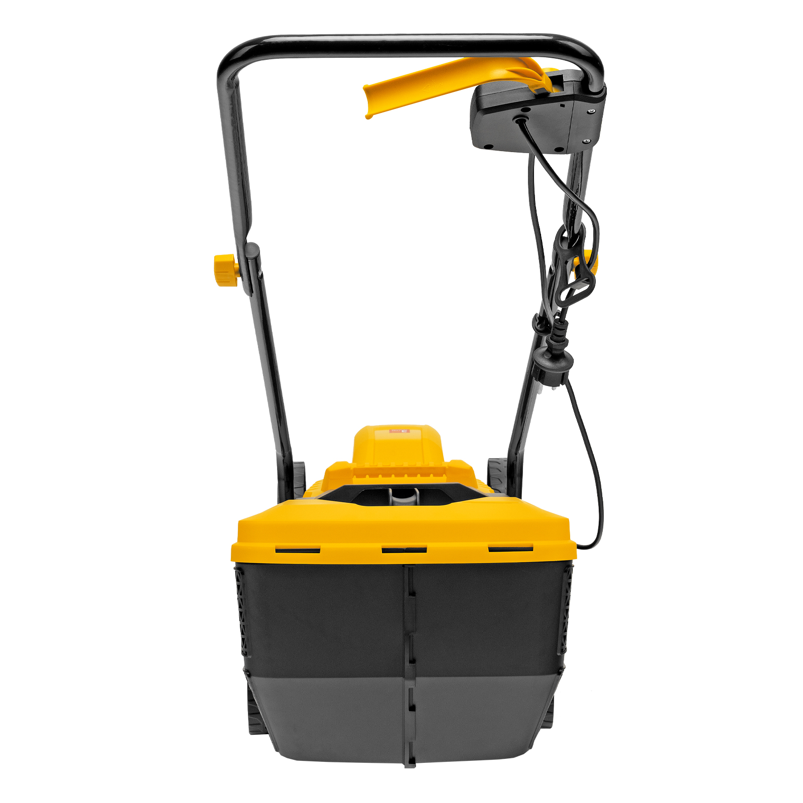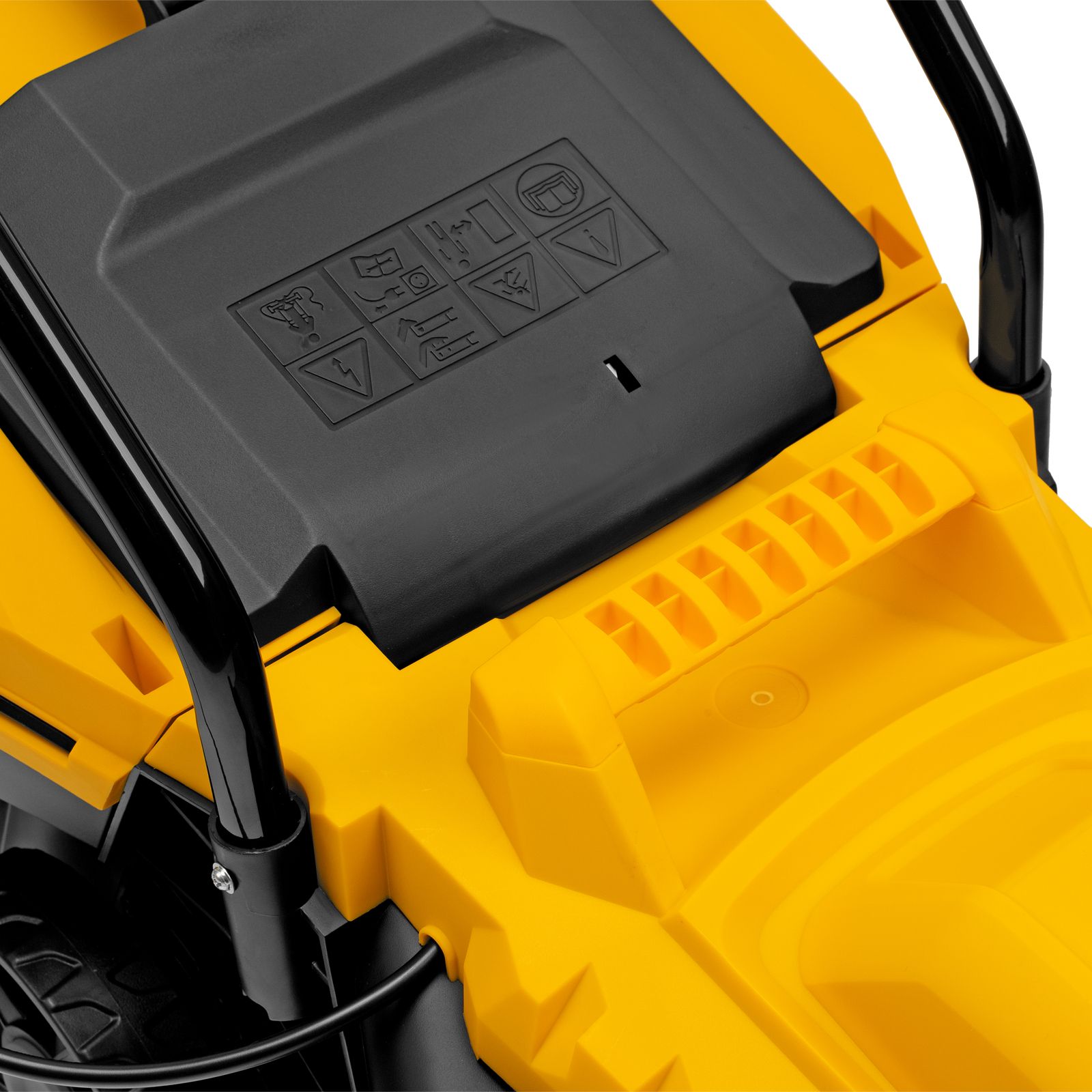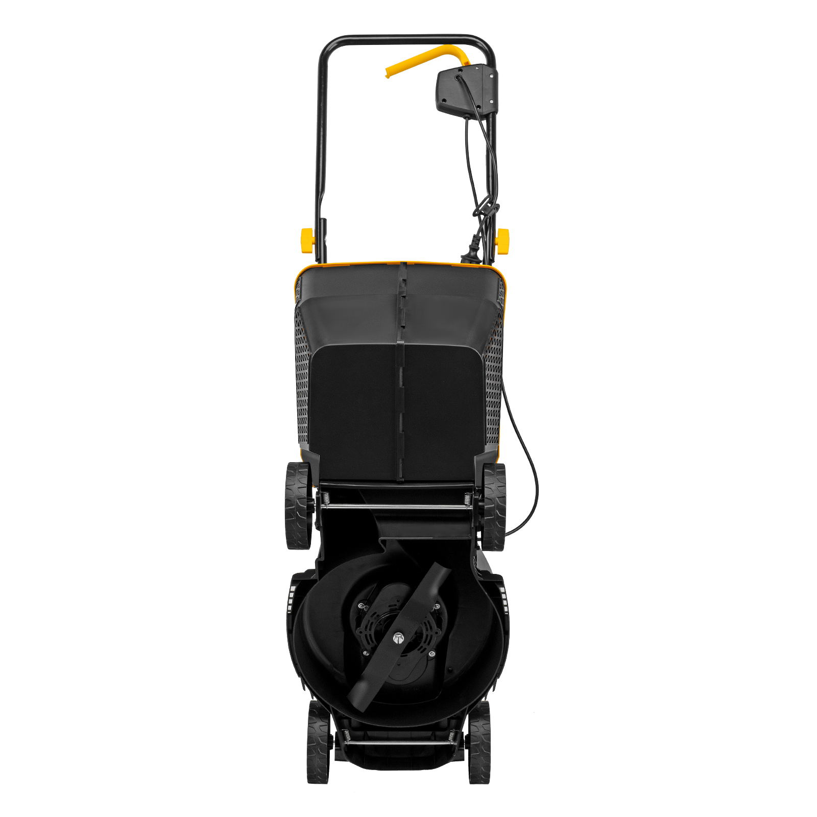 - Безопасность — функция блокировки исключает случайный запуск двигателя, а держатель кабеля предотвращает отключение техники от сети и уменьшает риск попадания провода под нож.