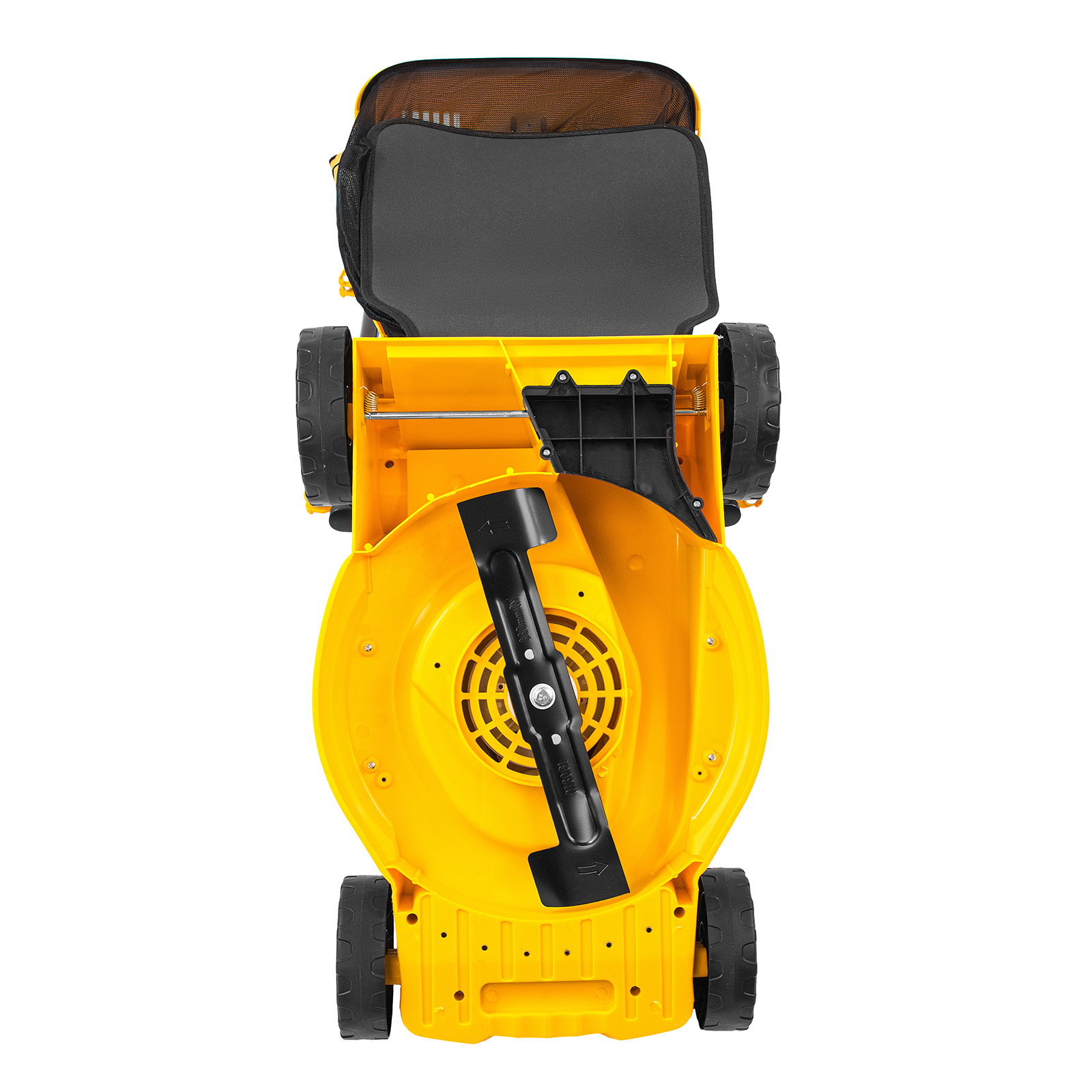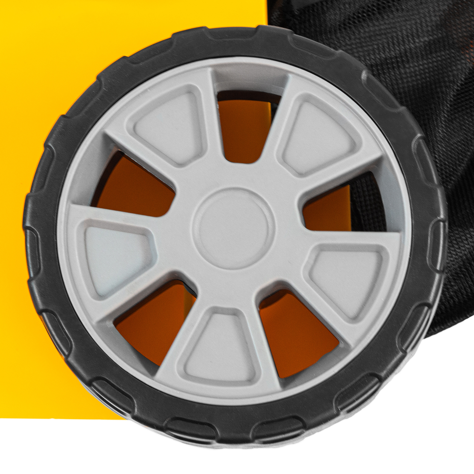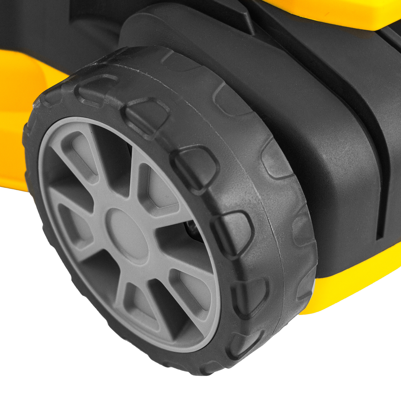 - Маневренность — широкие колеса позволяют удобно перемещать газонокосилку по участку и не приминают траву.
