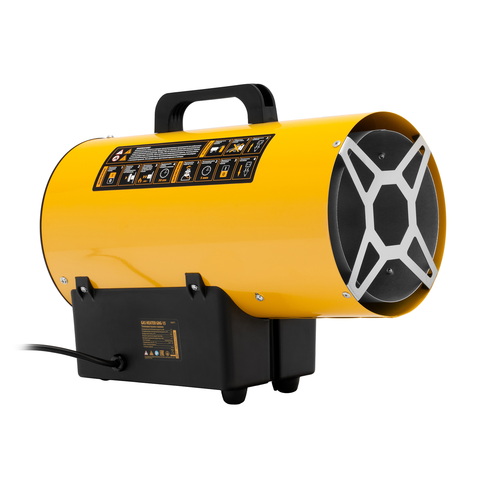 Газовая тепловая пушка Denzel GHG-15 96477 мощностью 15 кВт работает на смеси пропан-бутан и выдает тепловой поток со скоростью 500 м³/ч. Используется для обогрева складов, цехов, гаражей, теплиц и других нежилых помещений площадью до 150 м². Будет полезна на строительных площадках и в производственных помещениях, а также для монтажа натяжных потолков.
