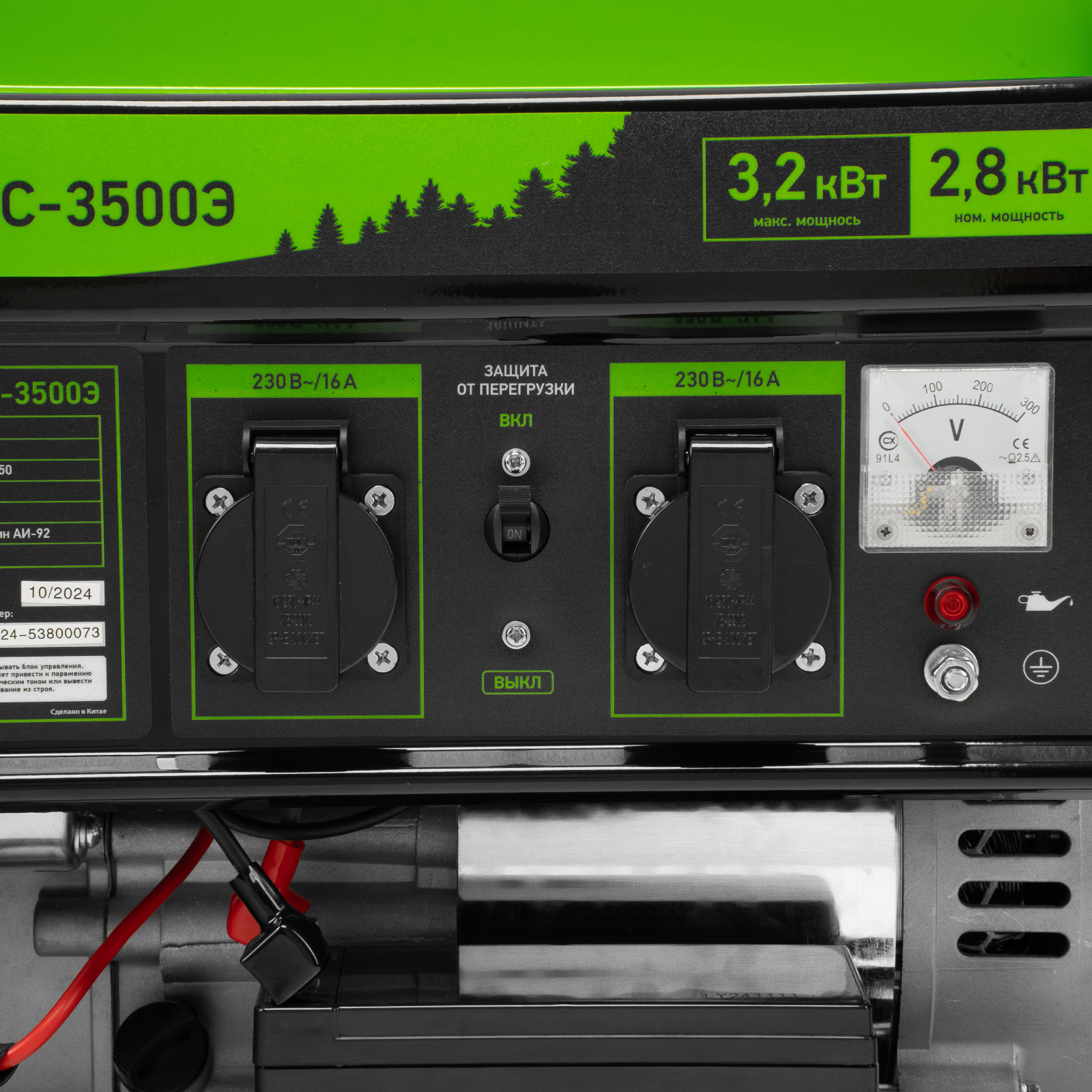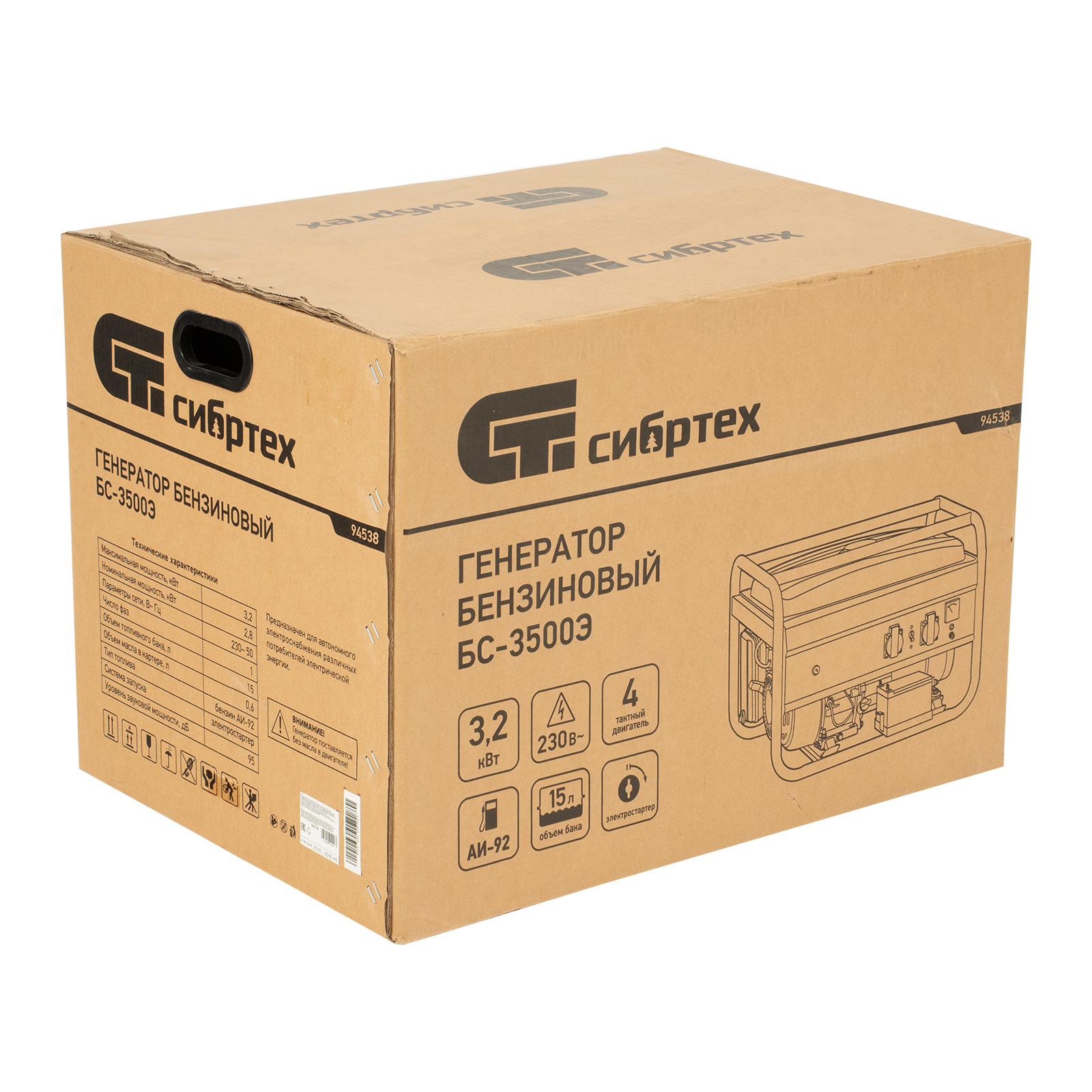 Бензиновый генератор Сибртех БС-3500Э 94538 выходной мощностью 3,2 кВт, с электростартером и баком объемом 15 л, поддерживает напряжение 230 В и предназначен для автономного электроснабжения в условиях отсутствия бытовой электросети. Для подключения потребителей предусмотрены 2 розетки 230 В/16 А. Автономный регулятор напряжения AVR позволяет подключать чувствительные приборы без риска их поломки. Генератор пригодится на дачном участке.