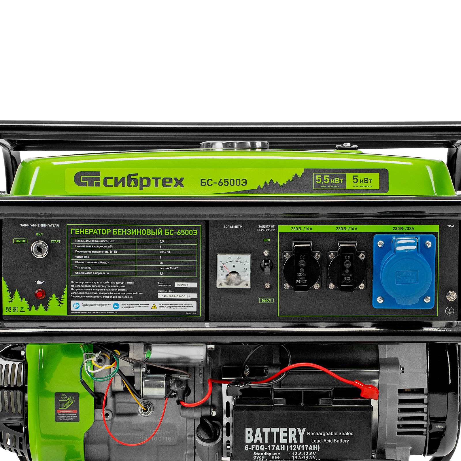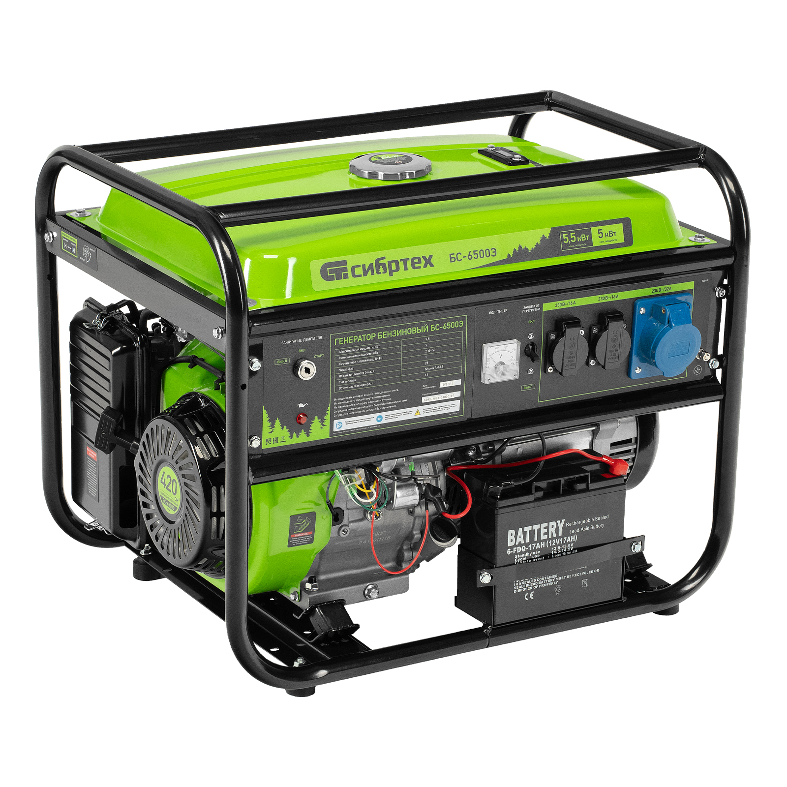 Бензиновый генератор Сибртех БС-6500Э 94548 максимальной мощностью 5,5 кВт, с 4-тактным двигателем, электростартером и баком объемом 25 л, выдает напряжение 230 В и используется для электроснабжения на даче, на строительной площадке, в магазине, в мастерской или гараже. Мощности хватает для обеспечения работы электроинструмента или одновременного подключения 4 ламп накаливания, телевизора, плиты и холодильника. Благодаря электростартеру запуск генератора осуществляется одним поворотом ключа.