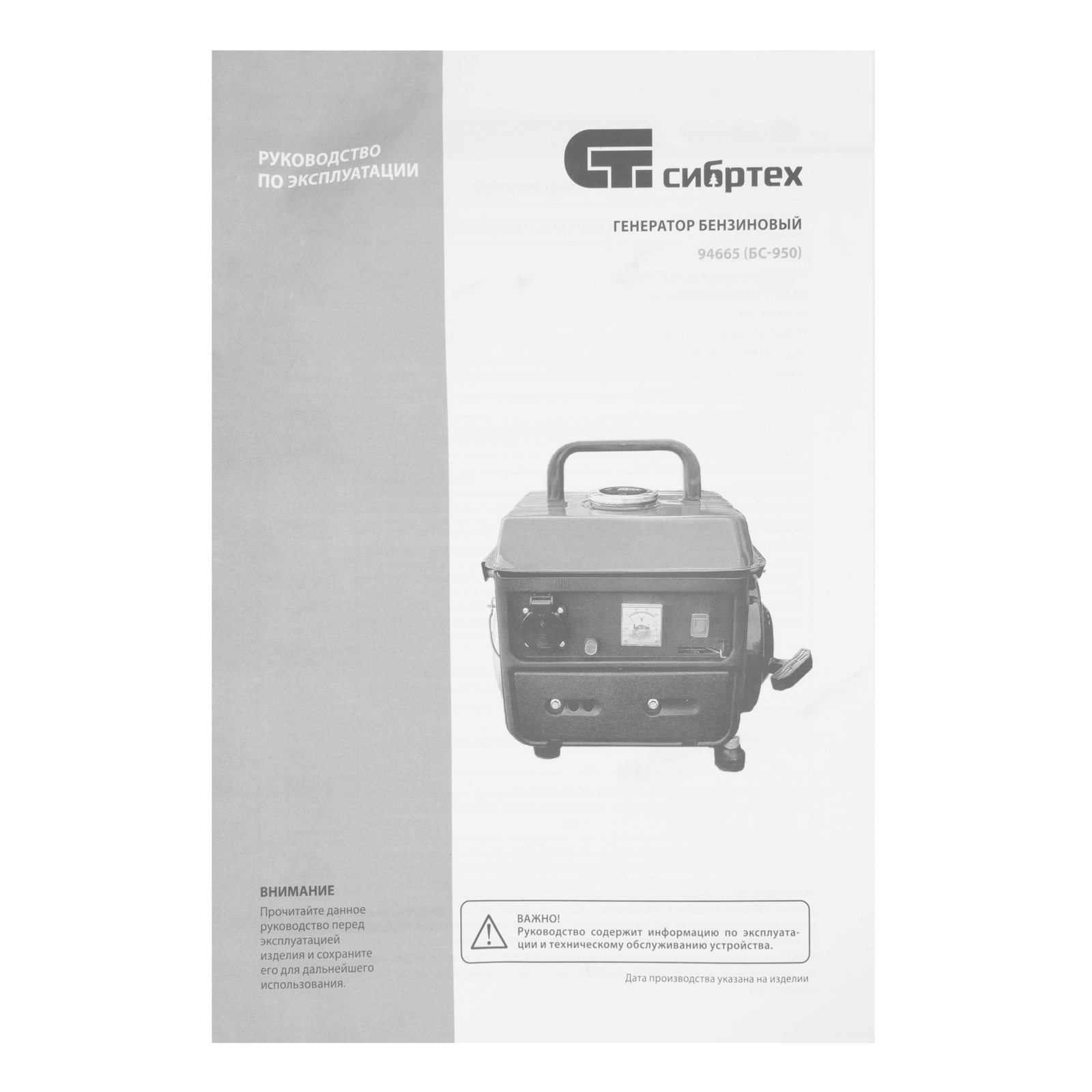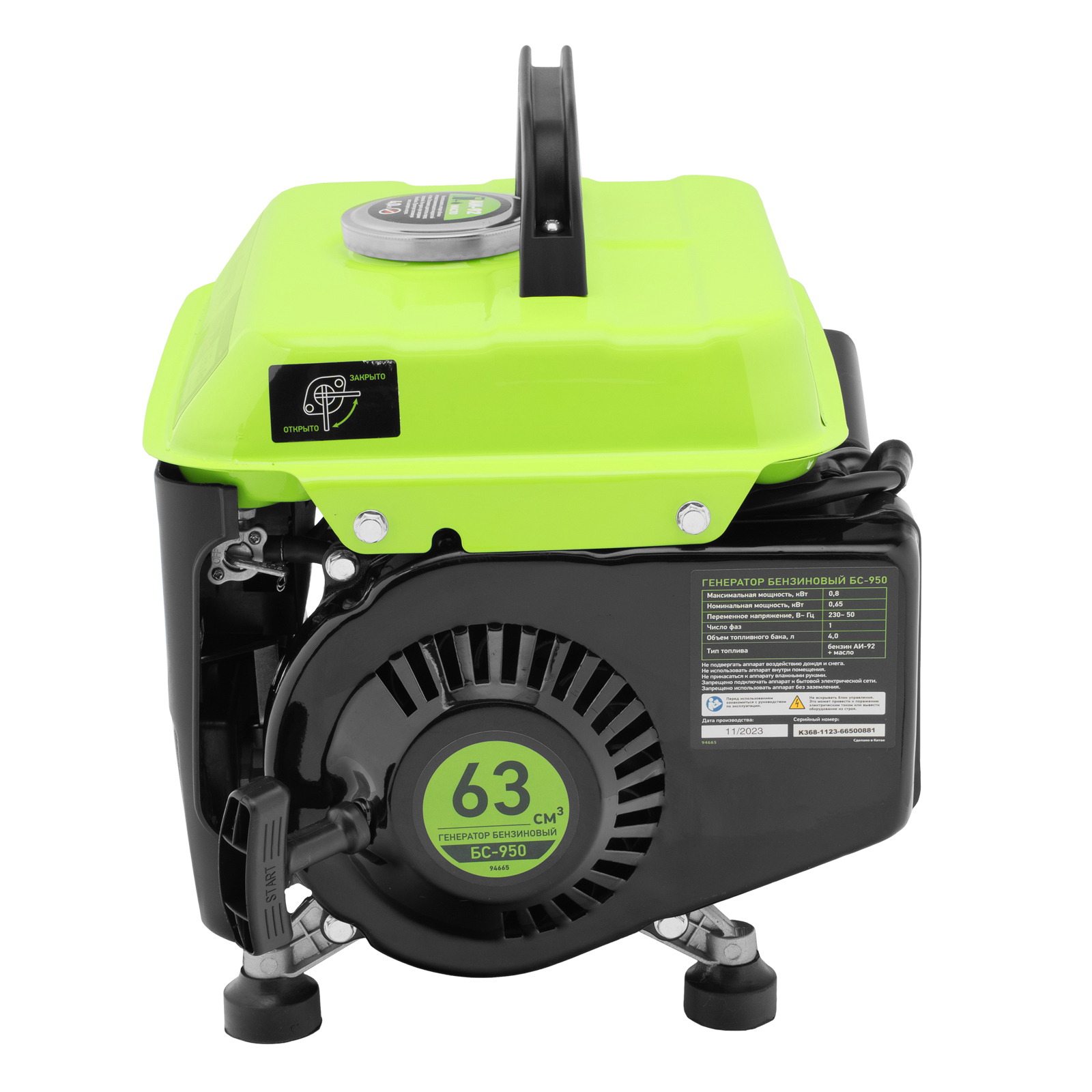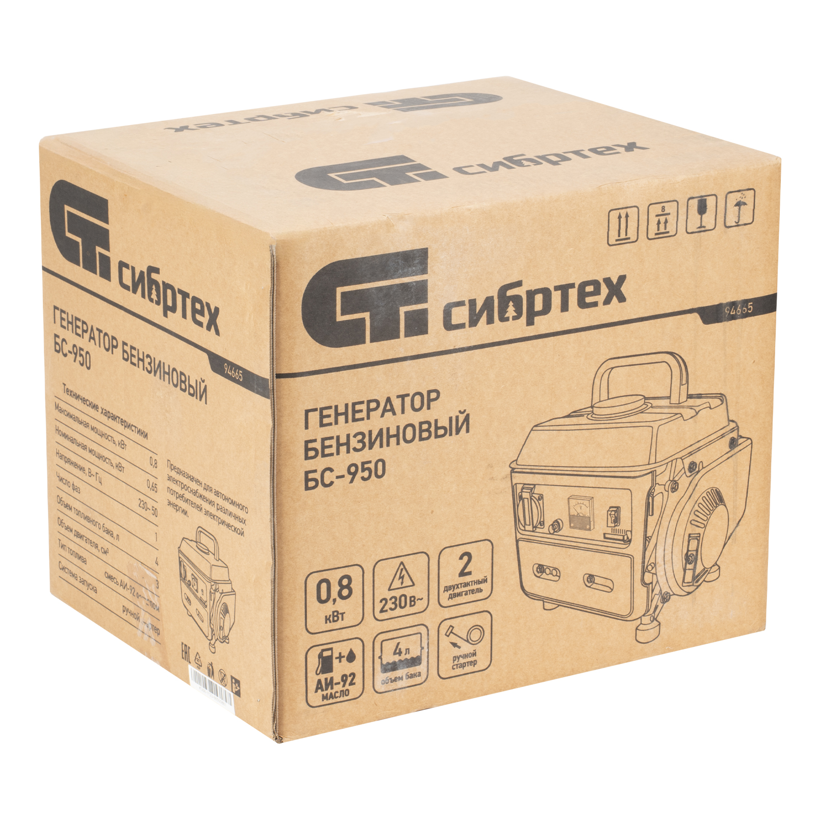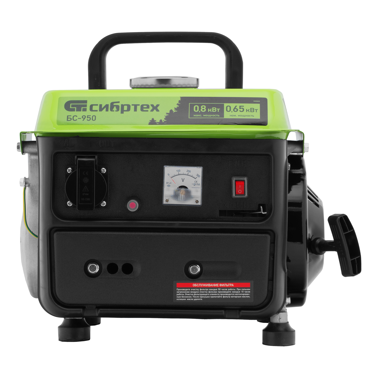 Генератор бензиновый БС-950, 0.8 кВт, 230 В, 2-х тактный, 4 л, ручной стартер Сибртех