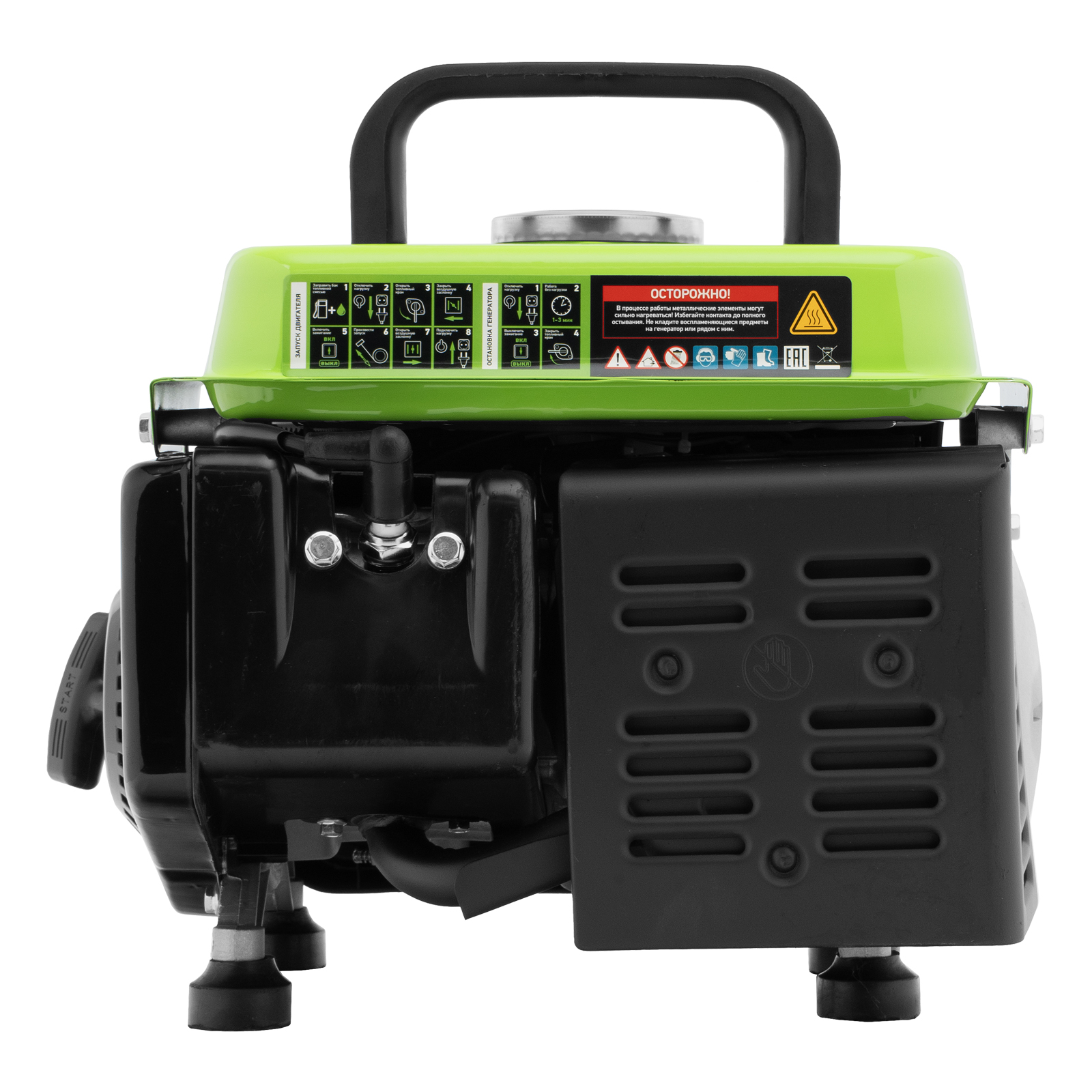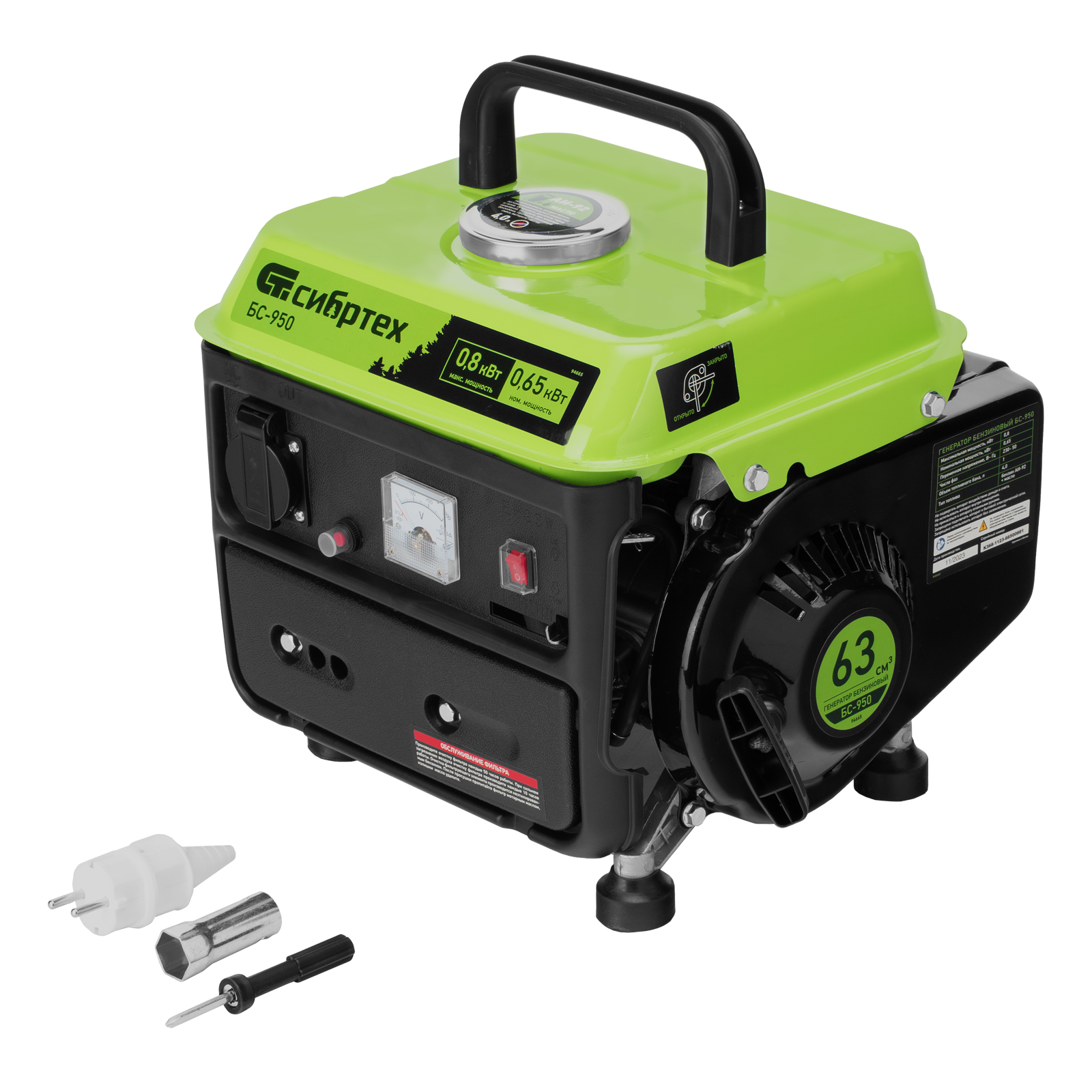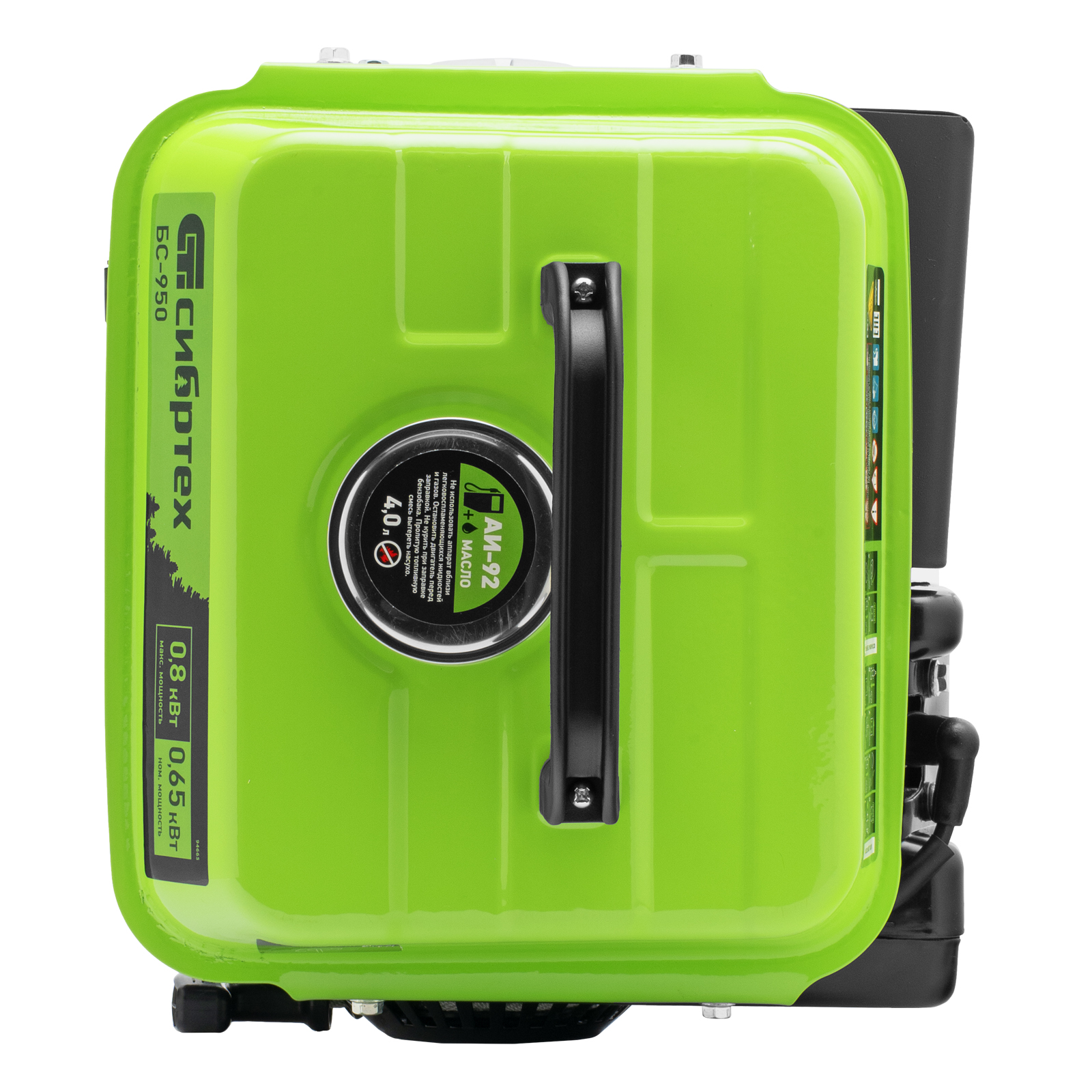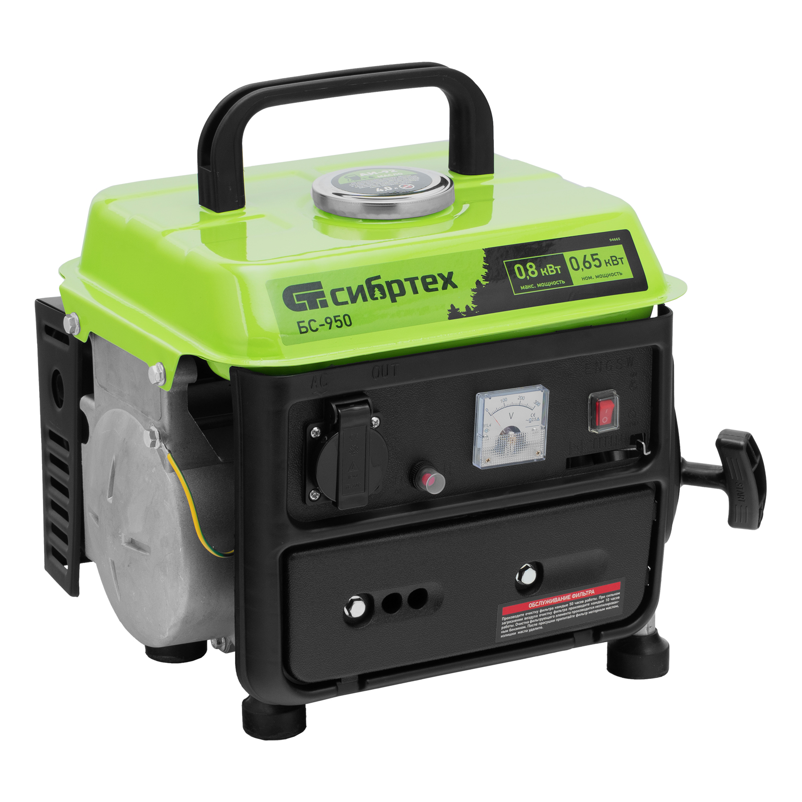 Бензиновый генератор Сибртех БС-950 94665 на 230 В, мощностью 0,8 кВТ, с 2-тактным двигателем и ручным стартером, с баком объемом 4 л, отличается небольшими габаритами, что делает его незаменимым на природе, на рыбалке, на даче или в гараже. Мощности 0,8 кВт достаточно для подключения электроинструмента или приборов с небольшим уровнем потребления энергии. На одной заправке генератор способен проработать до 4 часов.