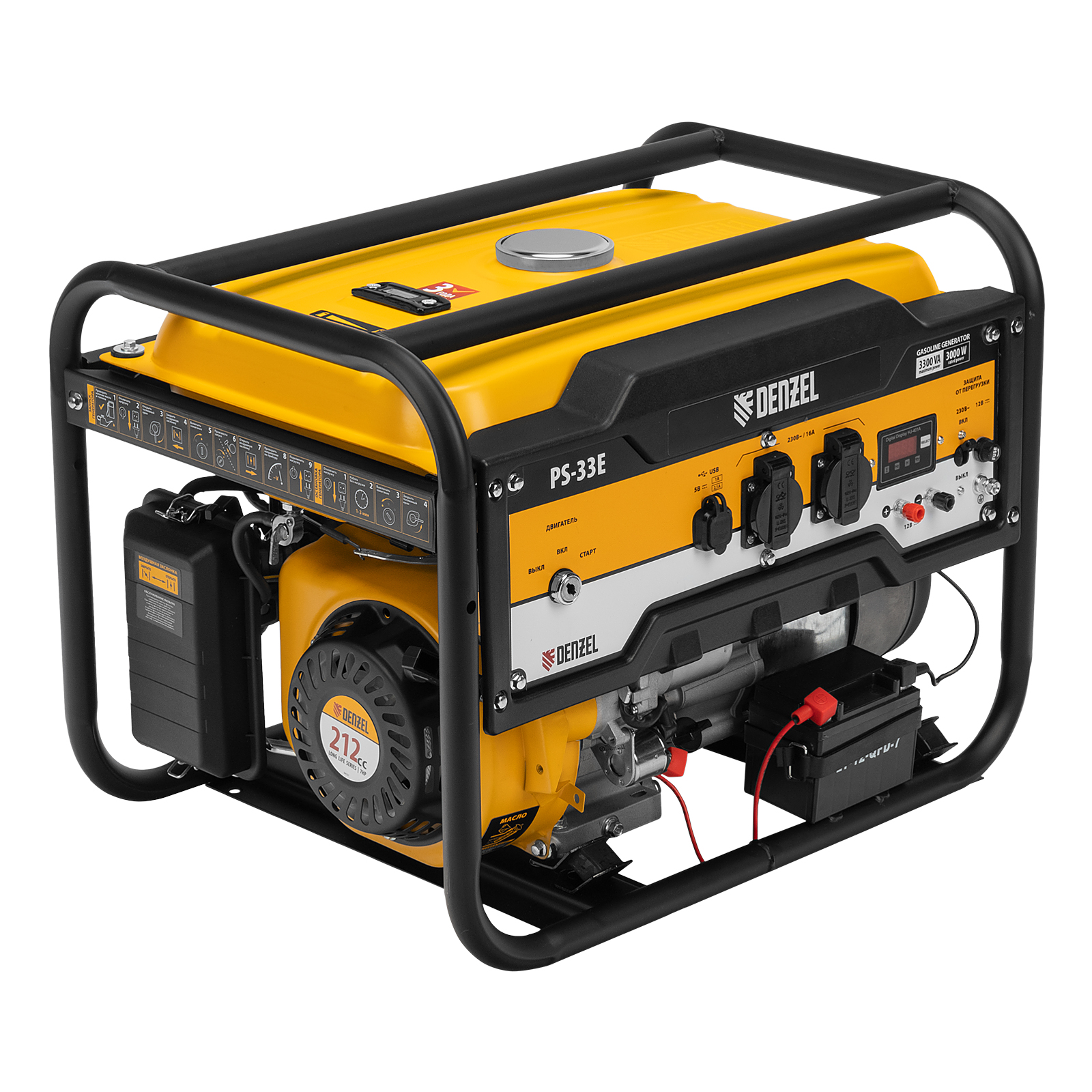 Генератор бензиновый Denzel PS-33E 94537 с электростартером, мощностью 3,3 кВт, напряжением 230 В, с топливным баком объемом 15 л, предназначен для автономного обеспечения бытовой техники и инструментов электрической энергией. Отлично подойдет для использования в загородном доме или для выездных мероприятий в качестве резервного источника питания. Мощный и экономичный двигатель позволяет подключать электроприборы суммарной мощностью до 3,3 кВт, потребляя всего 1,15 литров топлива АИ-92 за 1 час работы.