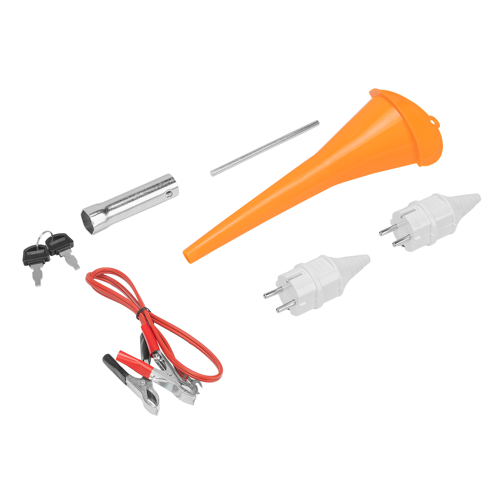 Полная готовность к работе — в комплект входят аккумулятор, свечной ключ, 2 вилки 230В/16А и 2 ключа зажигания.
