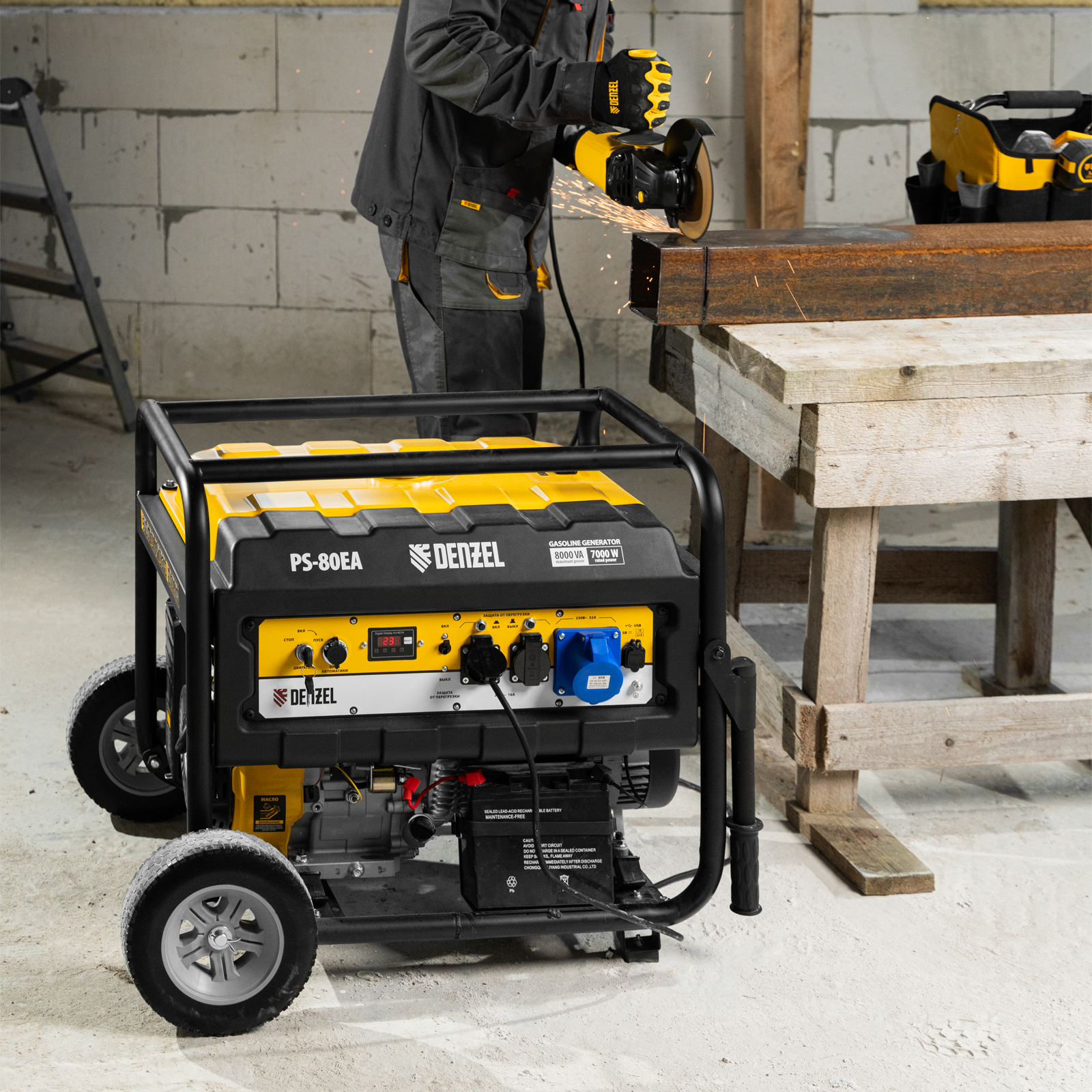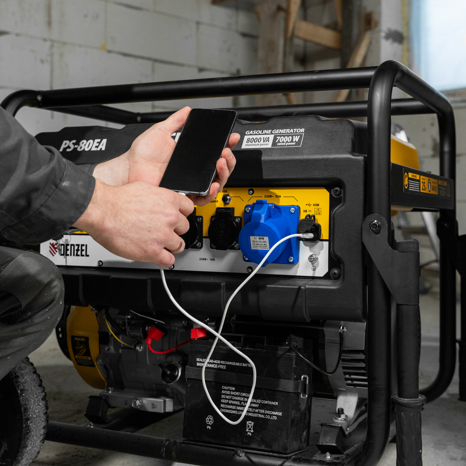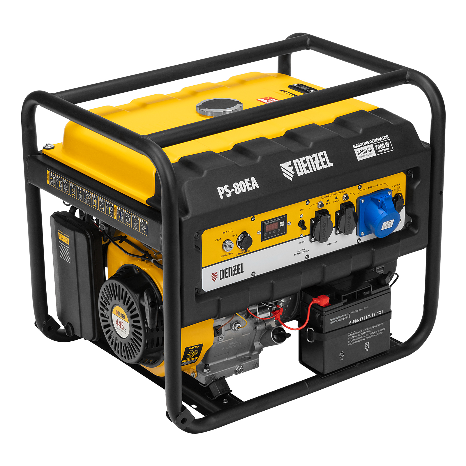 Бензиновый генератор Denzel PS 80 EA 946924 с коннектором автоматики и электростартером имеет бак объемом 25 л, поддерживает напряжение в сети 230 В и обеспечивает электропитанием потребителей суммарной мощностью до 8,0 кВт. Подходит для подключения мощных электроинструментов и бытовых приборов, незаменим в условиях отсутствия электричества. Выход постоянного тока USB 5 В позволяет использовать генератор для зарядки смартфона, планшета и других мобильных устройств.