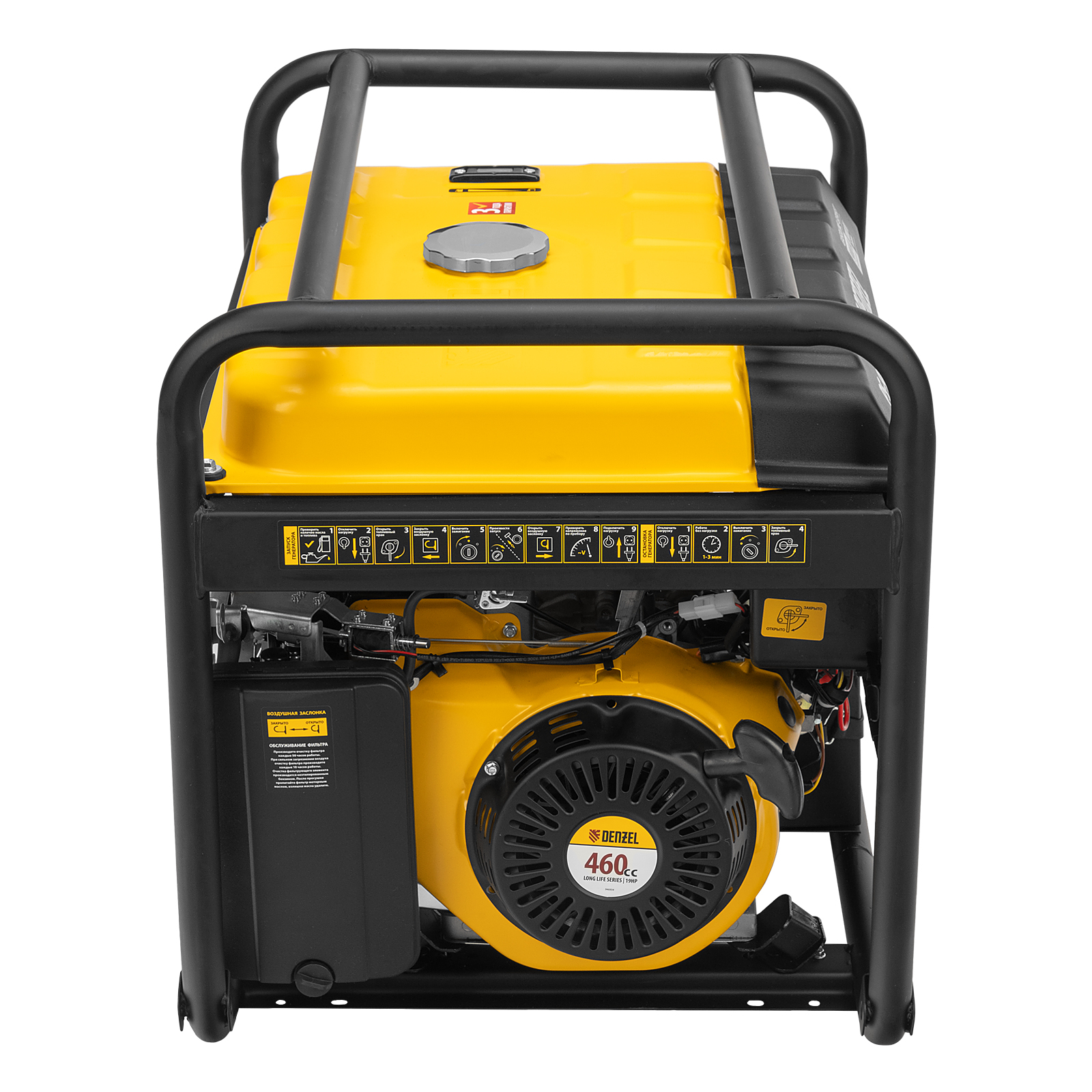 - Дополнительные возможности — на генератор можно установить транспортировочный комплект Denzel 946725 (приобретается отдельно) для удобного перемещения генератора по рабочей площадке.