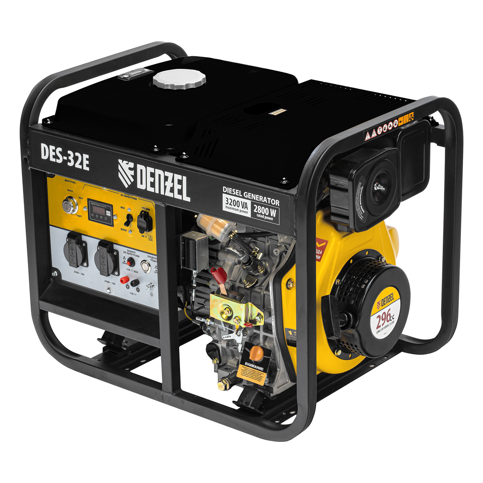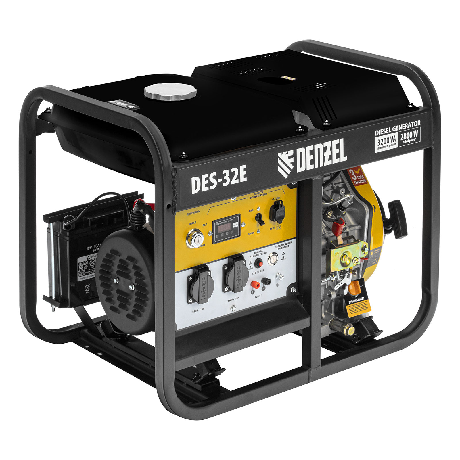 Генератор дизельный Denzel DES-32E 94412 с объемом топливного бака 11 л, с электростартером, имеет максимальную выходную мощность 3,2 кВт и поддерживает напряжение в сети 230 В. Используется для снабжения энергией потребителей однофазного тока (осветительных приборов, бытовой техники, электроинструмента) при отсутствии доступа к стационарному источнику питания. Для подключения электроприборов служат 2 розетки 230 В/16 А. Клеммы постоянного тока 12 В позволяют заряжать автомобильные аккумуляторы, а двойной выход USB 5 В предназначен для подключения мобильных устройств (планшетов, смартфонов и т. д.). Генератор пригодится в загородном доме.