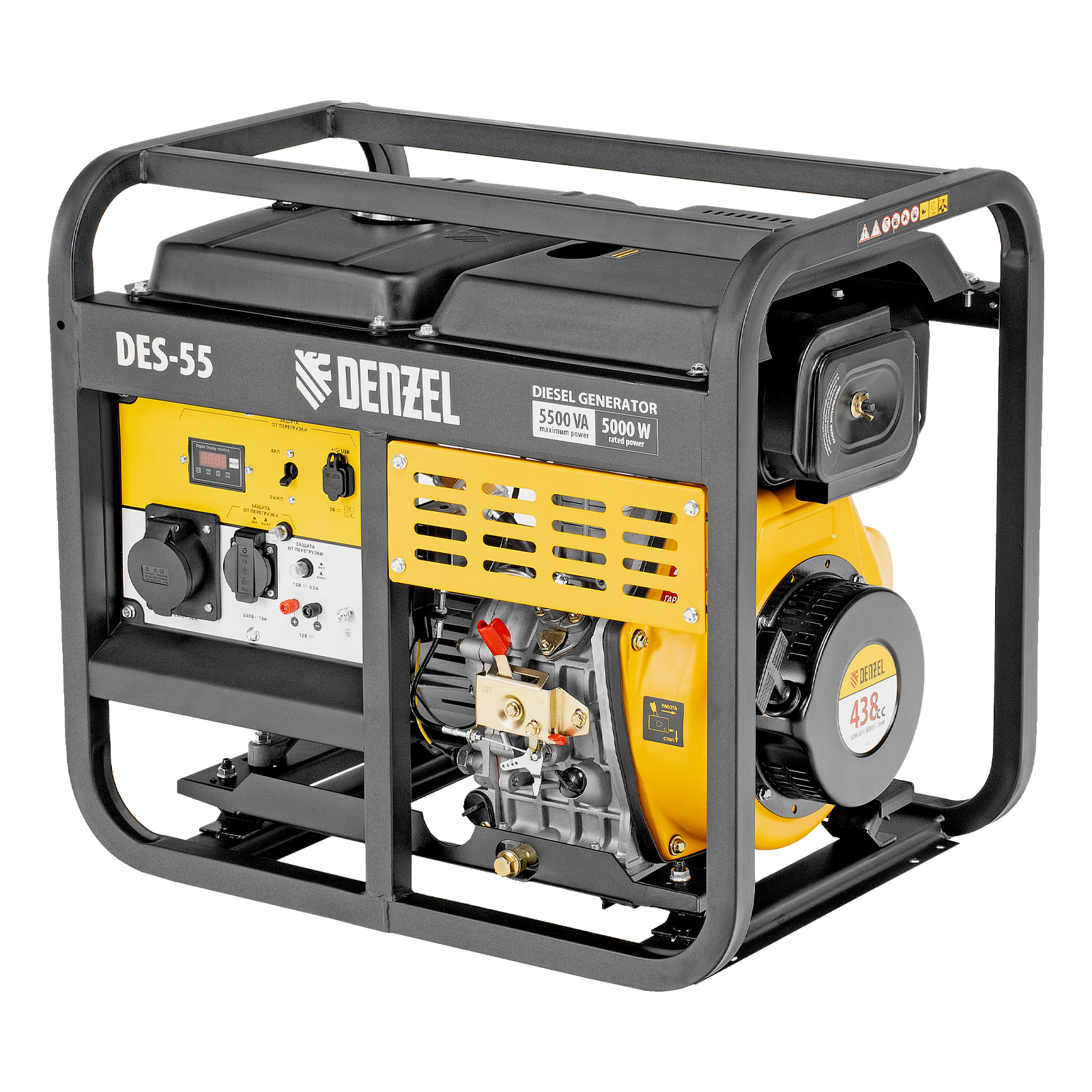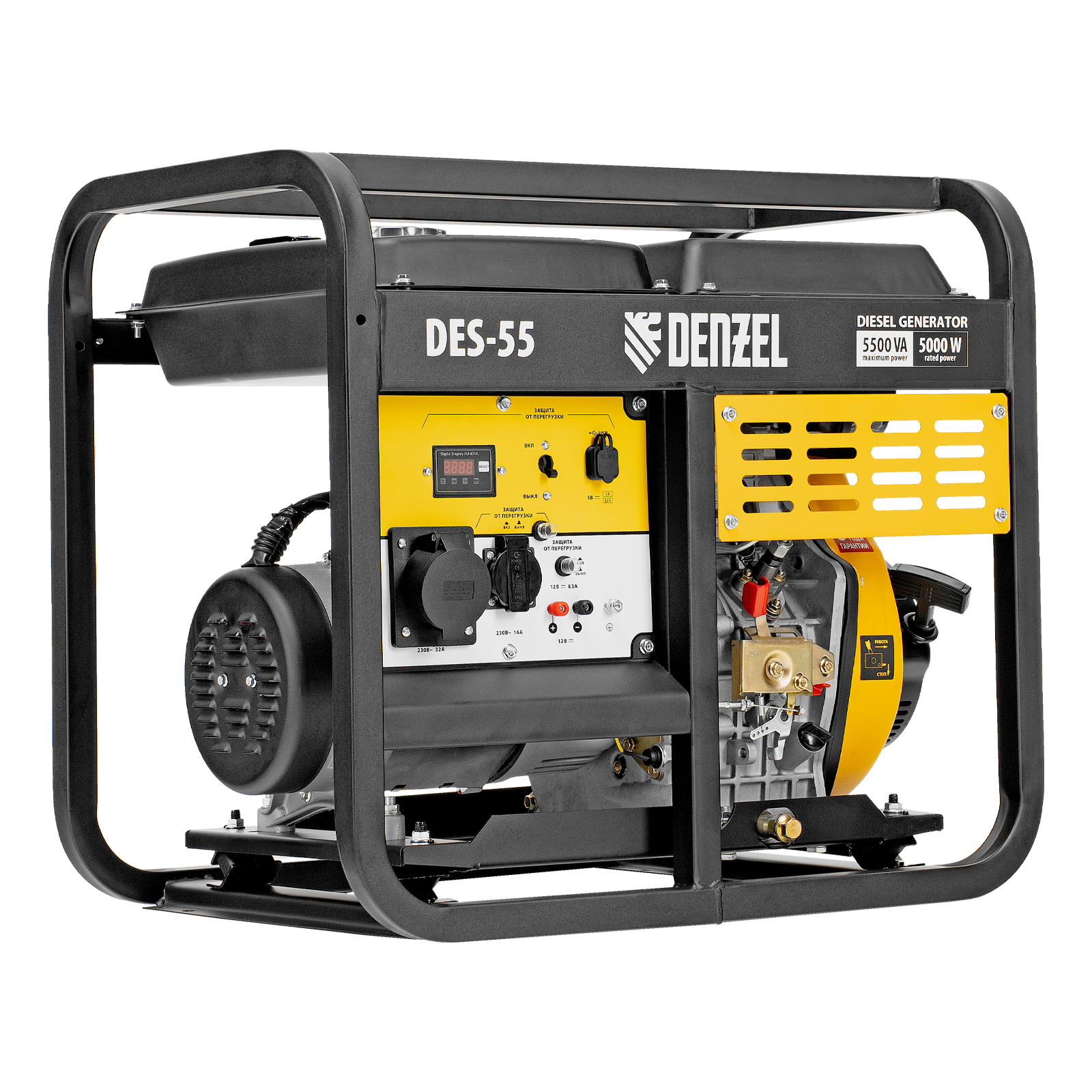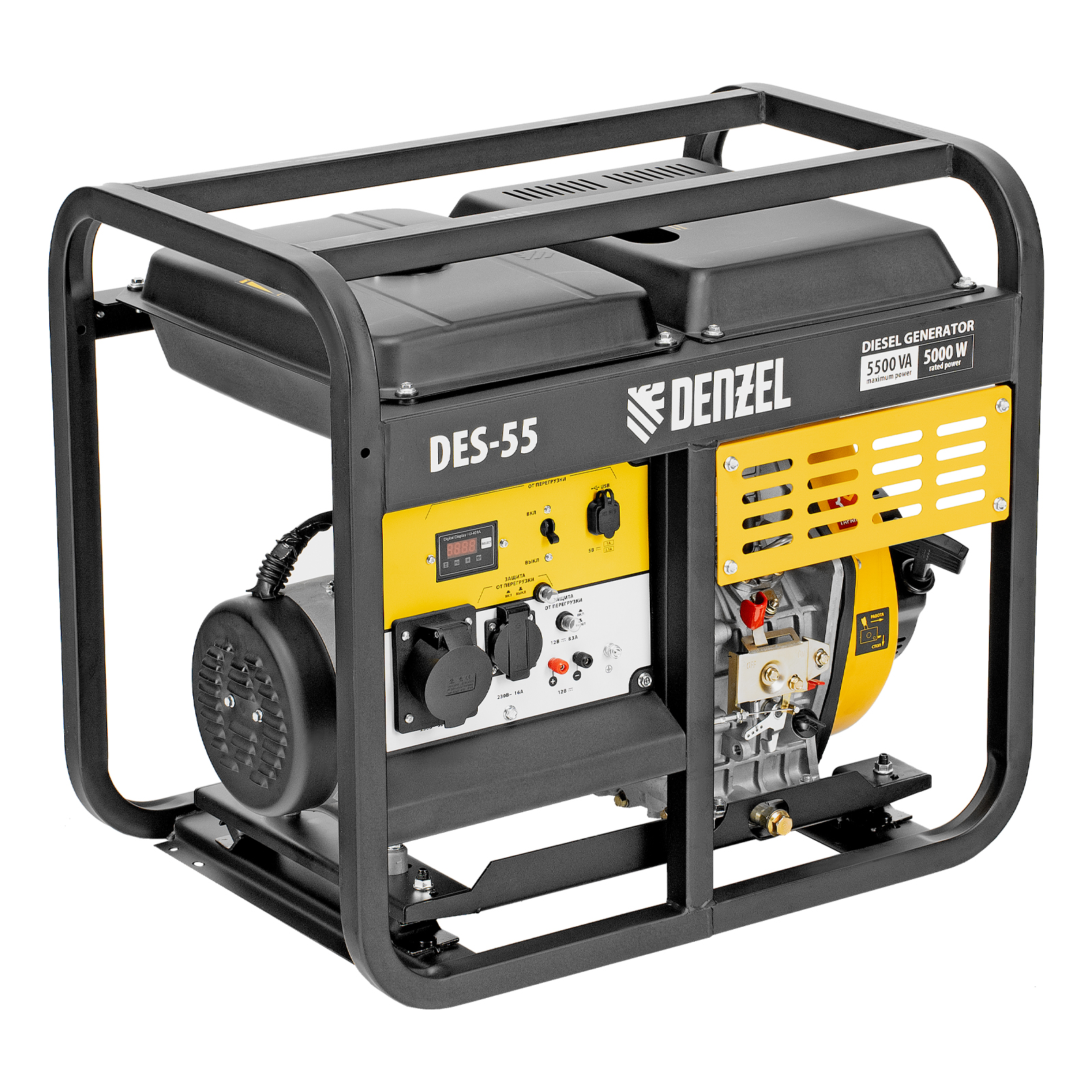 Генератор дизельный Denzel DES-55 94413 с объемом топливного бака 11 л, с ручным стартером, имеет максимальную выходную мощность 5,5 кВт и поддерживает напряжение в сети 230 В. Используется для снабжения энергией потребителей однофазного тока (осветительных приборов, бытовой техники, электроинструмента) при отсутствии доступа к стационарному источнику питания. Для подключения электроприборов служат 2 розетки: 230 В/16 А и 230 В/32 А. Клеммы постоянного тока 12 В позволяют заряжать автомобильные аккумуляторы, а двойной выход USB 5 В предназначен для подключения мобильных устройств (планшетов, смартфонов и т. д.). Генератор пригодится на строительной площадке и в загородном доме.