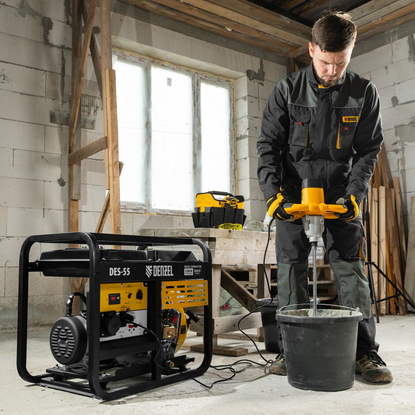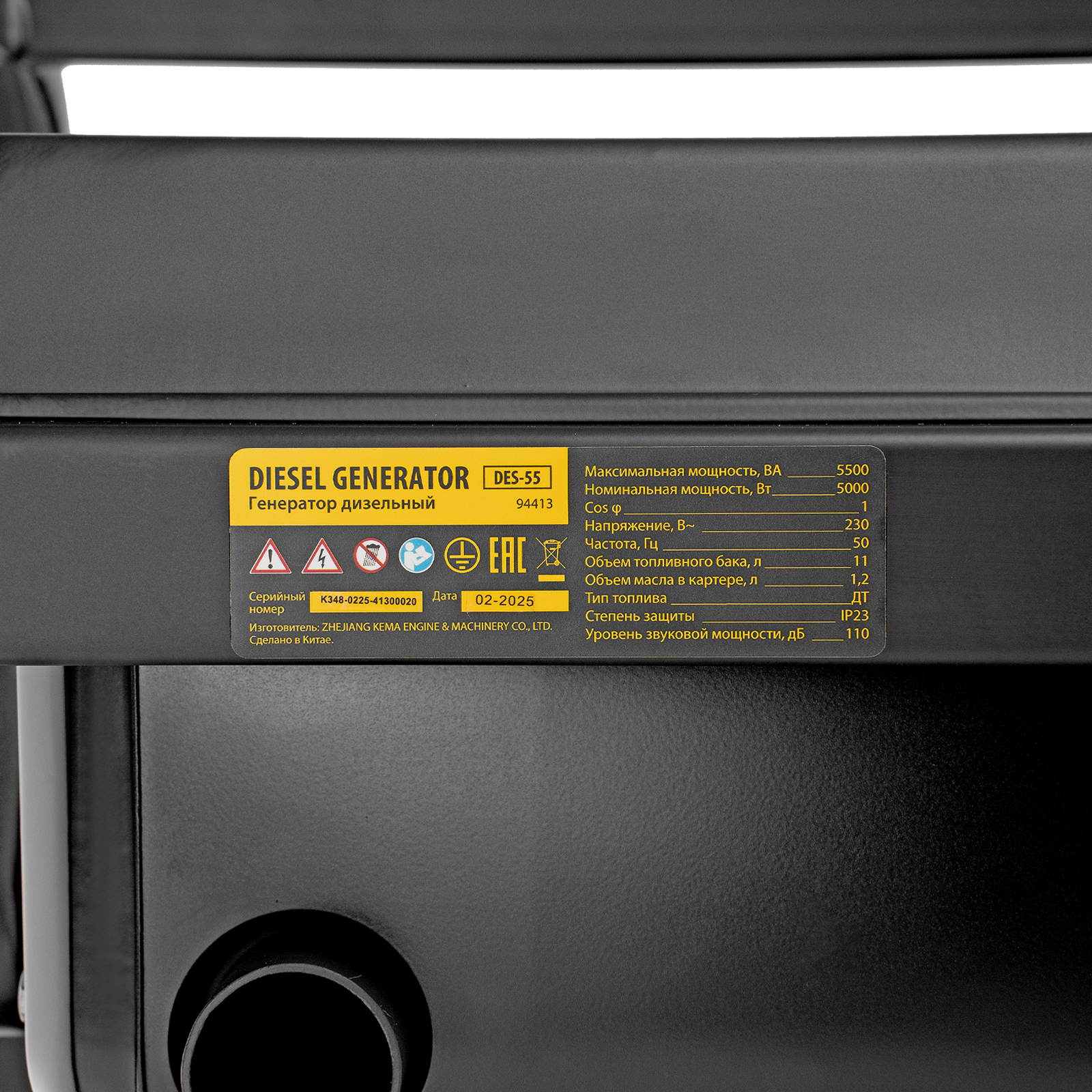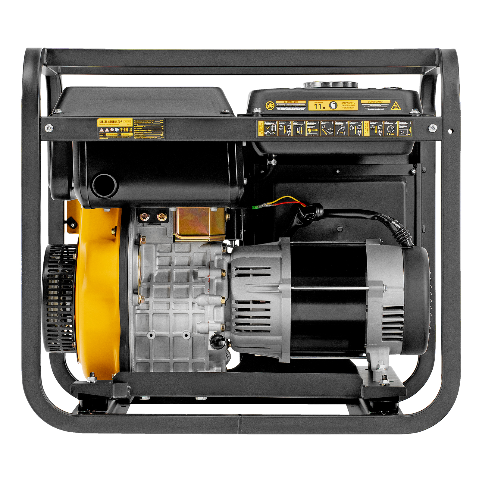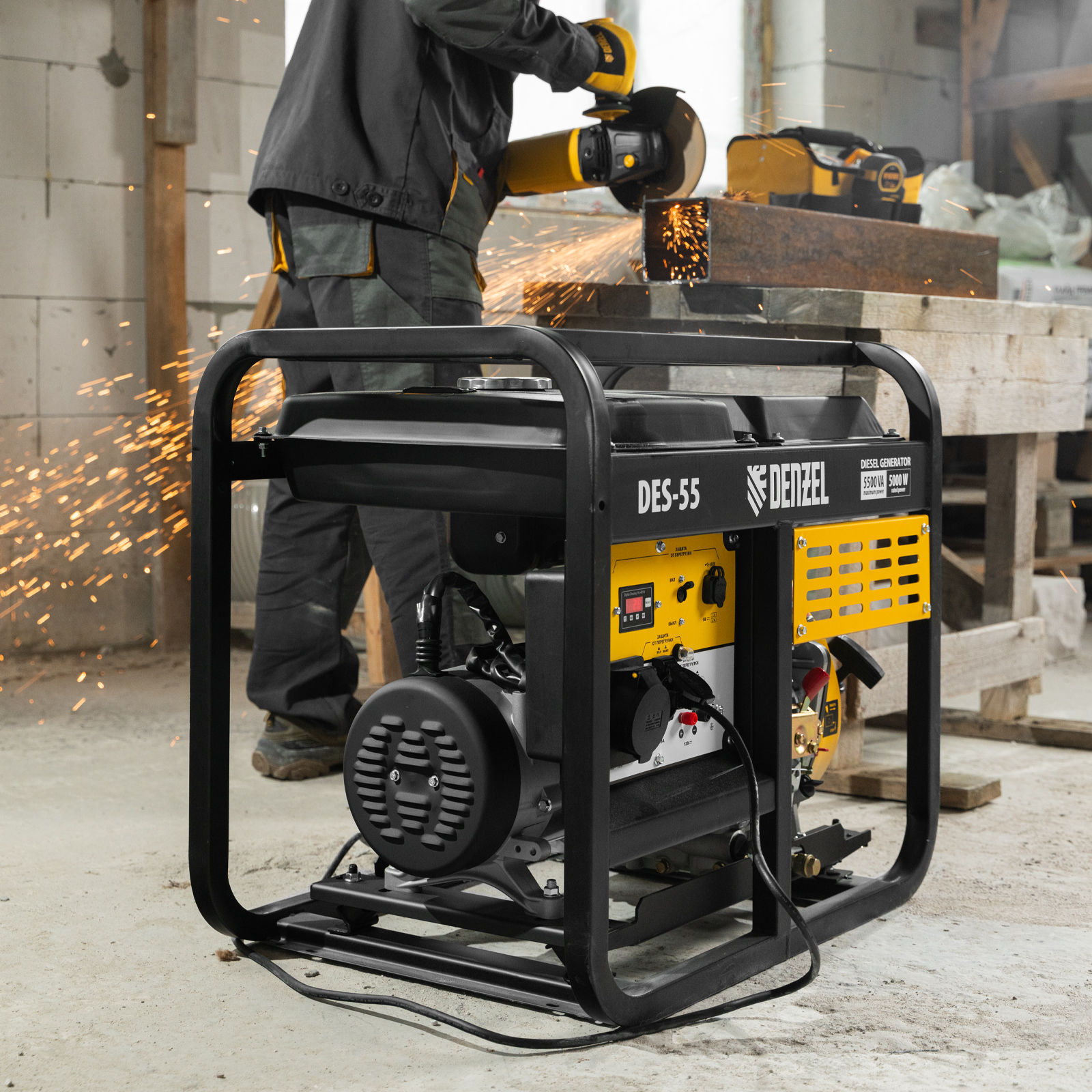 Генератор дизельный Denzel DES-55 94413 с объемом топливного бака 11 л, с ручным стартером, имеет максимальную выходную мощность 5,5 кВт и поддерживает напряжение в сети 230 В. Используется для снабжения энергией потребителей однофазного тока (осветительных приборов, бытовой техники, электроинструмента) при отсутствии доступа к стационарному источнику питания. Для подключения электроприборов служат 2 розетки: 230 В/16 А и 230 В/32 А. Клеммы постоянного тока 12 В позволяют заряжать автомобильные аккумуляторы, а двойной выход USB 5 В предназначен для подключения мобильных устройств (планшетов, смартфонов и т. д.). Генератор пригодится на строительной площадке и в загородном доме.