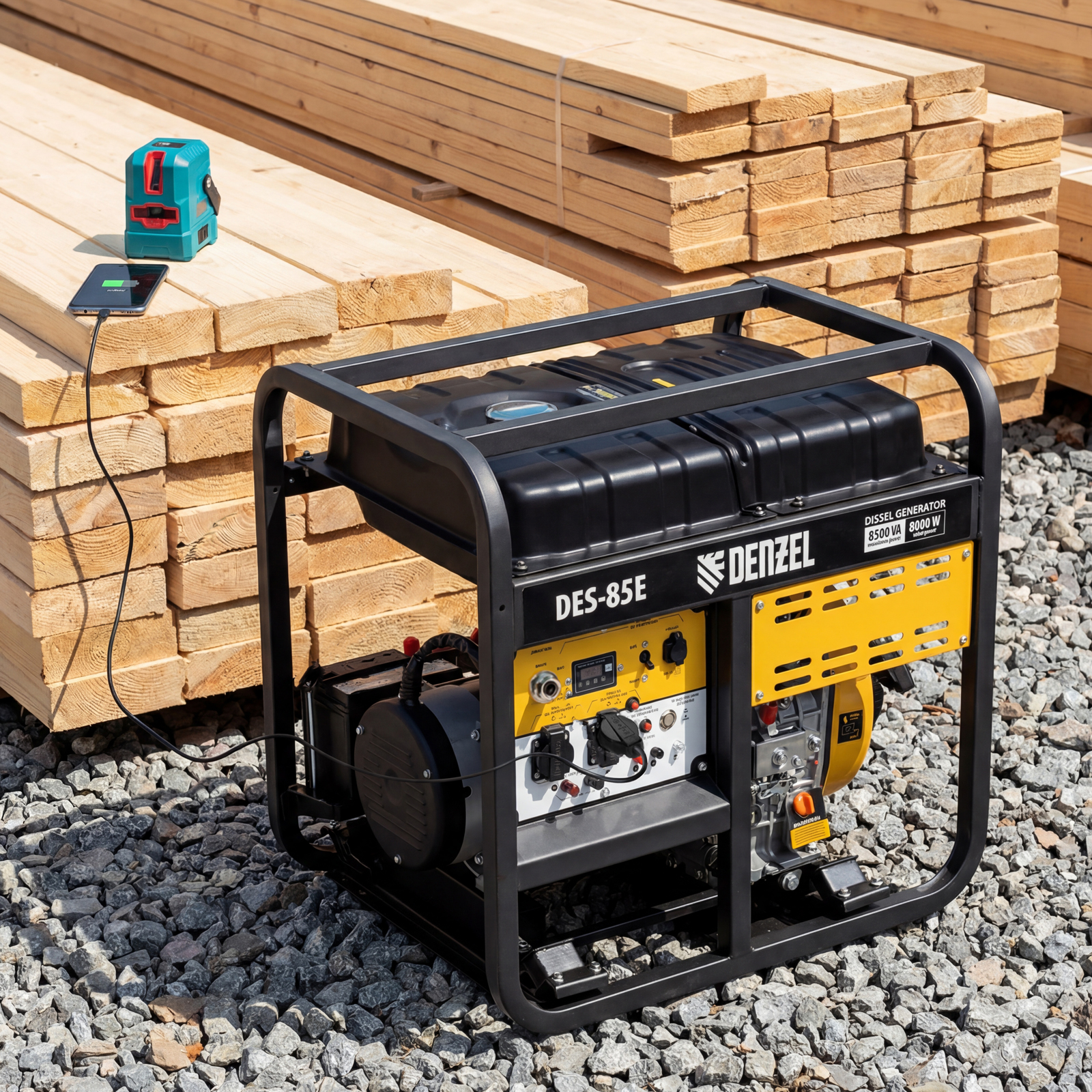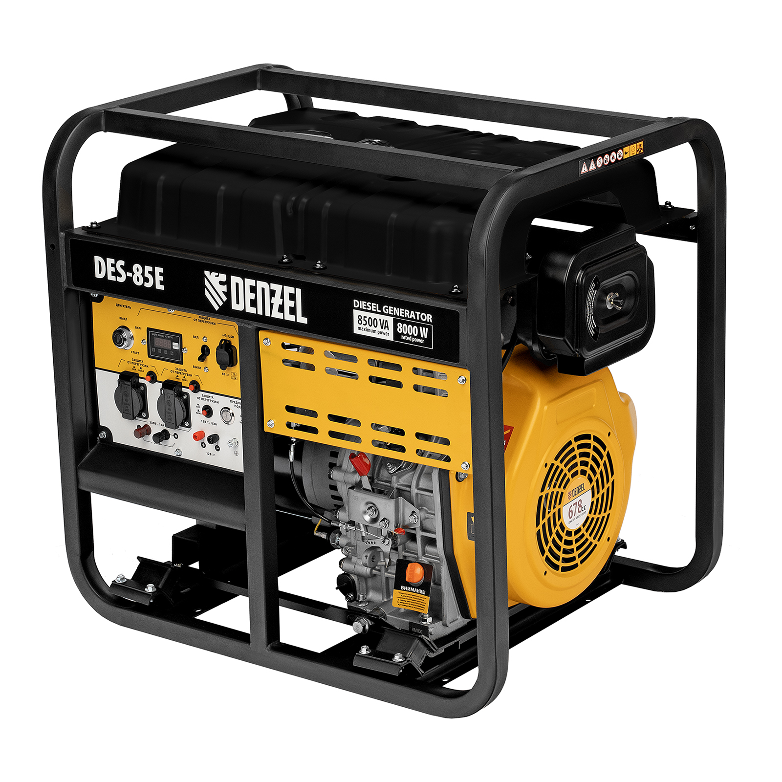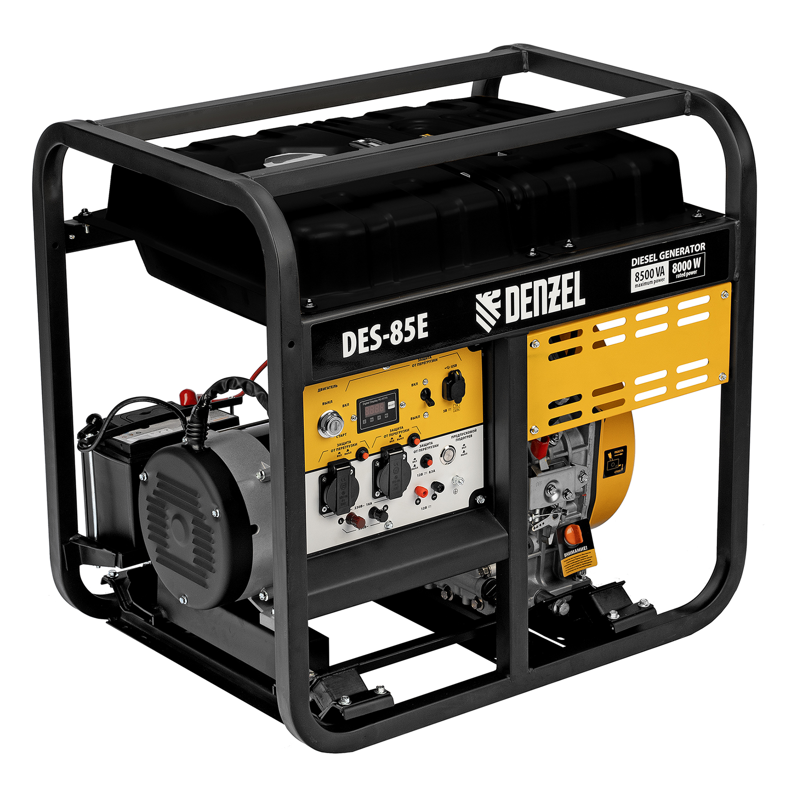 Генератор дизельный Denzel DES-85E 94415 с объемом топливного бака 16 л, с электростартером, имеет максимальную выходную мощность 8,5 кВт и поддерживает напряжение в сети 230 В. Используется для снабжения энергией потребителей однофазного тока (осветительных приборов, бытовой техники, электроинструмента) при отсутствии доступа к стационарному источнику питания. Для подключения электроприборов служат 2 розетки 230 В/16 А. Силовые клеммы позволяют снять полную мощность. Клеммы постоянного тока 12 В позволяют заряжать автомобильные аккумуляторы, а двойной выход USB 5 В предназначен для подключения мобильных устройств (планшетов, смартфонов и т. д.). Генератор пригодится в загородном доме.