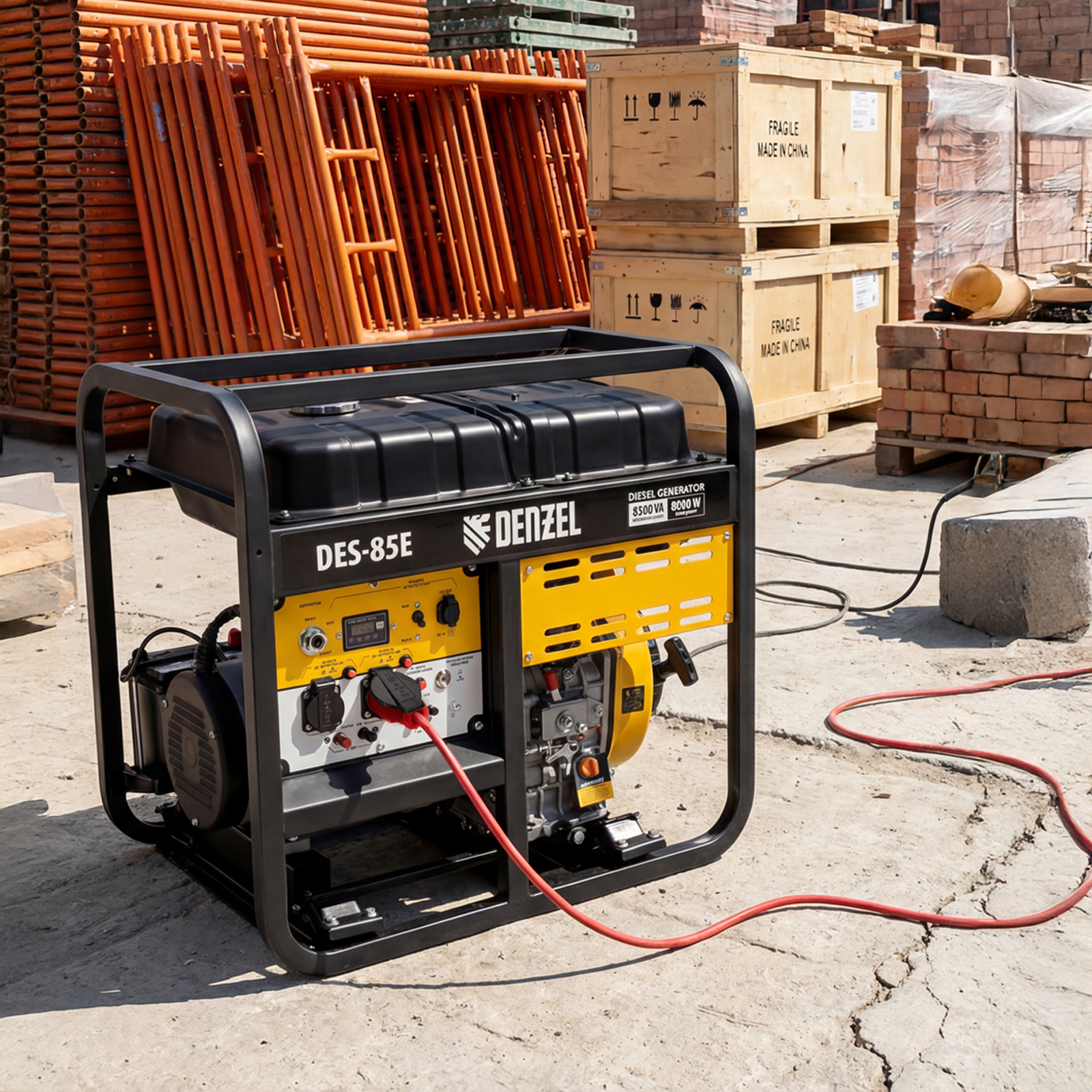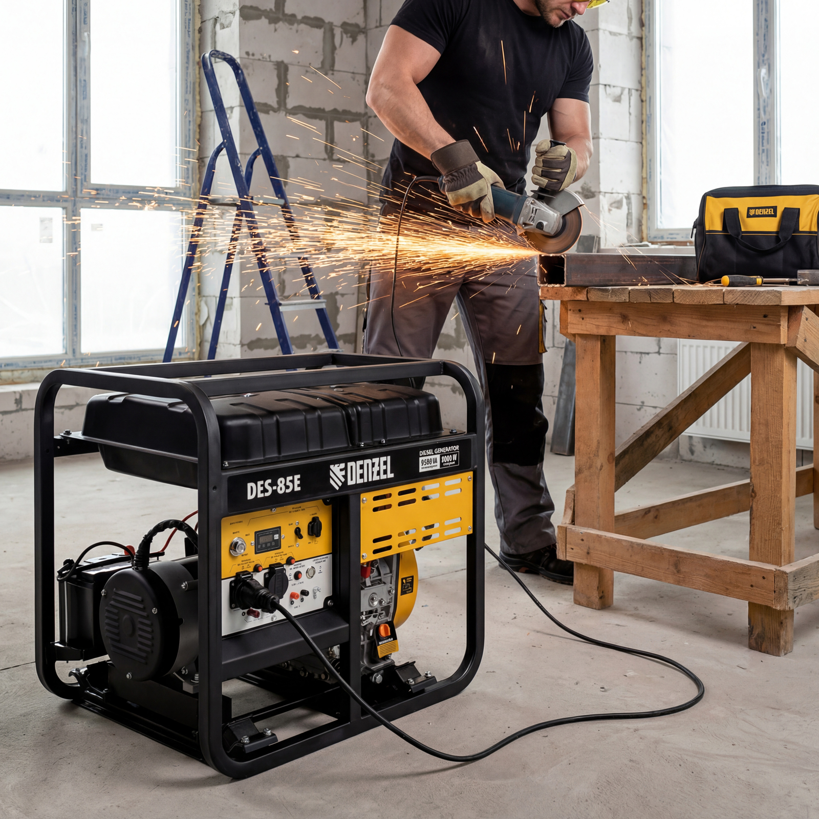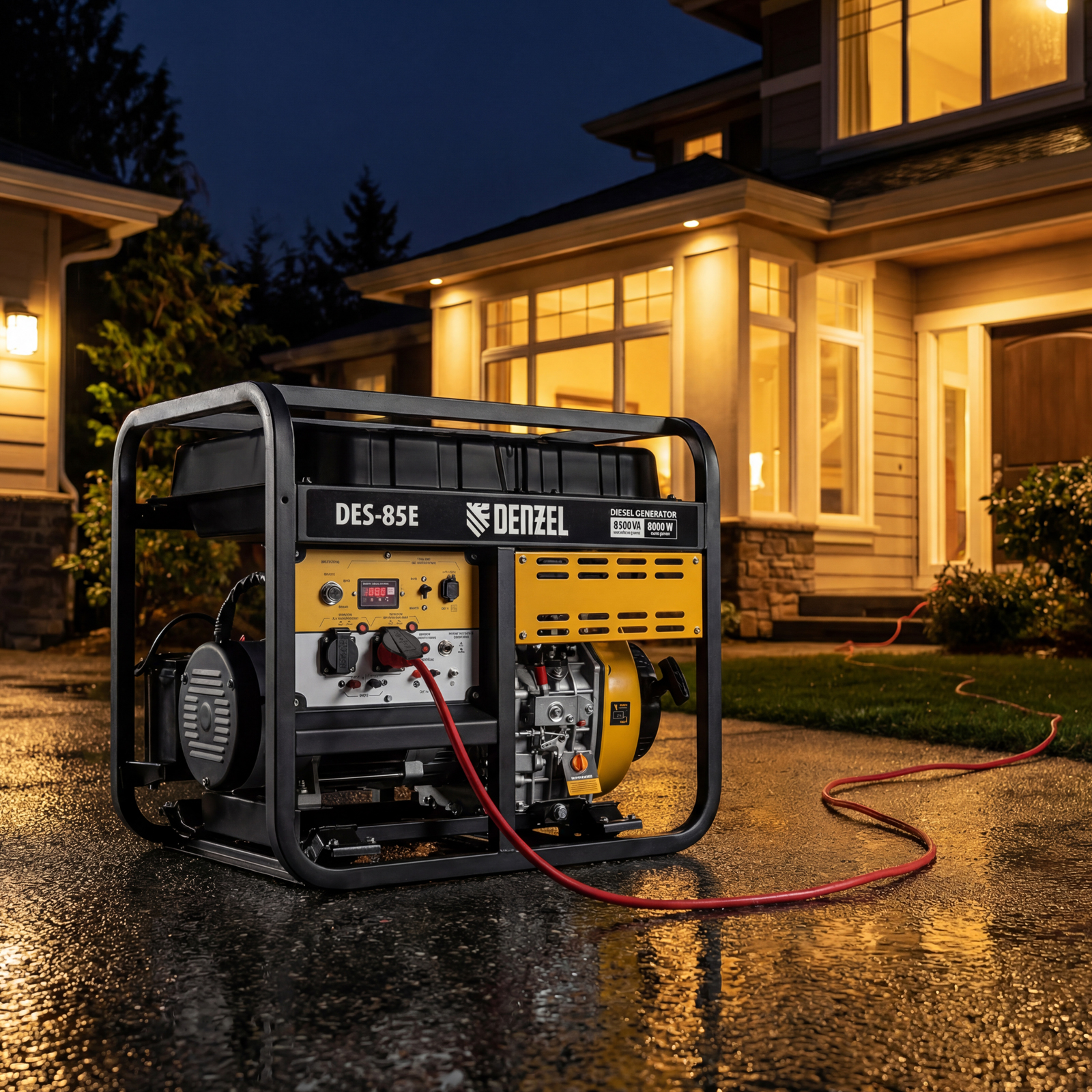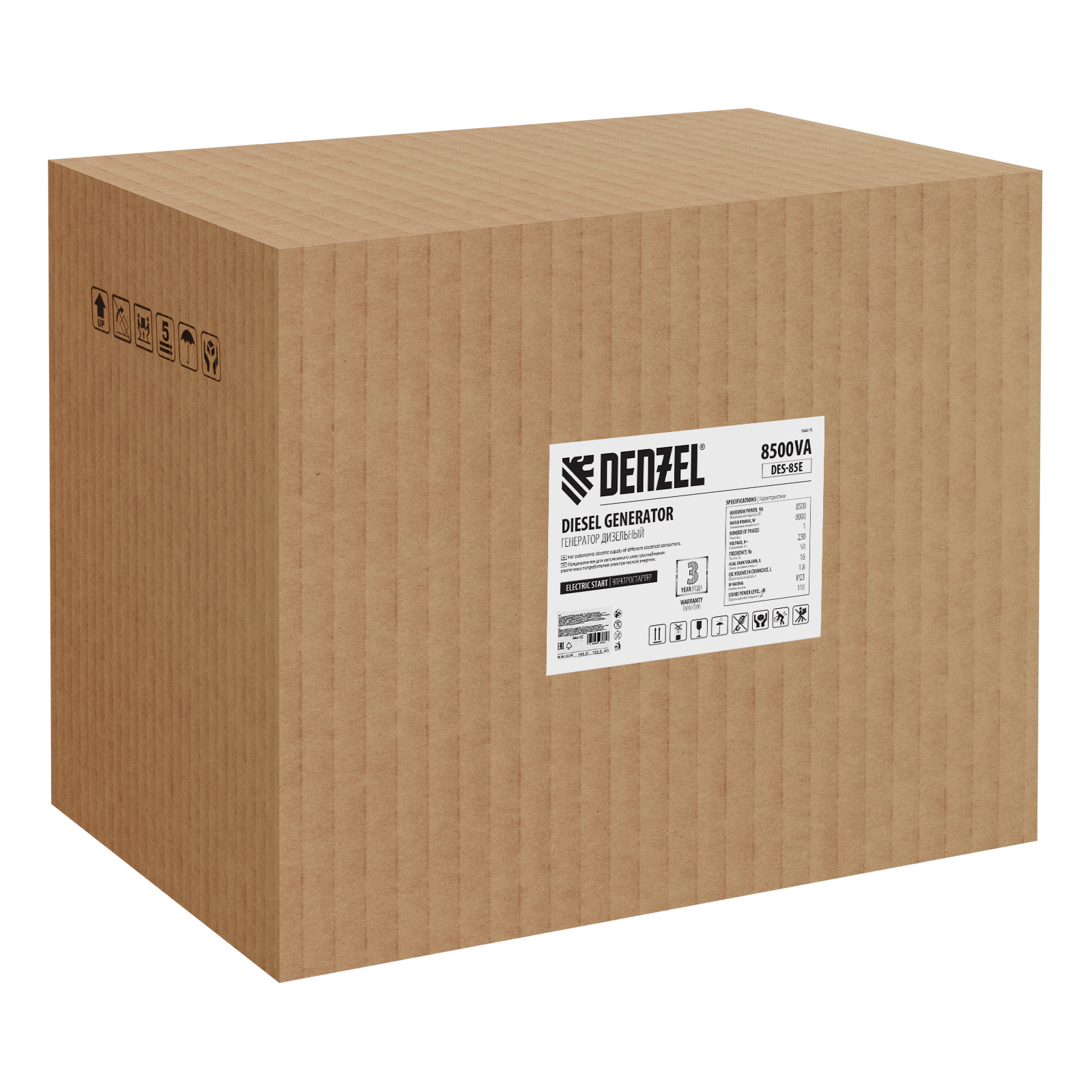 Генератор дизельный Denzel DES-85E 94415 с объемом топливного бака 16 л, с электростартером, имеет максимальную выходную мощность 8,5 кВт и поддерживает напряжение в сети 230 В. Используется для снабжения энергией потребителей однофазного тока (осветительных приборов, бытовой техники, электроинструмента) при отсутствии доступа к стационарному источнику питания. Для подключения электроприборов служат 2 розетки 230 В/16 А. Силовые клеммы позволяют снять полную мощность. Клеммы постоянного тока 12 В позволяют заряжать автомобильные аккумуляторы, а двойной выход USB 5 В предназначен для подключения мобильных устройств (планшетов, смартфонов и т. д.). Генератор пригодится в загородном доме.