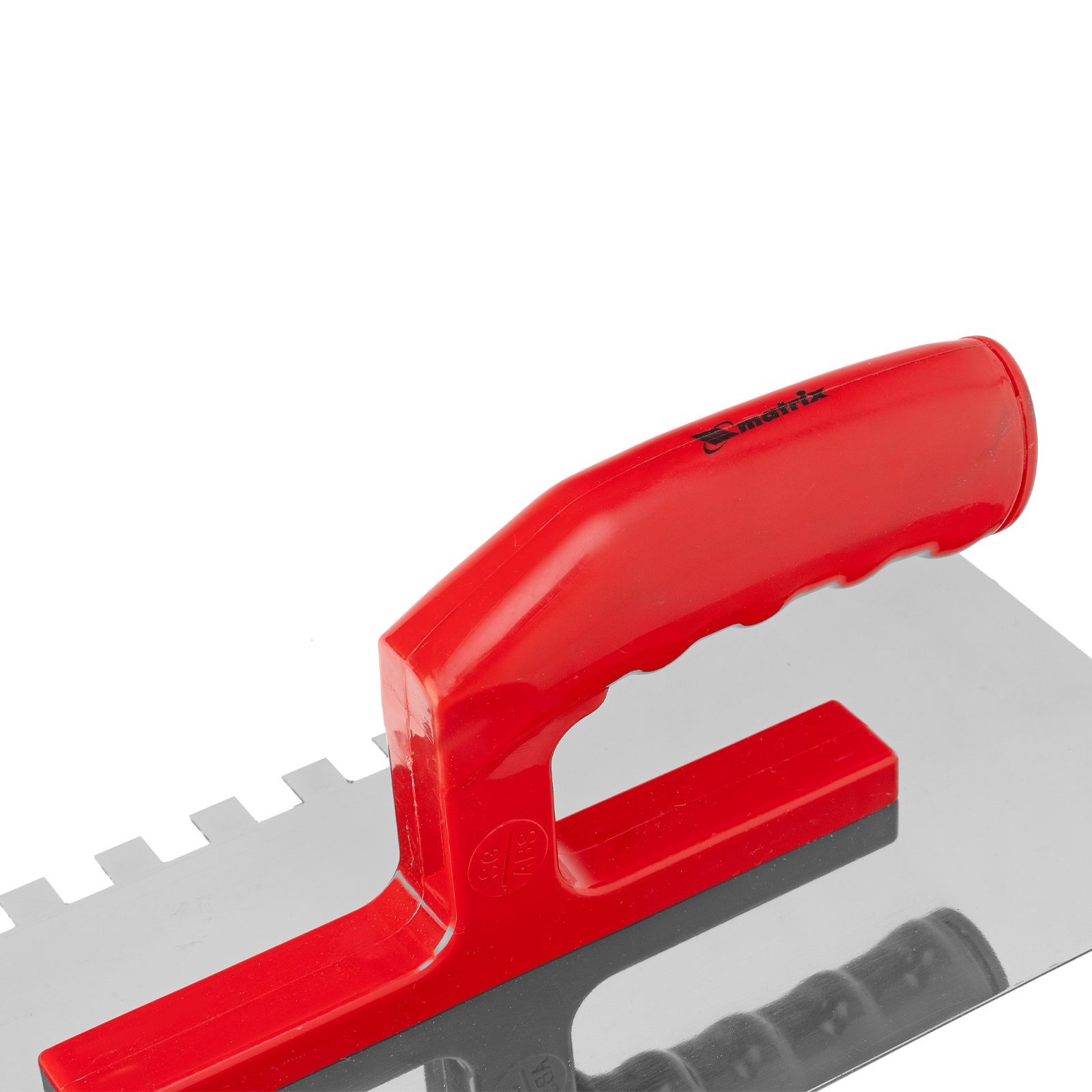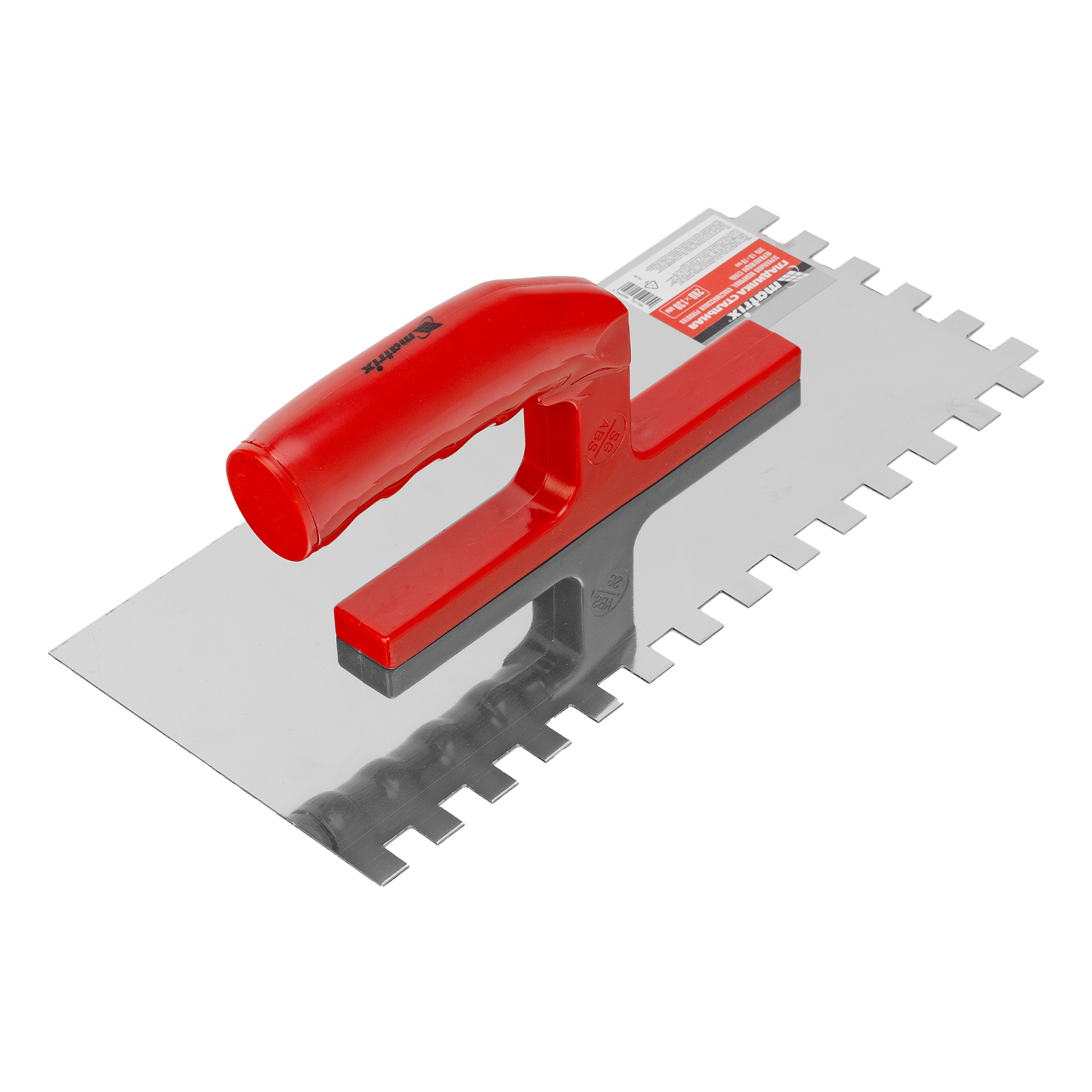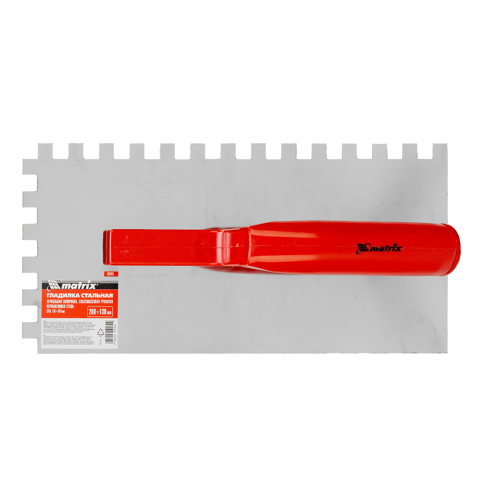 Гладилка Matrix 86783 размером 280 x 130 мм, из нержавеющей стали, с зубьями 10 x 10 мм, зеркальной полировкой и пластмассовой ручкой, пригодится любителям и частным мастерам при проведении ремонтных работ. Она позволяет равномерно наносить строительные растворы и плиточный клей на подготовленные под отделку поверхности.