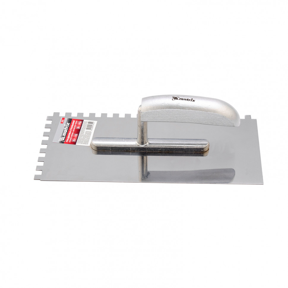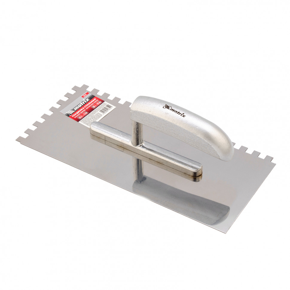 Гладилка Matrix 86739 размером 280 x 130 мм, с зубьями 8 х 8 мм, из нержавеющей стали, с деревянной ручкой, позволяет ровным слоем наносить на поверхности штукатурку и клеевые растворы. Зеркальная полировка снижает риск прилипания материала к полотну, благодаря чему покрытие получается идеально гладким.