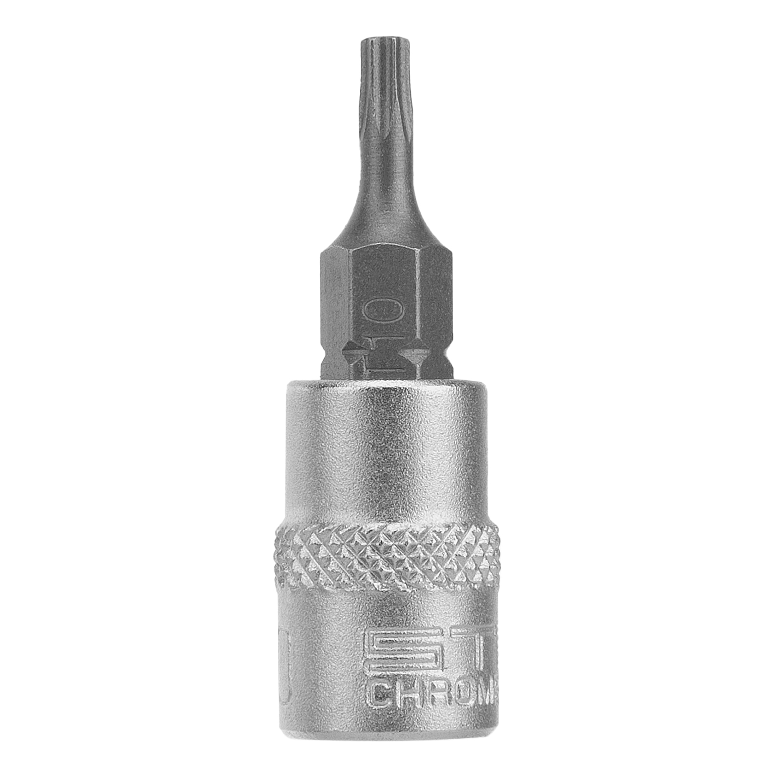 Головка с битой-вставкой T10 Stels 13802, с присоединительным квадратом 1/4 дюйма, из стали CrV, используется для закручивания и выкручивания болтов, гаек и других крепежных элементов с внутренним профилем Torx. Предназначена для работы в гараже, центре техобслуживания автомобилей и ремонтной мастерской.