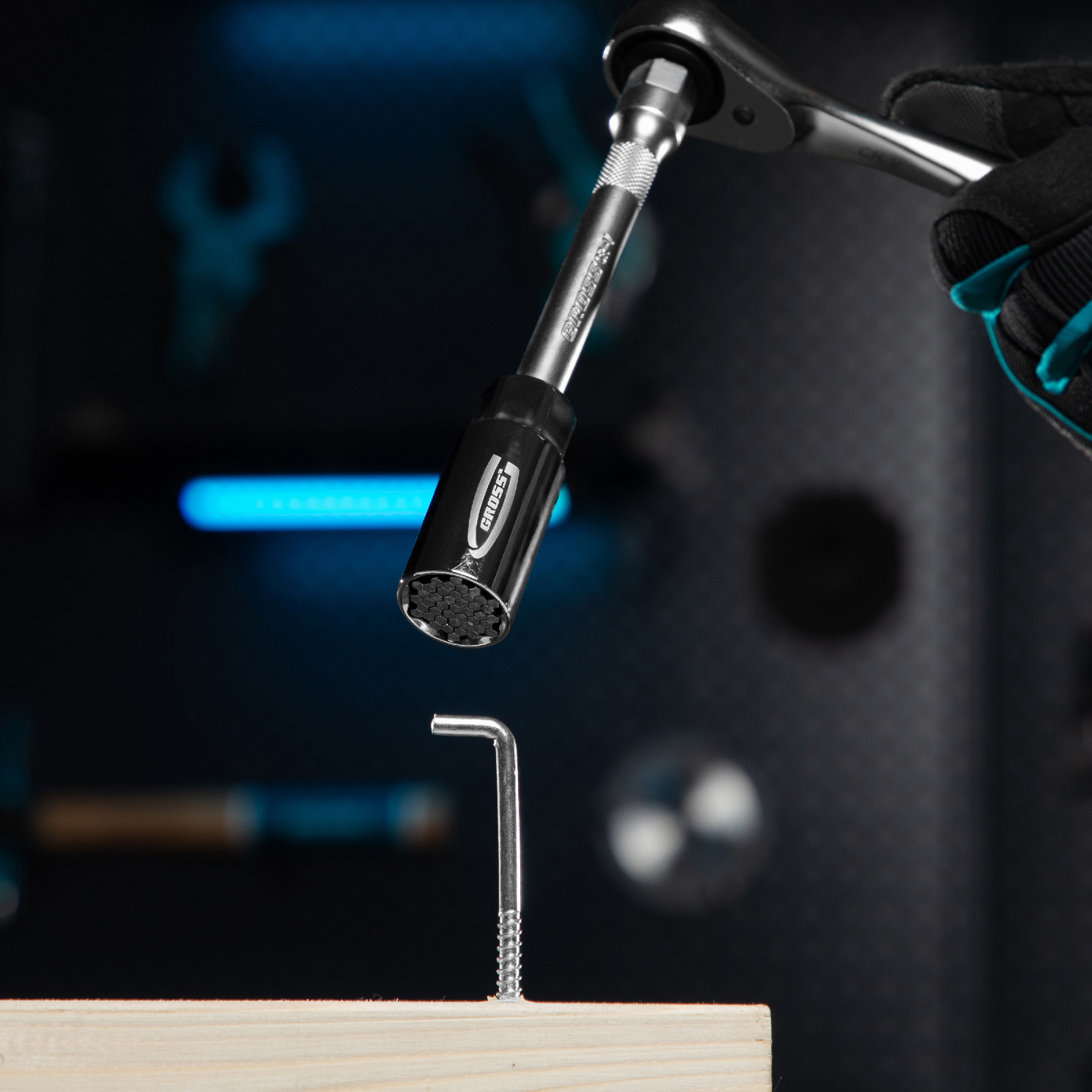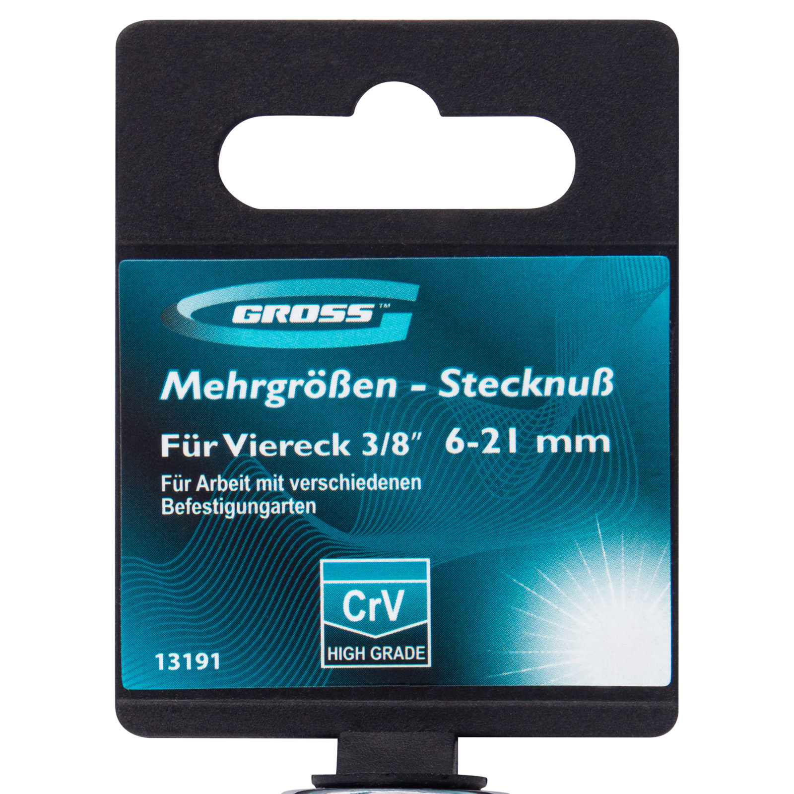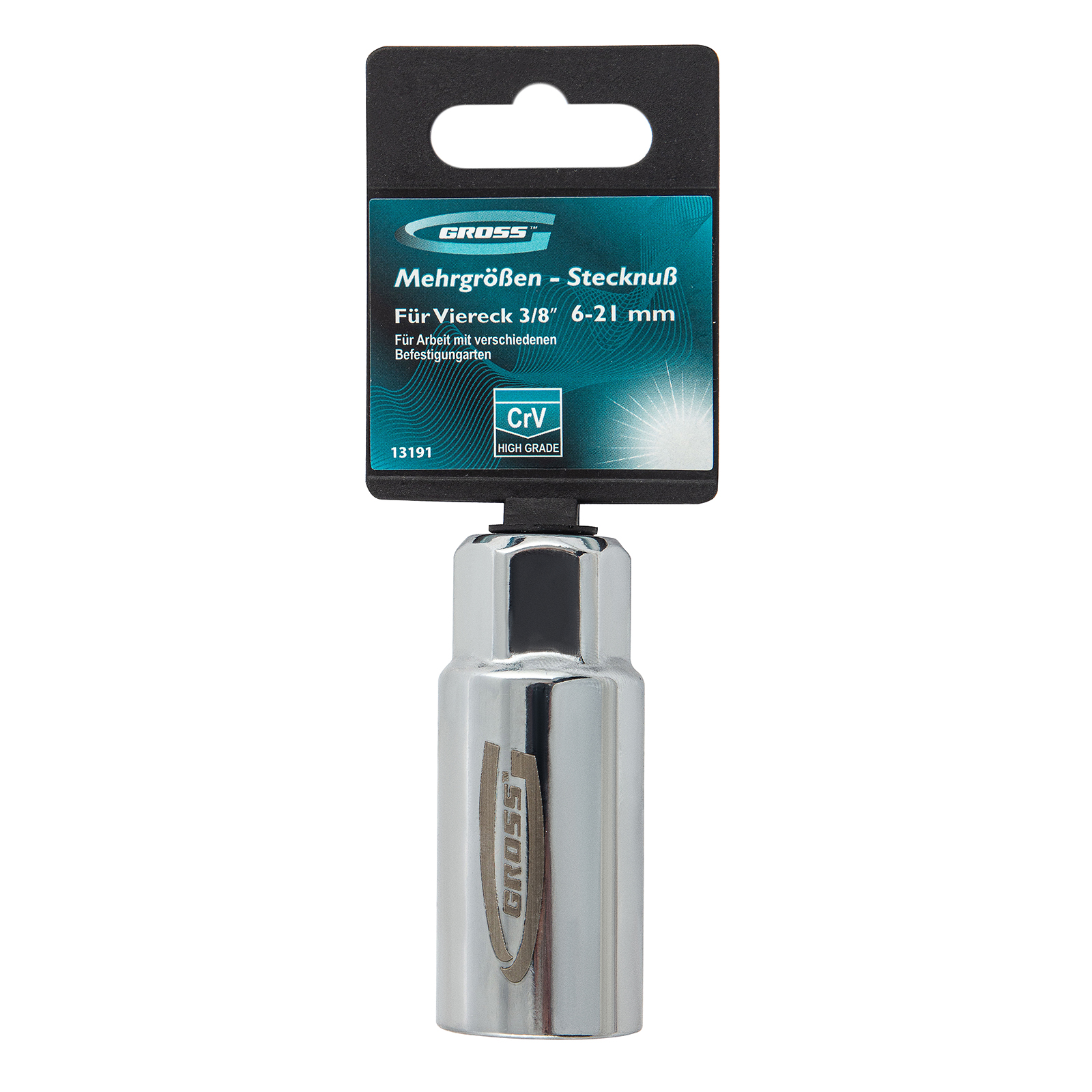 Хромированная торцевая многоразмерная головка Gross 13191 из стали CrV-группы под квадрат 3/8″ применяется для крепежных работ с болтами и гайками размером 6-21 мм. Универсальная многоразмерная конструкция позволяет заменить сразу несколько оснасток. Для работы с многоразмерной головкой понадобится переходник с квадратом 3/8″.