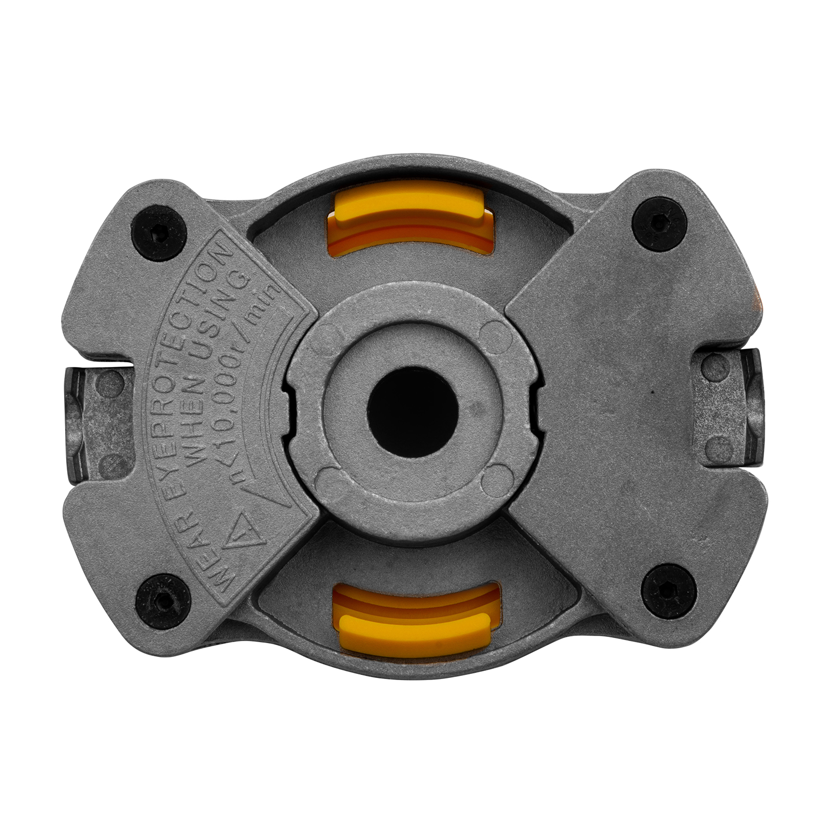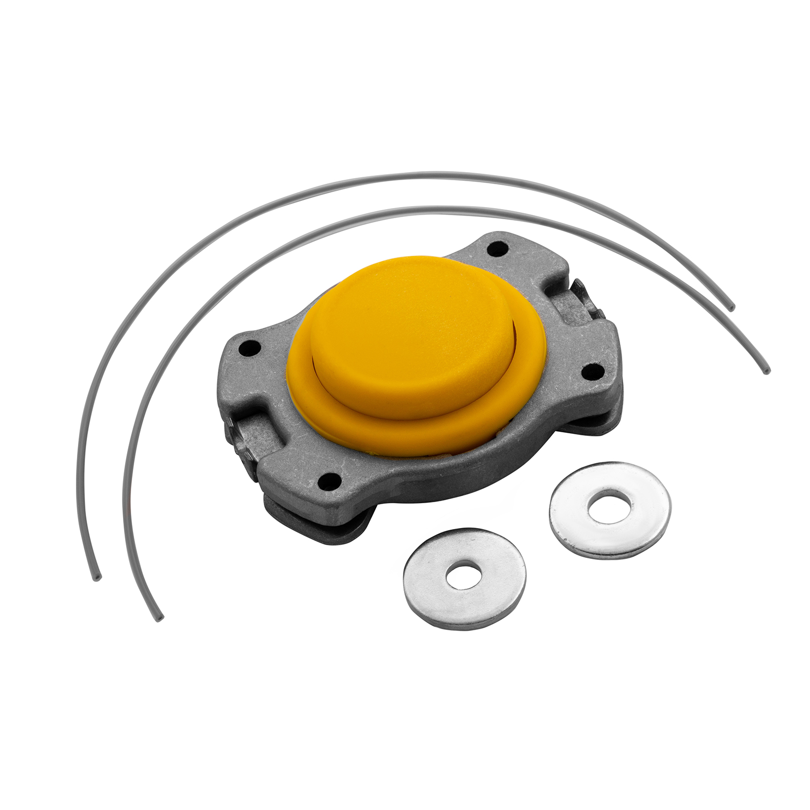 - Универсальность — для установки головки используется штатный крепеж триммера, кроме того, в комплект поставки входят шайбы М8 и М10.