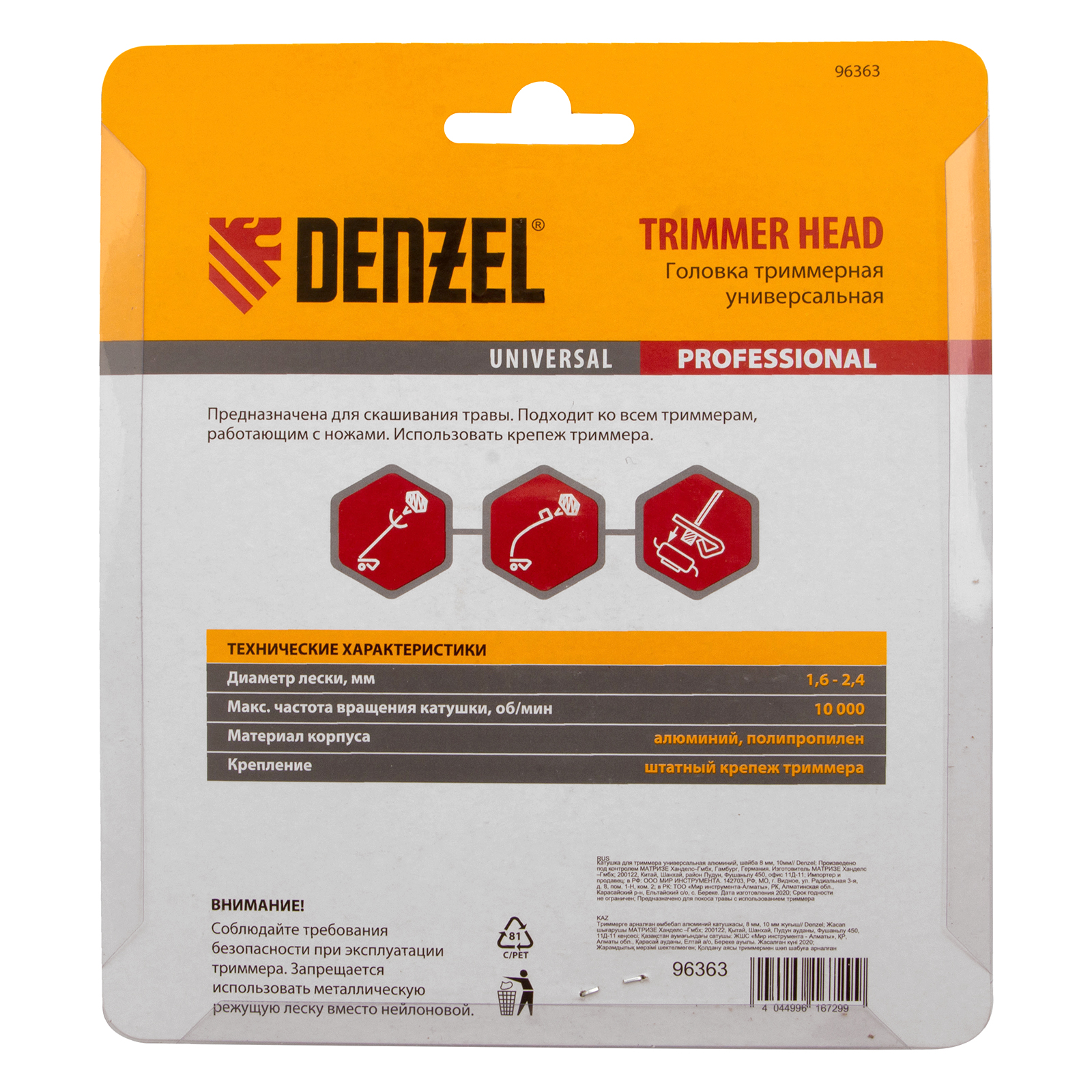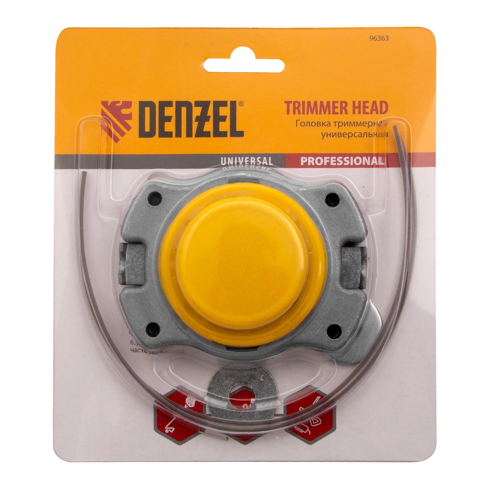 Универсальная триммерная головка Denzel 96363 с корпусом из алюминия и шайбами 8 и 10 мм, совместима с большинством моделей электро- и бензокос. Заправляется режущей леской толщиной до 2,4 мм, что позволяет быстро подравнивать газон и поэтапно срезать траву выше 20 см.