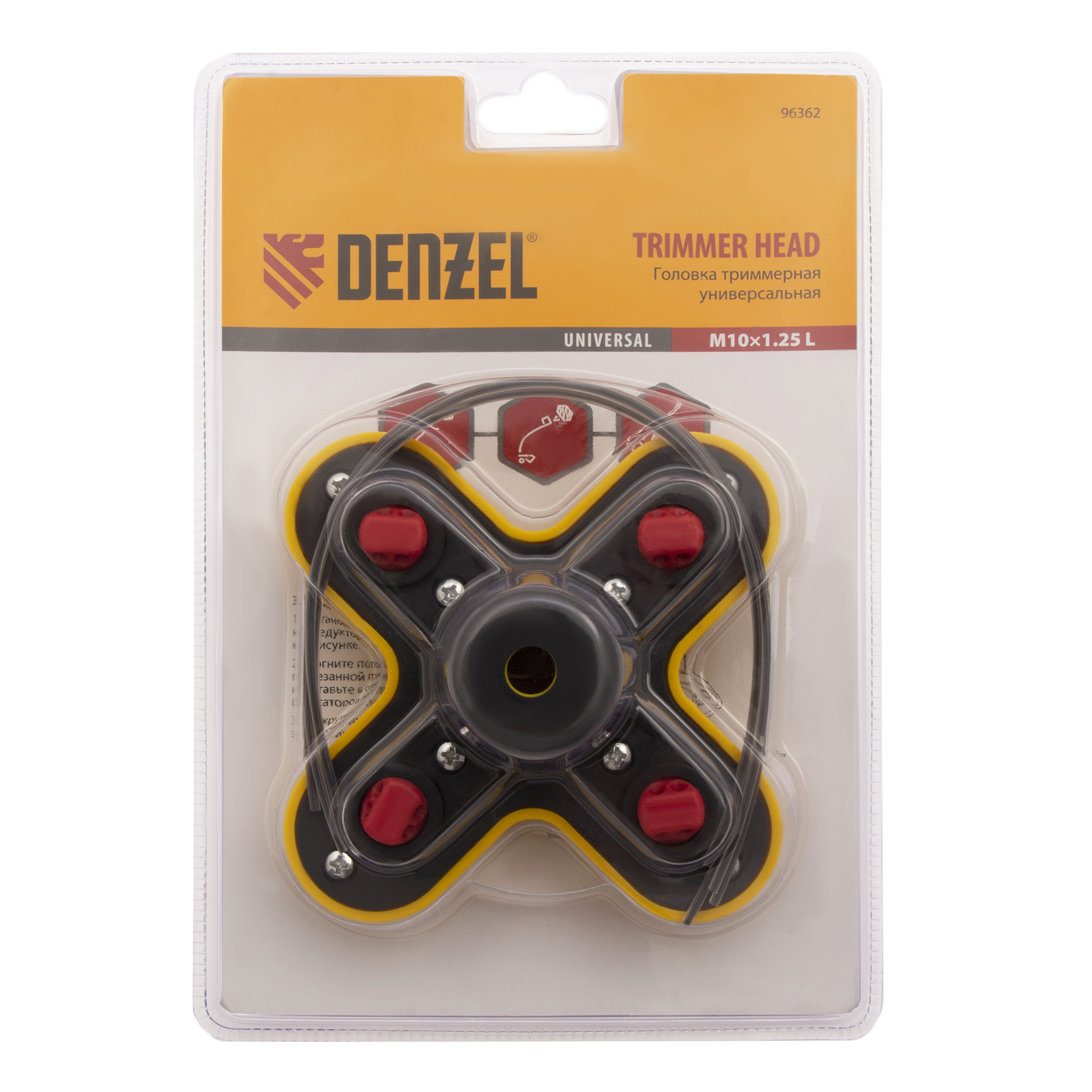 Универсальная триммерная головка Denzel 96362 с закладной гайкой М10 х 1,25 с левой резьбой подходит к большинству моделей электро- и бензокос. Заправляется режущей леской толщиной до 3 мм, поэтому эффективна как для подравнивания газона, так и для скашивания высоких зарослей травы.