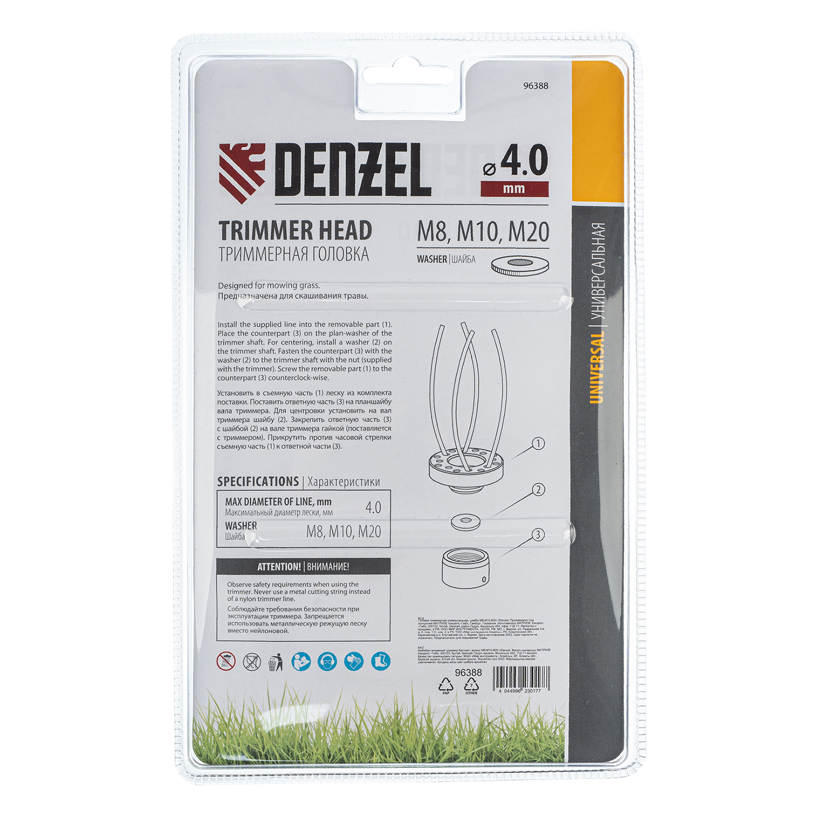 Универсальная триммерная головка Denzel 96388, в комплекте с шайбами M8, M10, M20, предназначена для установки на электро- и бензотриммеры. Позволяет ухаживать за газоном и эффективно бороться с сорняками. Подходит для работы на местности со сложным рельефом. Используется для ухода за растительностью на дачном участке.