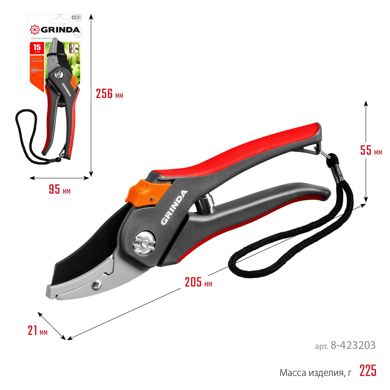 Все секаторы GRINDA являются прочными, долговечными и удобными изделиями, обеспечивая комфортный и лёгкий рез. Они выполнены из высококачественных материалов гарантирующих долгий срок эксплуатации.