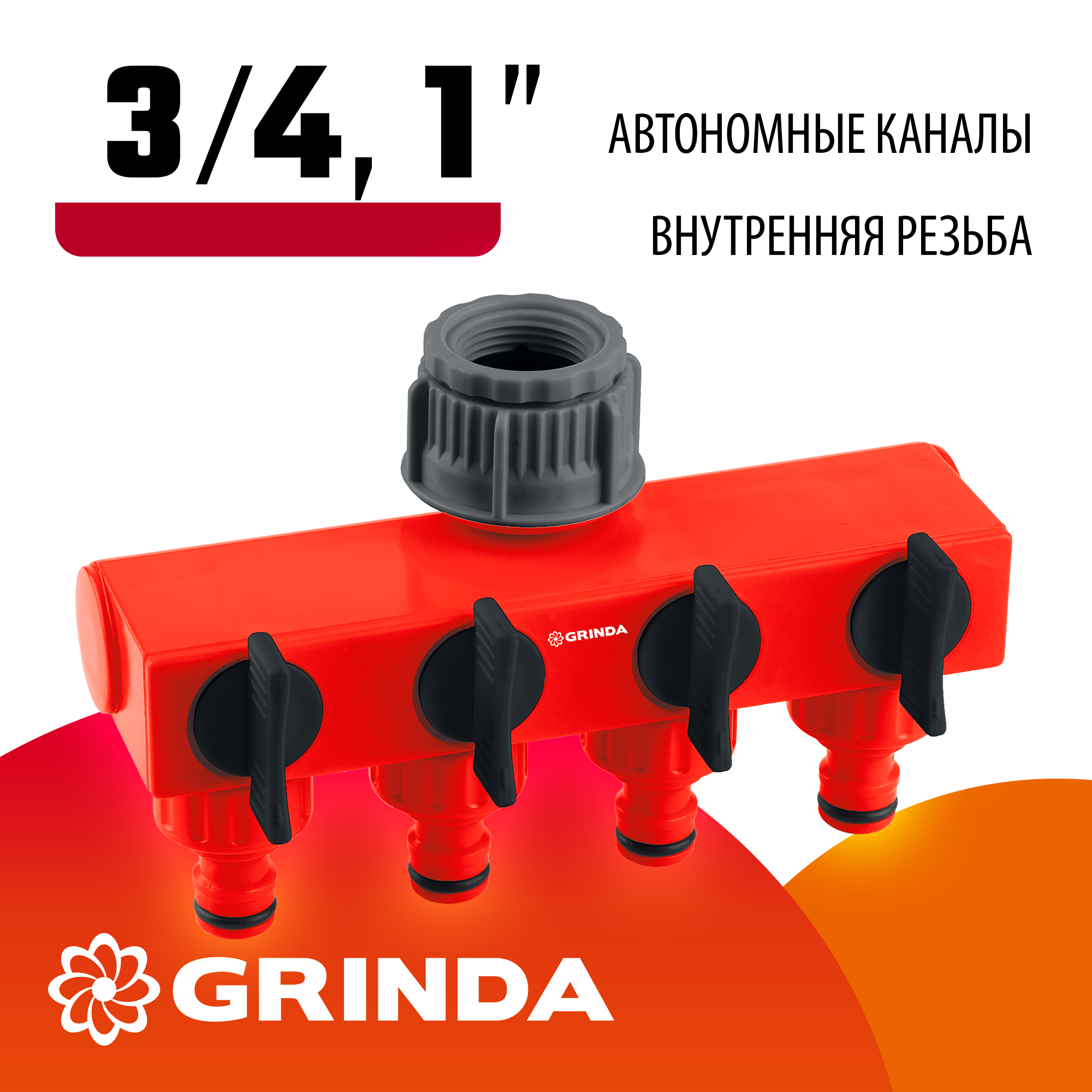 Применяется для одновременного подключения четырех водозаборных линий к водопроводной трубе или крану с внешней резьбой 3/4″ или 1”.
