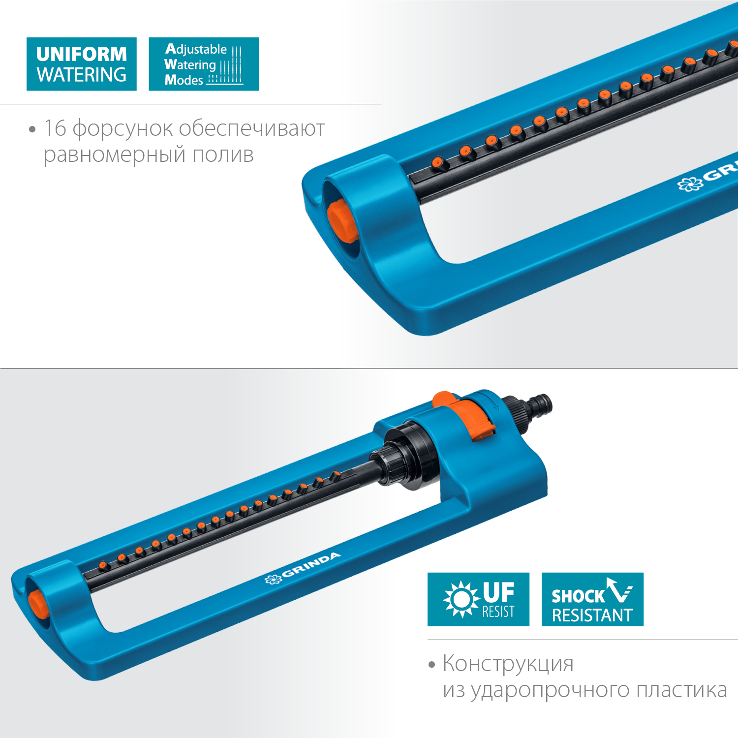 - -16 форсунок обеспечивают равномерный, настраиваемый полив без образования луж.,