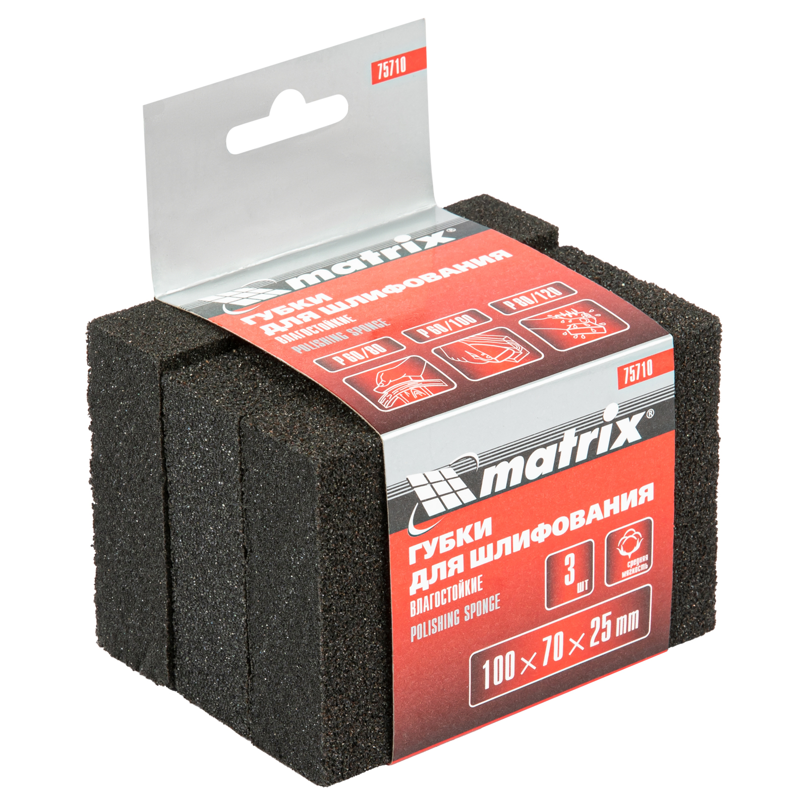 Губка для шлифования средней жесткости Matrix 75710 размером 100 х 70 х 25 мм, входит в набор из 3 губок. Каждая из губок покрыта абразивом с 4-х сторон, при этом с двух сторон имеет разную зернистость — P 60/80, P 60/100, P 80/120. Они используются для черновой и чистовой шлифовки деревянных, пластиковых, металлических, шпаклеванных поверхностей, удаления слоя краски и ржавчины. Абразивные губки пригодятся для проведения строительных, ремонтных, кузовных работ, будут полезны в изготовлении мебели и в быту.