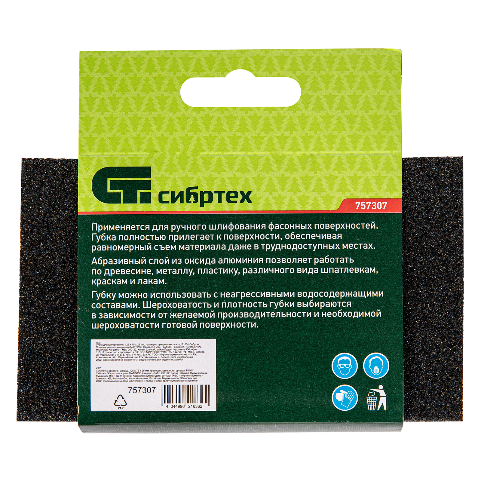 Средней жесткости губка для шлифования Сибртех 757307 P 100, 125 x 75 x 25 мм, трапеция, используется для ручной обработки дерева, пластика, металла. Благодаря размерам зерна 400-500 мкм она эффективно удаляет краску, ржавчину, грубые неровности. Применяется при отделочных работах, кузовном ремонте, изготовлении мебели.