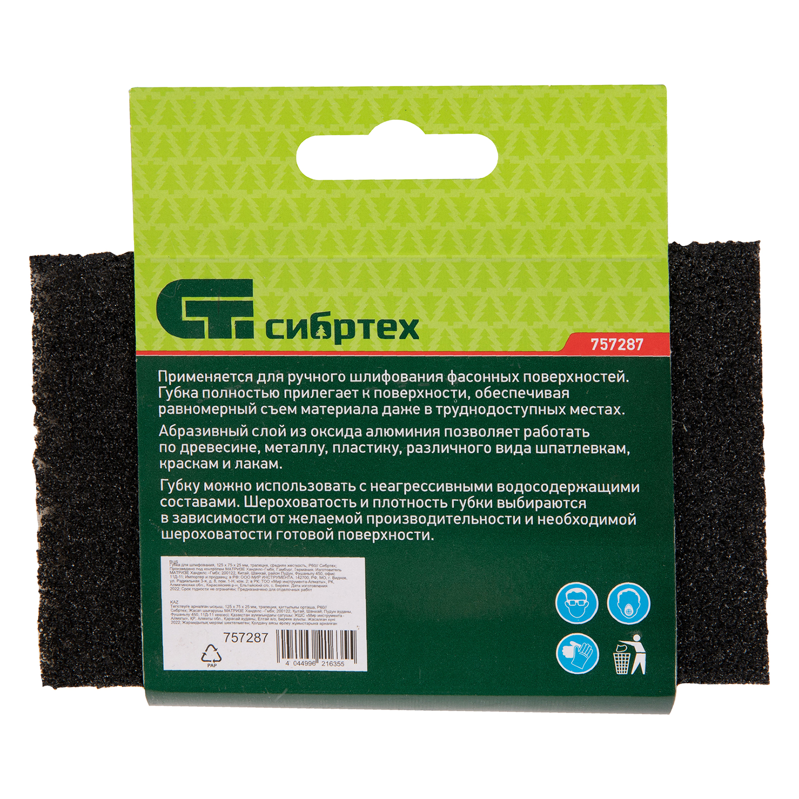 Средней жесткости губка для шлифования Сибртех 757287 P 60, 125 x 75 x 25 мм, трапеция, используется для ручной обработки дерева, пластика, металла. Благодаря размерам зерна 400-500 мкм она эффективно удаляет краску, ржавчину, грубые неровности. Применяется при отделочных работах, кузовном ремонте, изготовлении мебели.