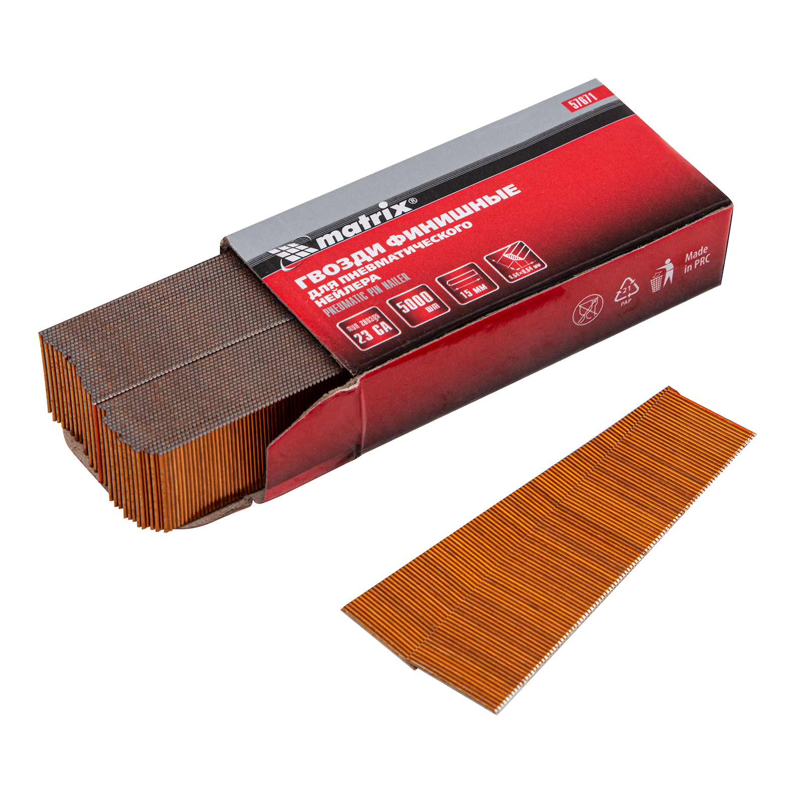 Гвозди финишные (шпильки) Matrix 23GA 57671 диаметром 0,64 мм и длиной 15 мм, 5000 шт., подойдут для работы с пневматическим нейлером любой торговой марки. Используются для быстрого и точного скрепления тонких деревянных материалов и конструирования декоративных элементов.
