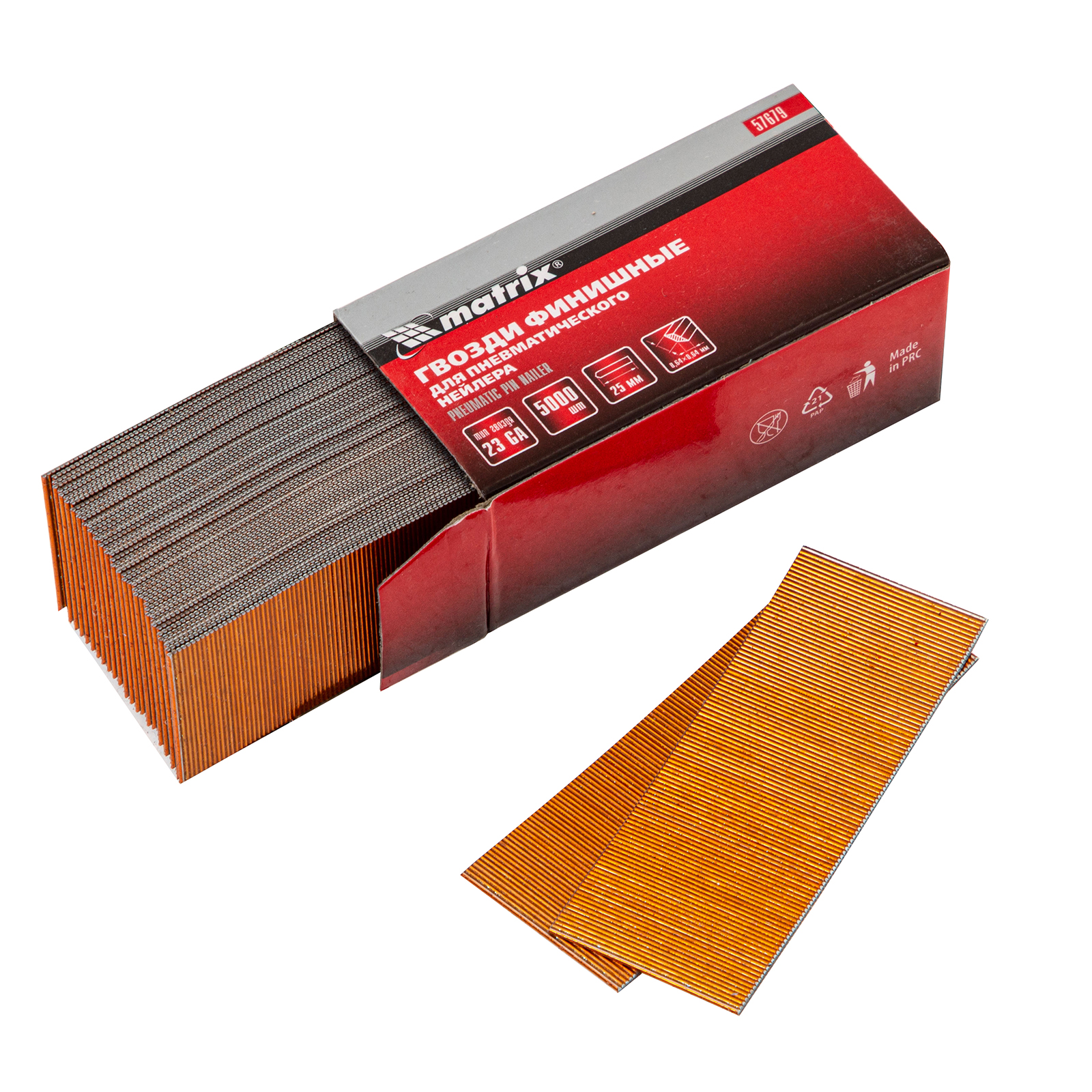 Гвозди финишные (шпильки) Matrix 23GA 57679 длиной 25 мм и диаметром 0,64 мм, 5000 шт., — идеальное решение для таких задач, как надежная, но максимально скрытая фиксация деревянных поверхностей. Шпильки подходят для работы с пневматическим нейлером любой торговой марки и применяются в ремонте, строительстве и монтаже. Они подходят для скрепления различных материалов к деревянным листам, создания мягкой мебели и декоративных предметов интерьера. Оснастку можно сочетать с клеем чтобы обеспечить наиболее прочную фиксацию.