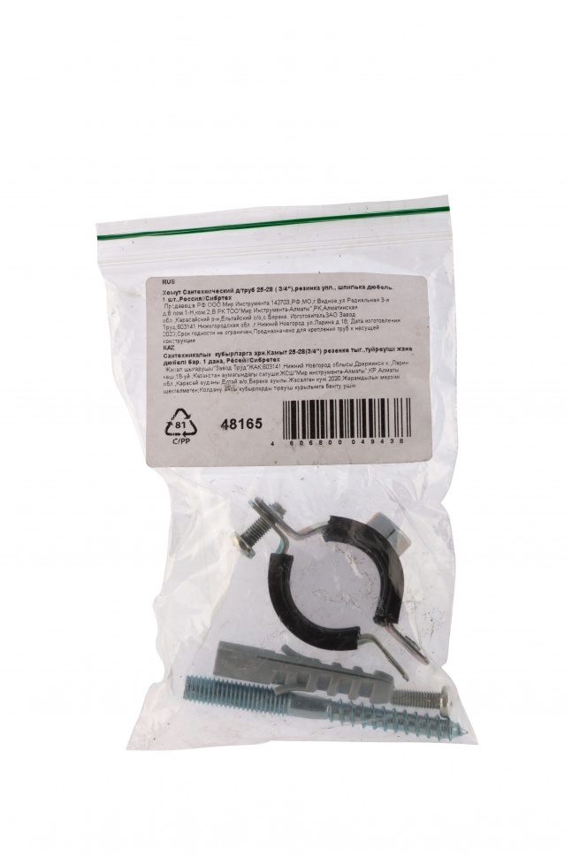 Сантехнический хомут для труб Сибртех 48165 с резиновым уплотнением, шпилькой и дюбелем, 1 шт. в упаковке, служит для крепления труб диаметром 25-28 мм (3/4"), может применяться для фиксации жестких, гибких воздуховодов круглого и прямоугольного сечения. Используется для монтажа водопроводных и отопительных систем, позволяет надежно закрепить трубу на стене или другом основании. Резиновые прокладки исключают риск повреждения трубы.