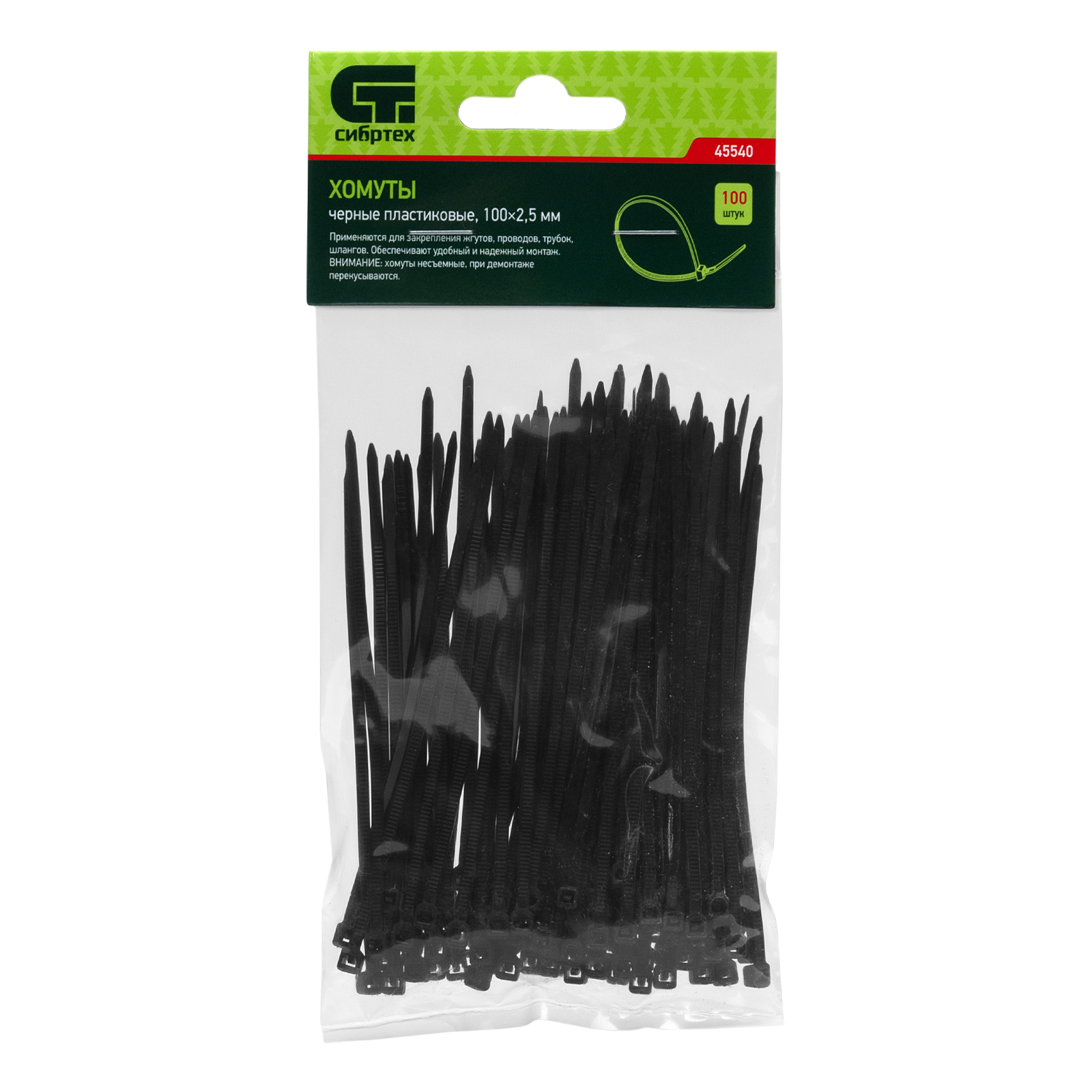 <p>Черные пластиковые хомуты Сибртех 45540, 100 х 2,5 мм, 100 шт. в упаковке, используются для стяжки кабелей, закрепления трубок, шлангов, рекламных конструкций, а также для упаковки различных предметов. Пригодятся во время прокладки электрических и локальных вычислительных сетей, ремонта компьютерной техники, оформлении торговых стендов, комплектовании товара, будут также полезны дома, на даче и в гараже.</p><h2>Преимущества</h2><ul><li>Надежные соединения — кабельные стяжки изготовлены из прочного нейлона.</li><li>Возможность проведения наружных работ — хомуты устойчивы к ультрафиолету и сохраняют свои свойства при температуре от -35 до +85 ℃.</li><li>100 штук в упаковке — набора хватит надолго.</li></ul>