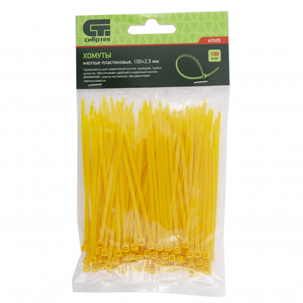 <p>Желтые пластиковые хомуты Сибртех 45505, 100 х 2,5 мм, 100 шт. в упаковке, используются для стяжки кабелей, закрепления трубок, шлангов, рекламных конструкций, а также для упаковки различных предметов. Пригодятся во время прокладки электрических и локальных вычислительных сетей, ремонта компьютерной техники, оформлении торговых стендов, комплектовании товара, будут также полезны дома, на даче и в гараже.</p><h2>Преимущества</h2><ul><li>Надежные соединения — кабельные стяжки изготовлены из прочного нейлона.</li><li>Возможность проведения наружных работ — хомуты устойчивы к ультрафиолету и сохраняют свои свойства при температуре от -35 до +85 ℃.</li><li>100 штук в упаковке — набора хватит надолго.</li></ul>